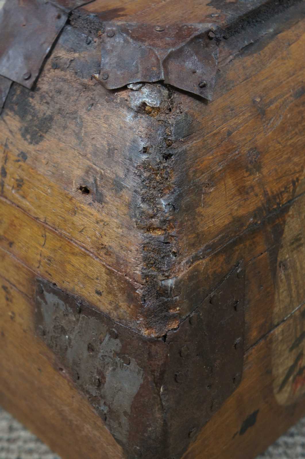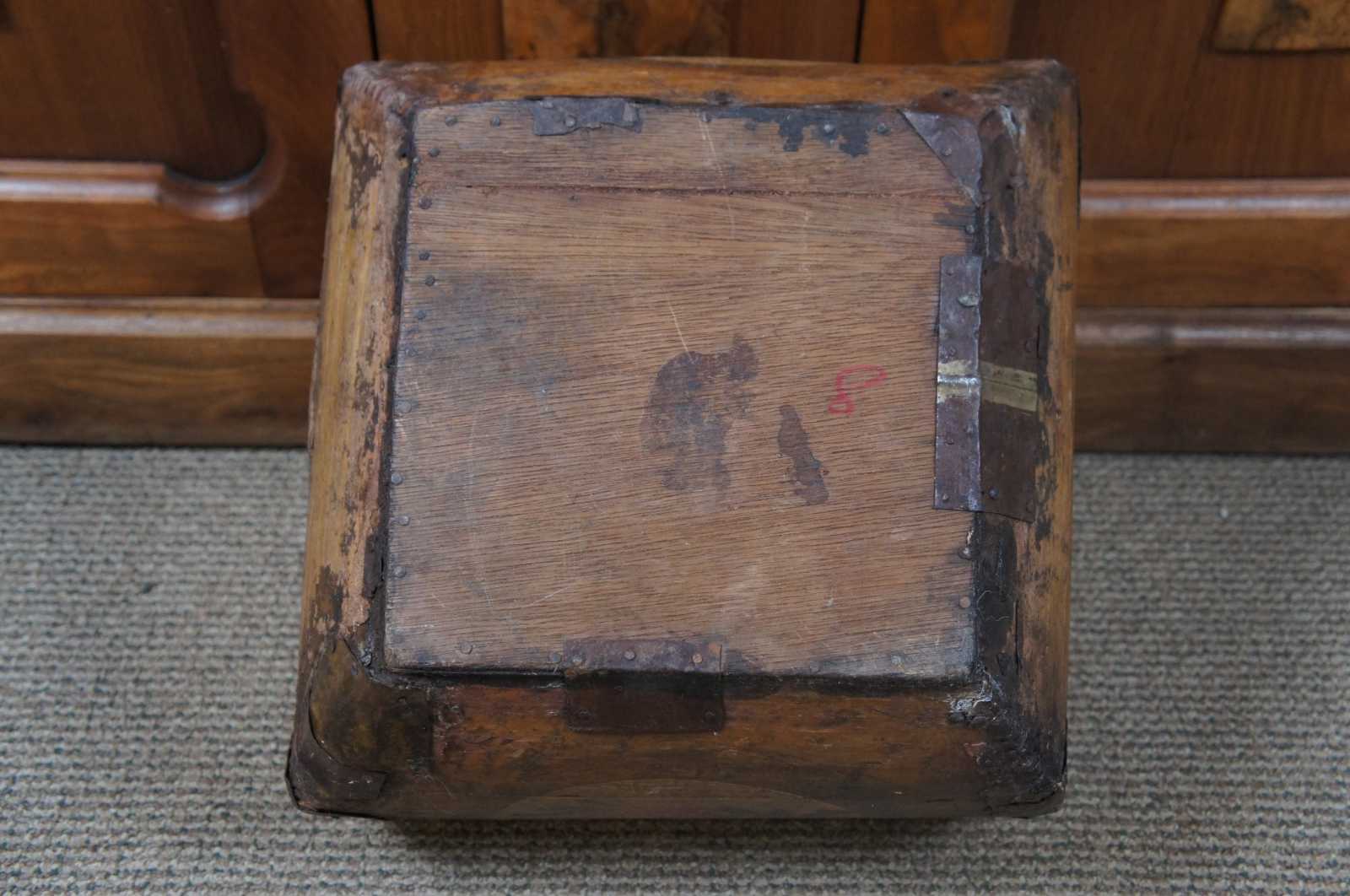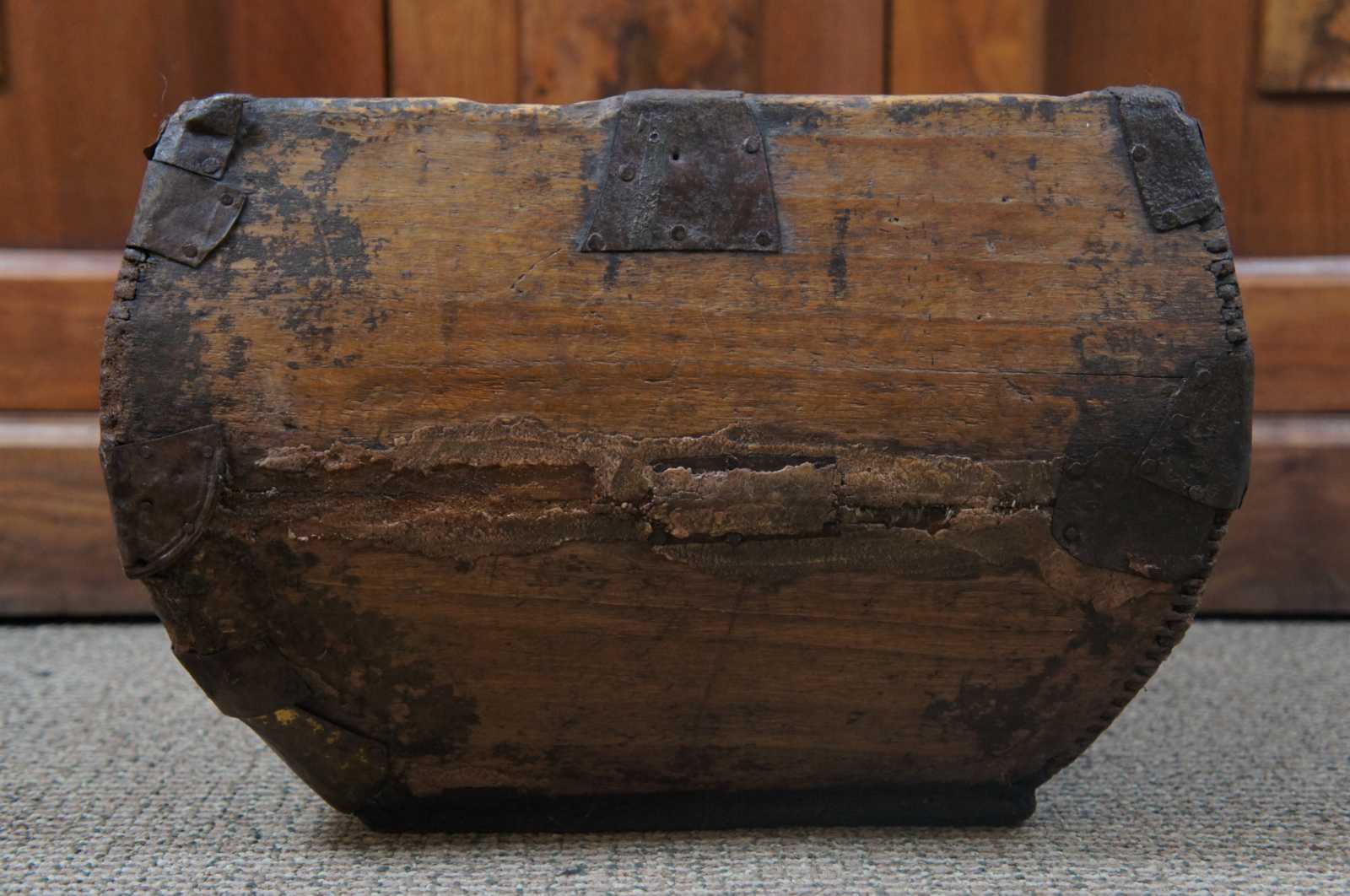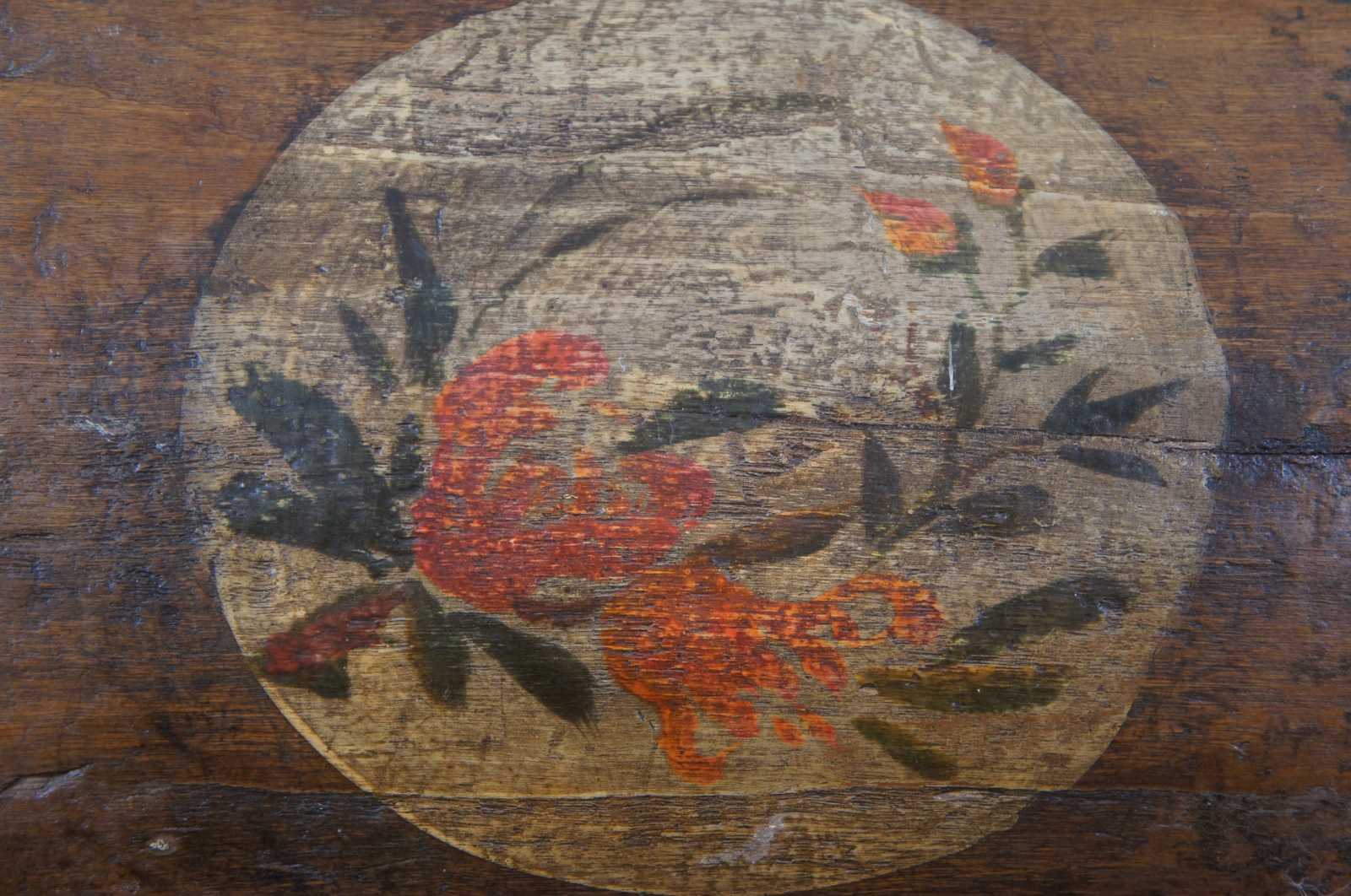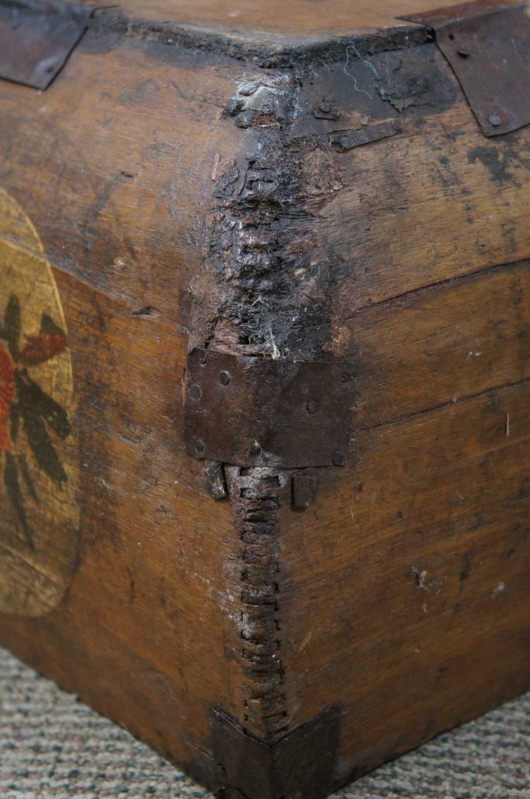 Antique wooden grain or rice measure / harvesting bucket with handle across the middle and primitive iron accents. Two sides are painted with folk art medallions of flowers and tomatoes.
