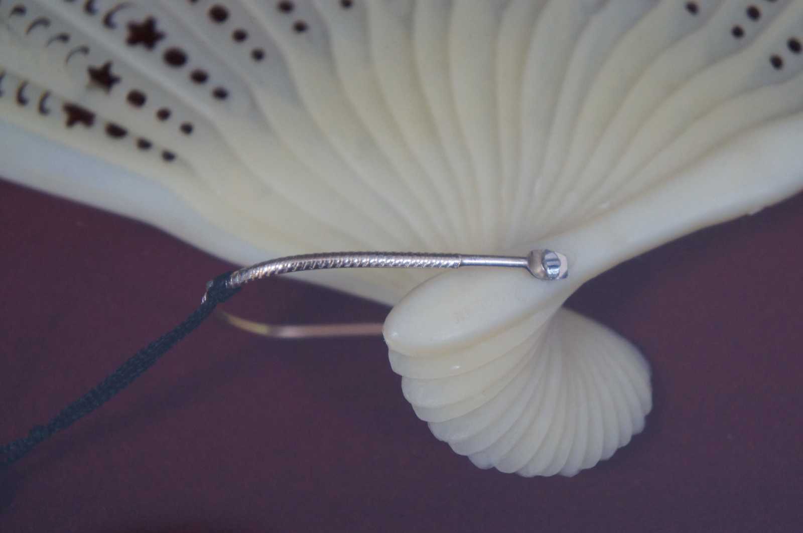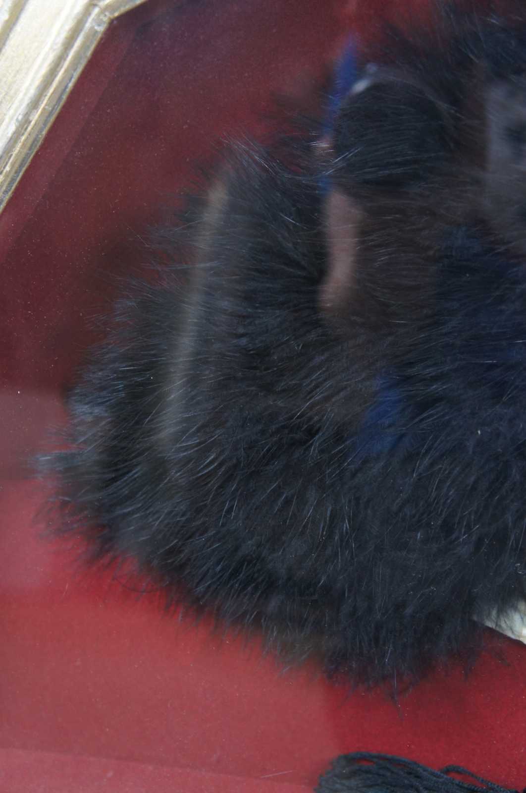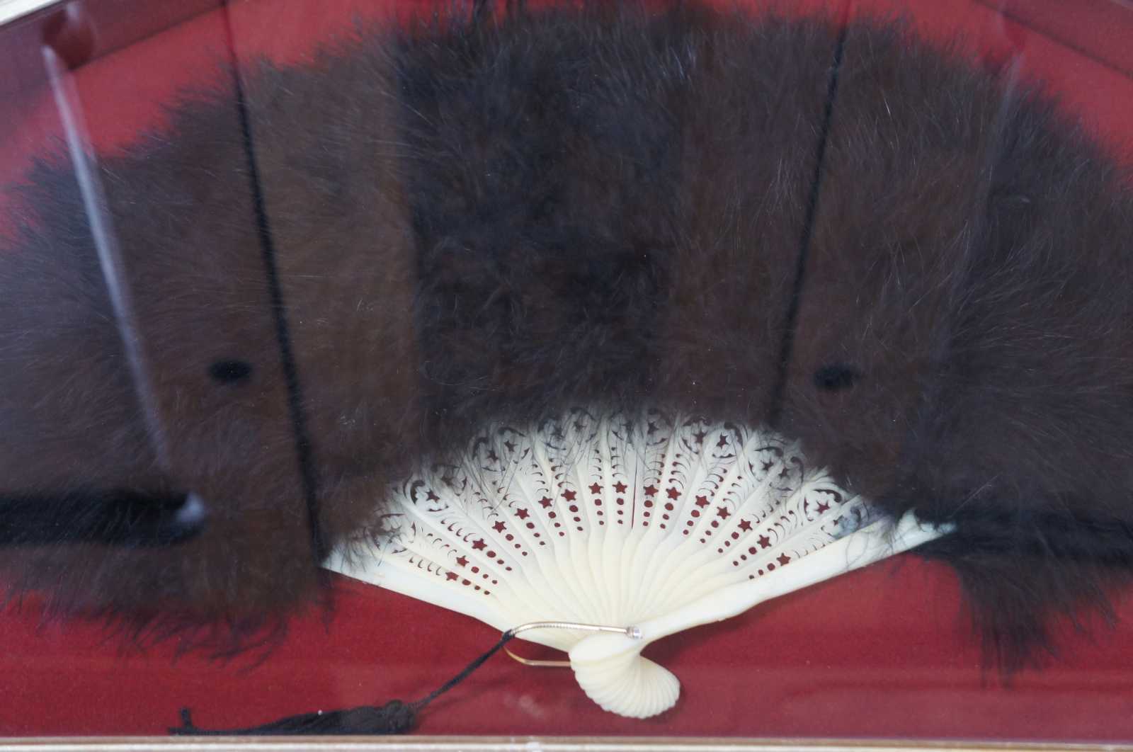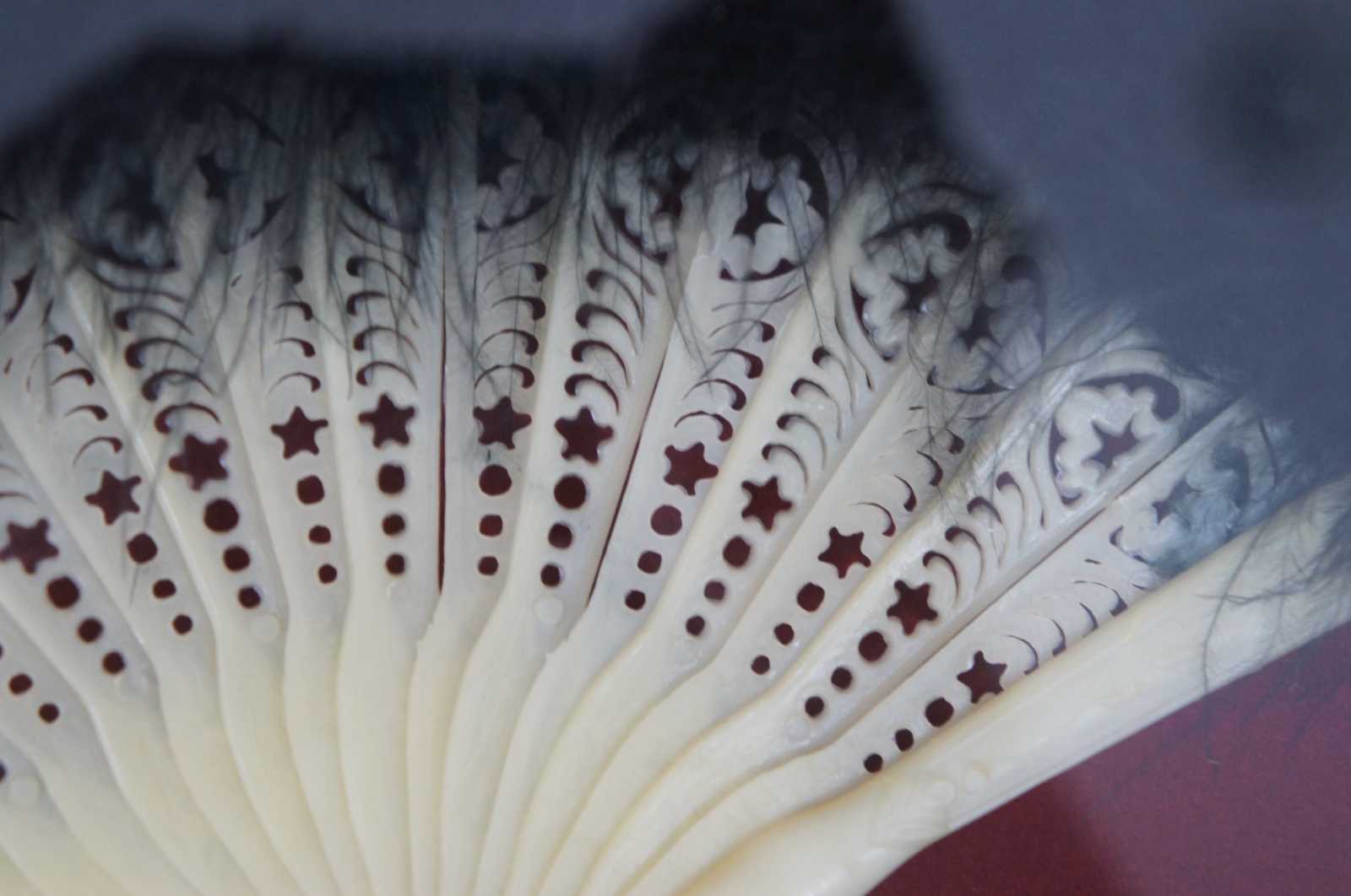 black ostrich feather folding fan with white plastic sticks pierced with stars and floral motifs, framed in a shadowbox on red fabric.