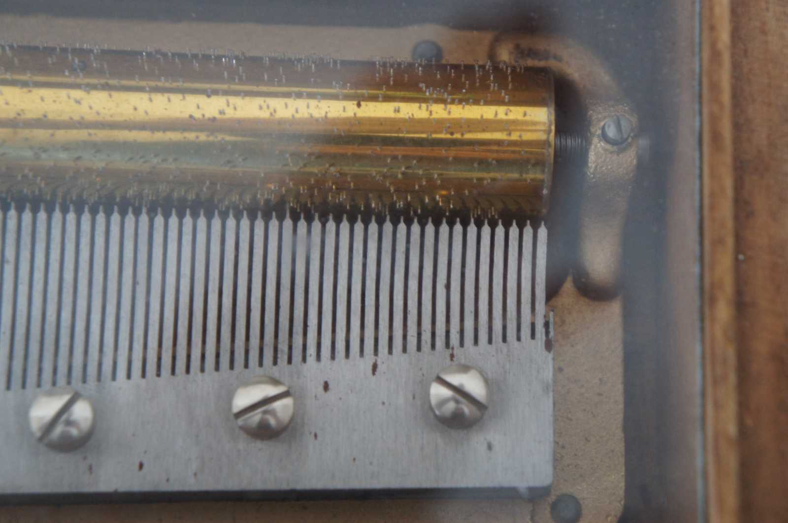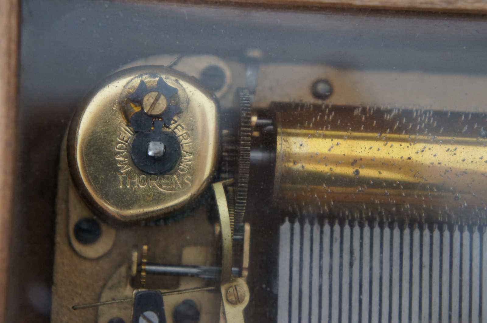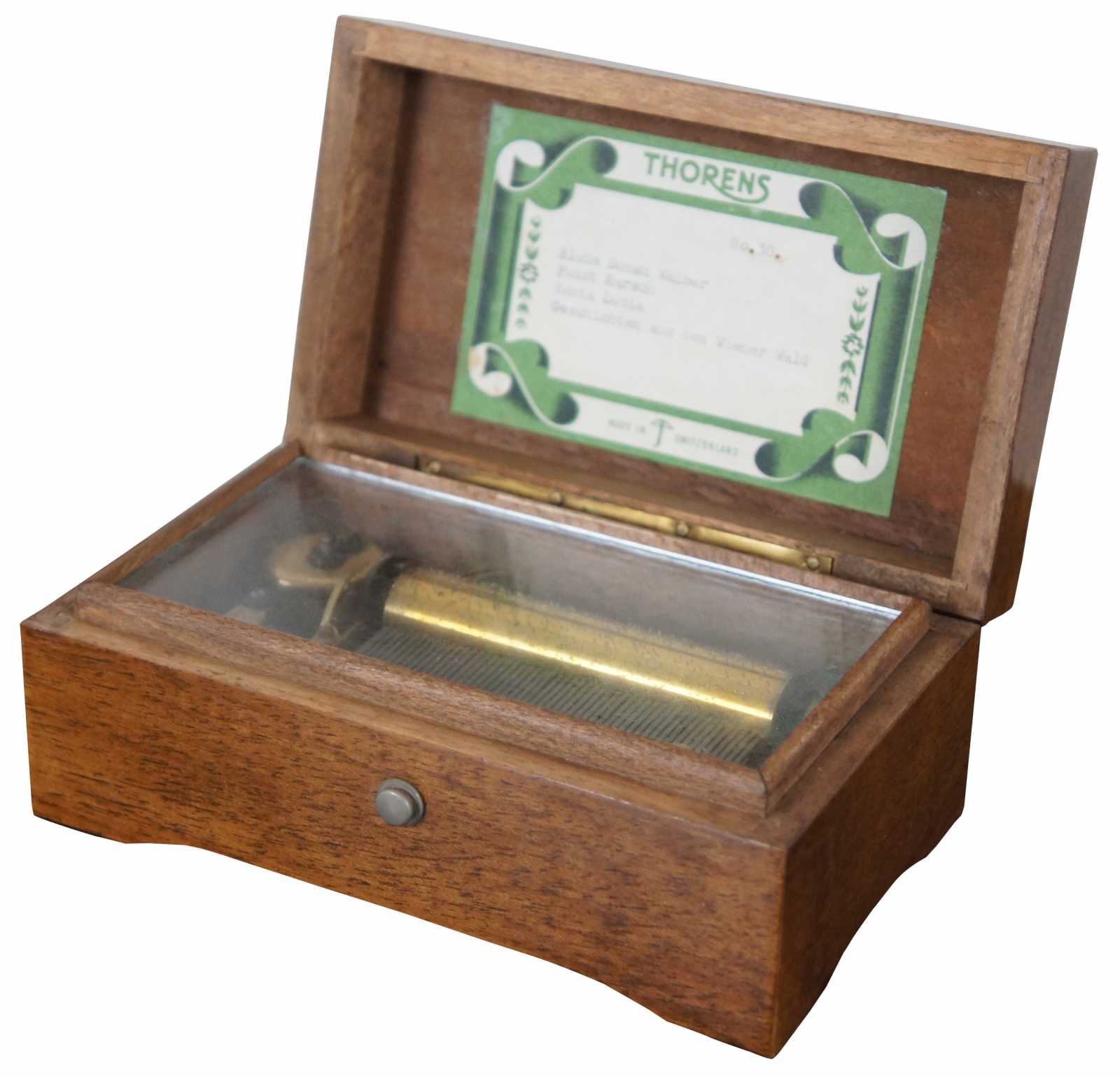 Vintage Thorens walnut music box with shield inlay, plays fifty two notes and four consecutive tunes: Blue Danube Waltz, Faust March, Santa Lucia, and Tales from the Vienna Woods. Made in Switzerland.