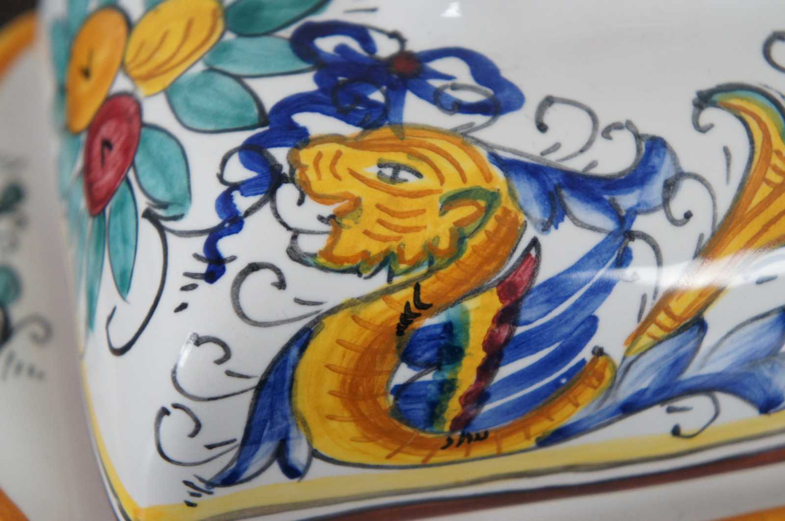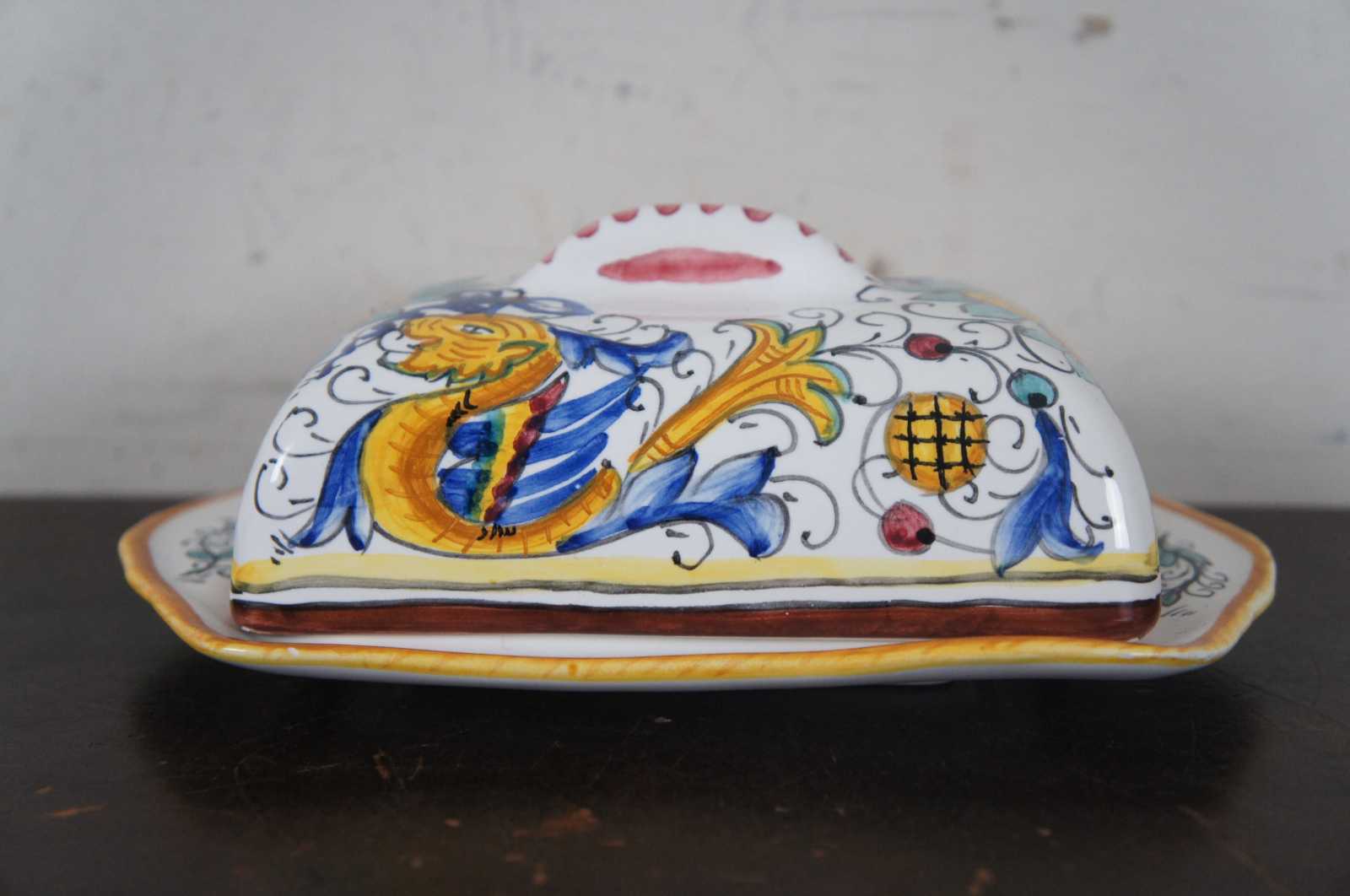 Hand made Deruta Italian pottery covered butter dish with Raffaellesco dragons.“Among the most popular and enduring Italian majolica patterns, the classic “Raffaellesco” traces its origin to 16th century, and the graceful arabesques of Raphael's famous frescoes.