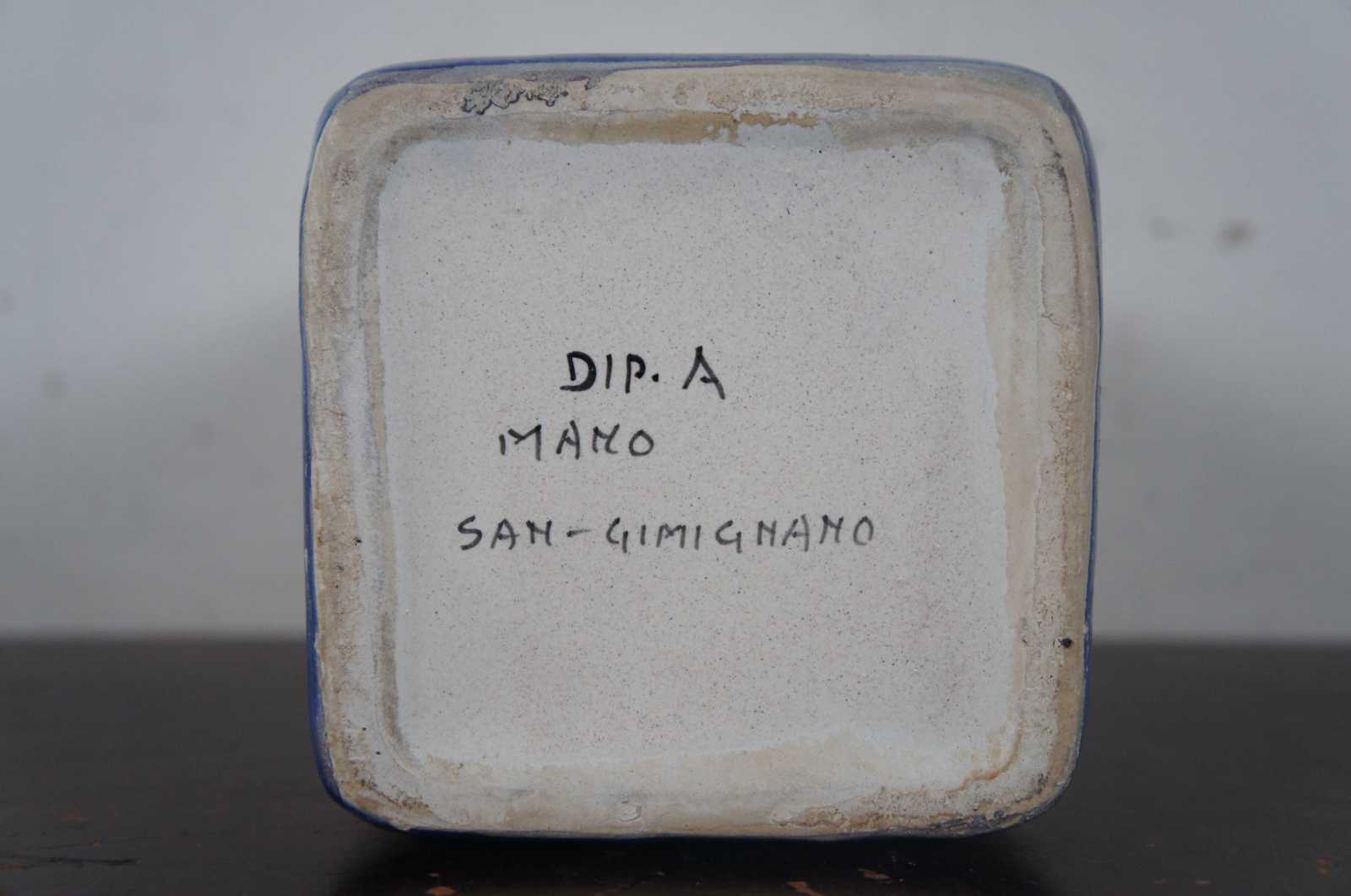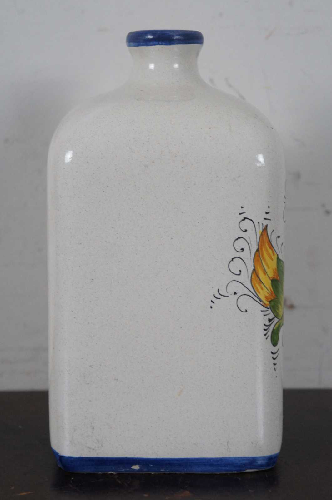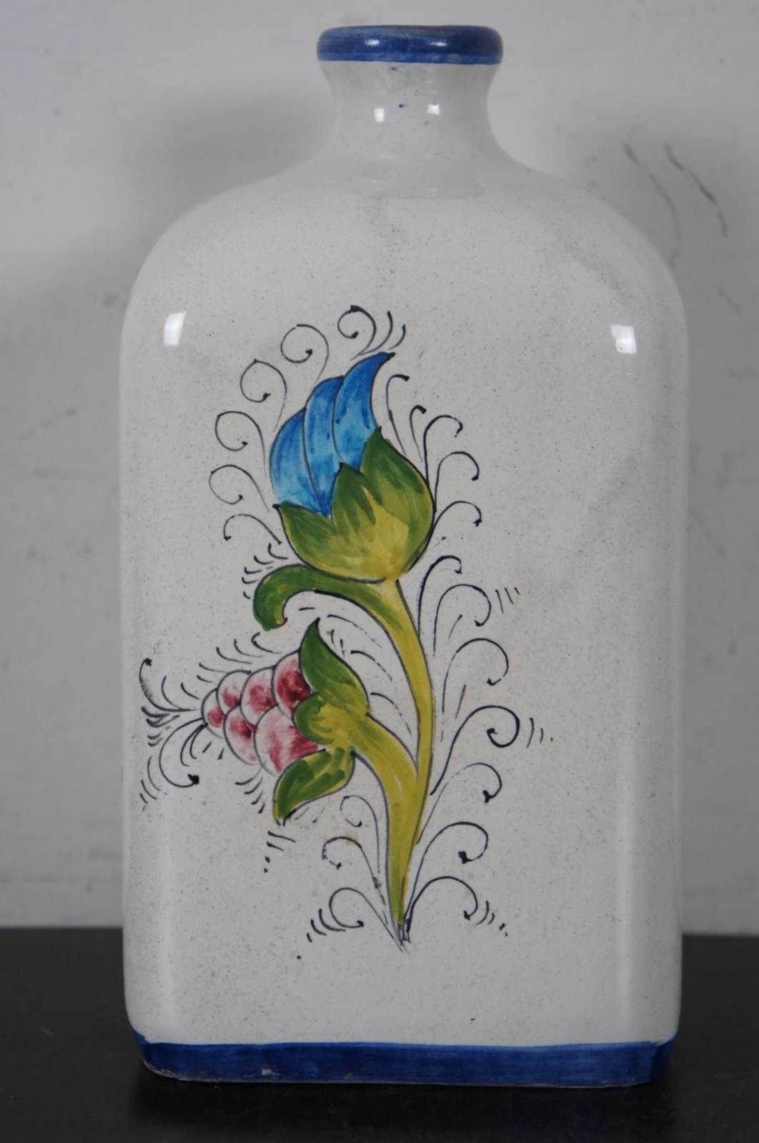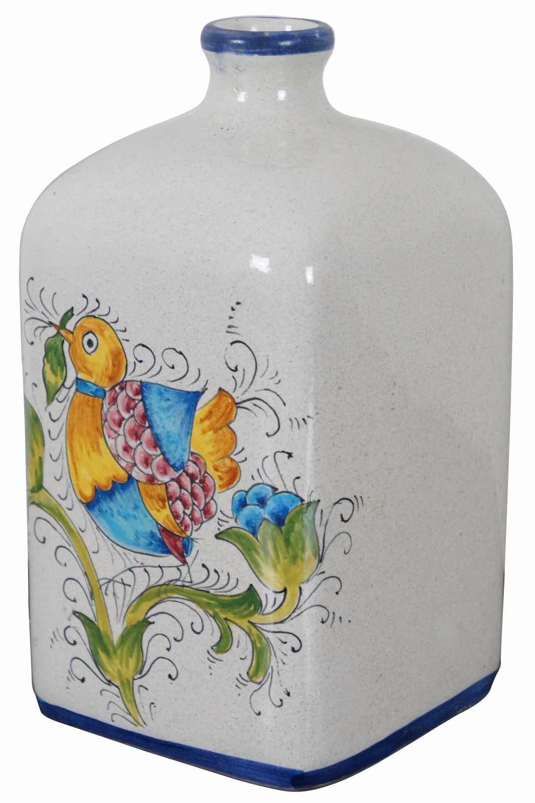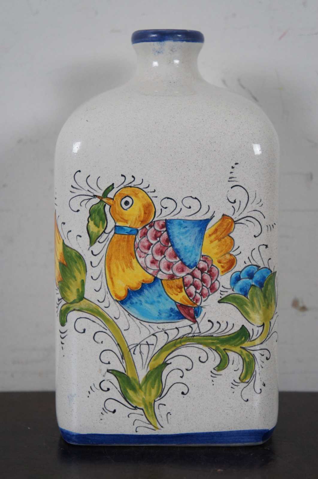 Vintage hand painted ceramic bottle made in San Gimignano, Italy, painted with flowers and a bird in the shape of a vase, pharmacy bottle or jug.