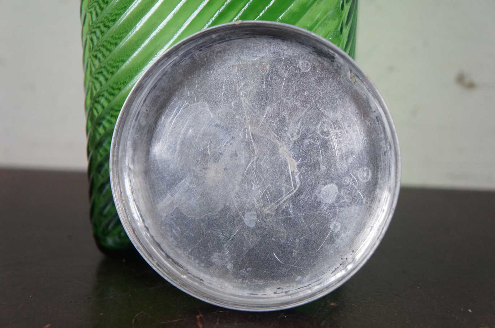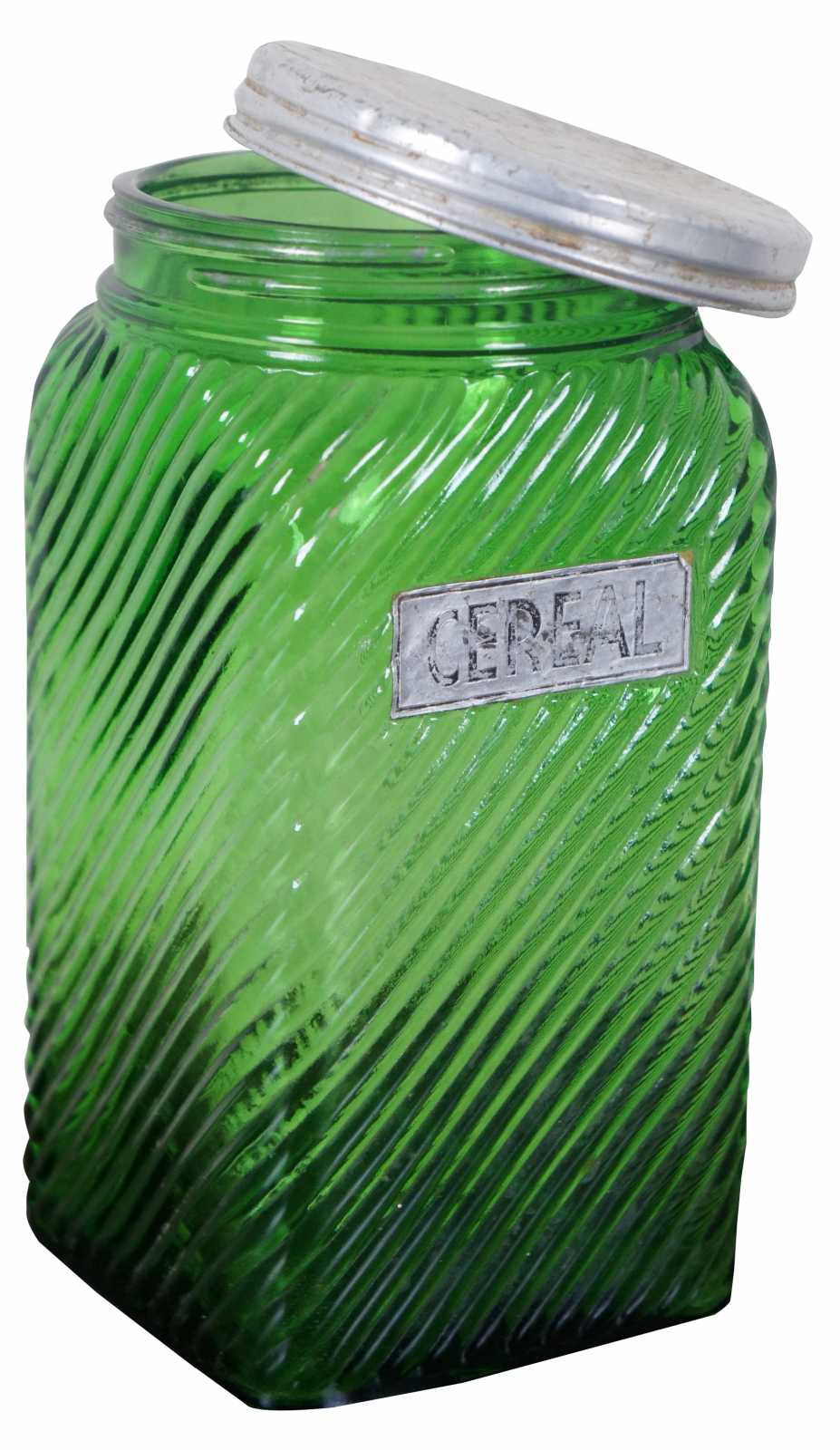 Antique Owens-Illinois green glass canister with diagonal ribs, Cereal label and metal screw top lid.