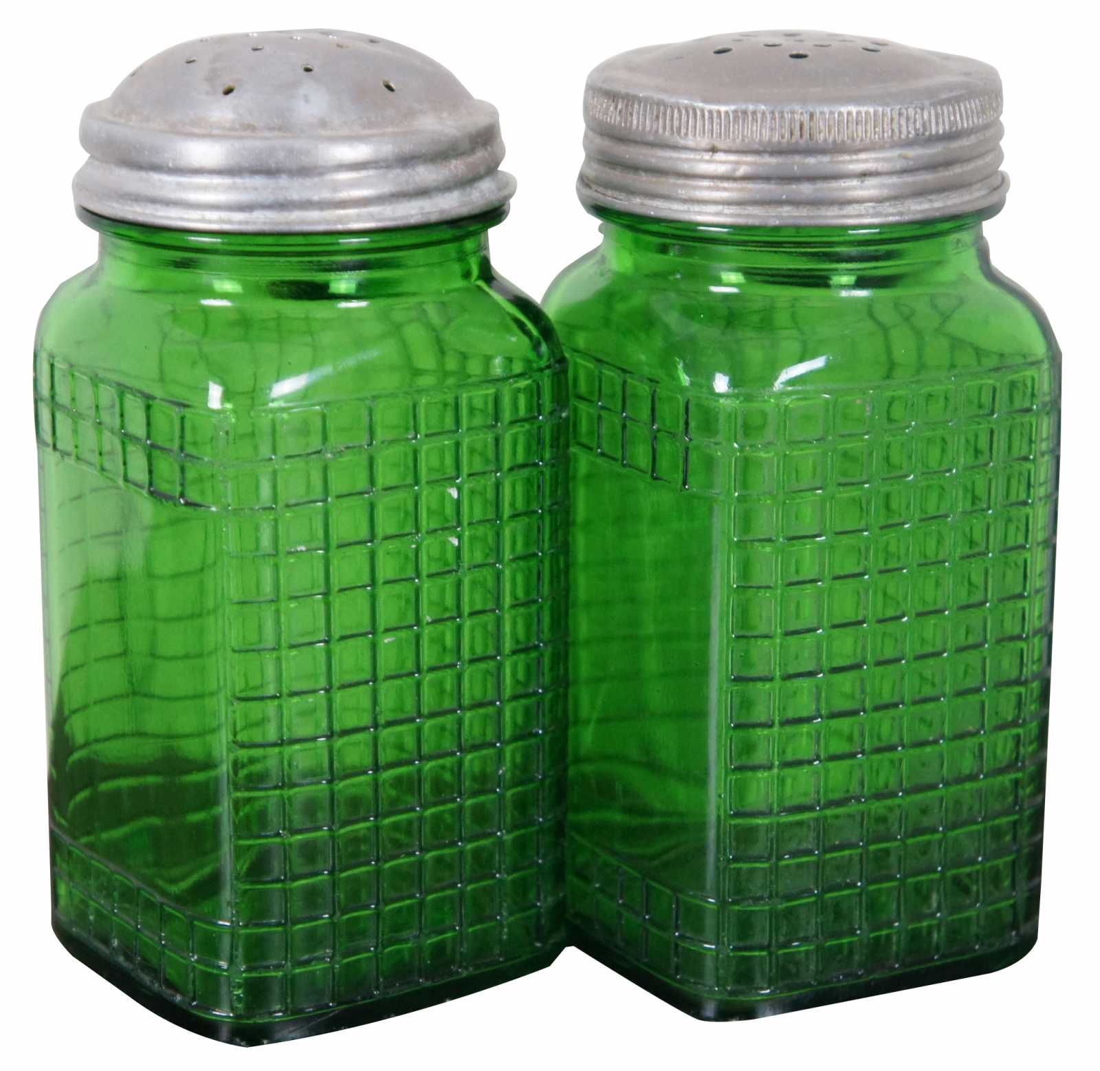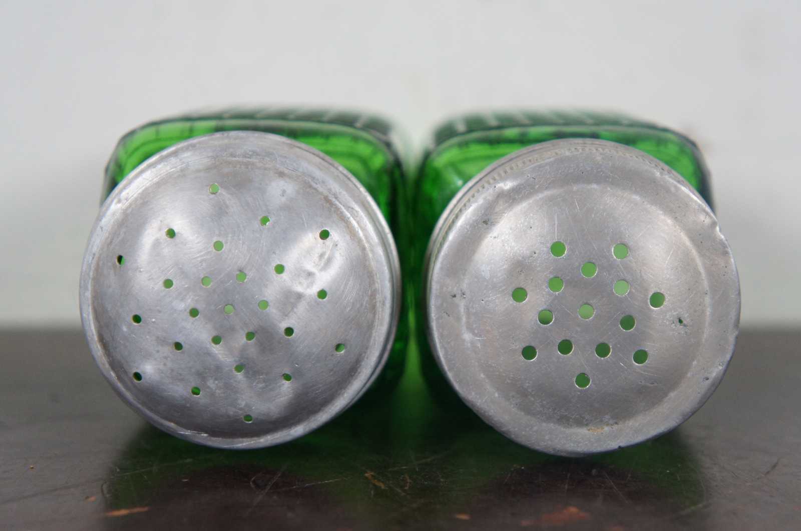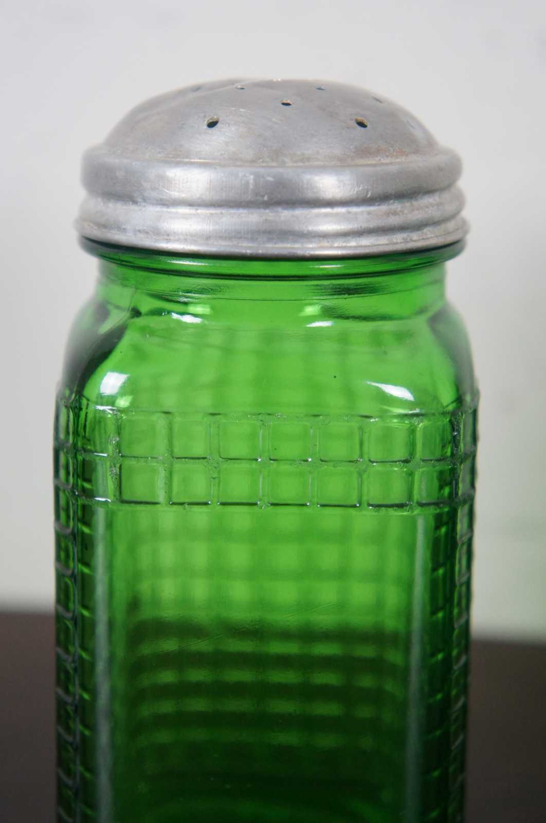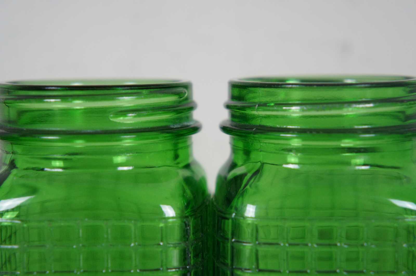 Antique Owens-Illinois green glass miniature canisters with shaker lids and a checkered texture, with flat space for a label.