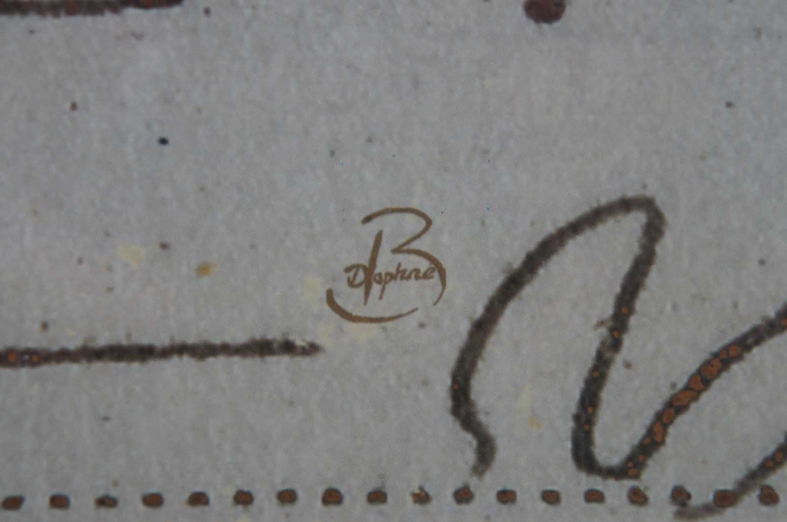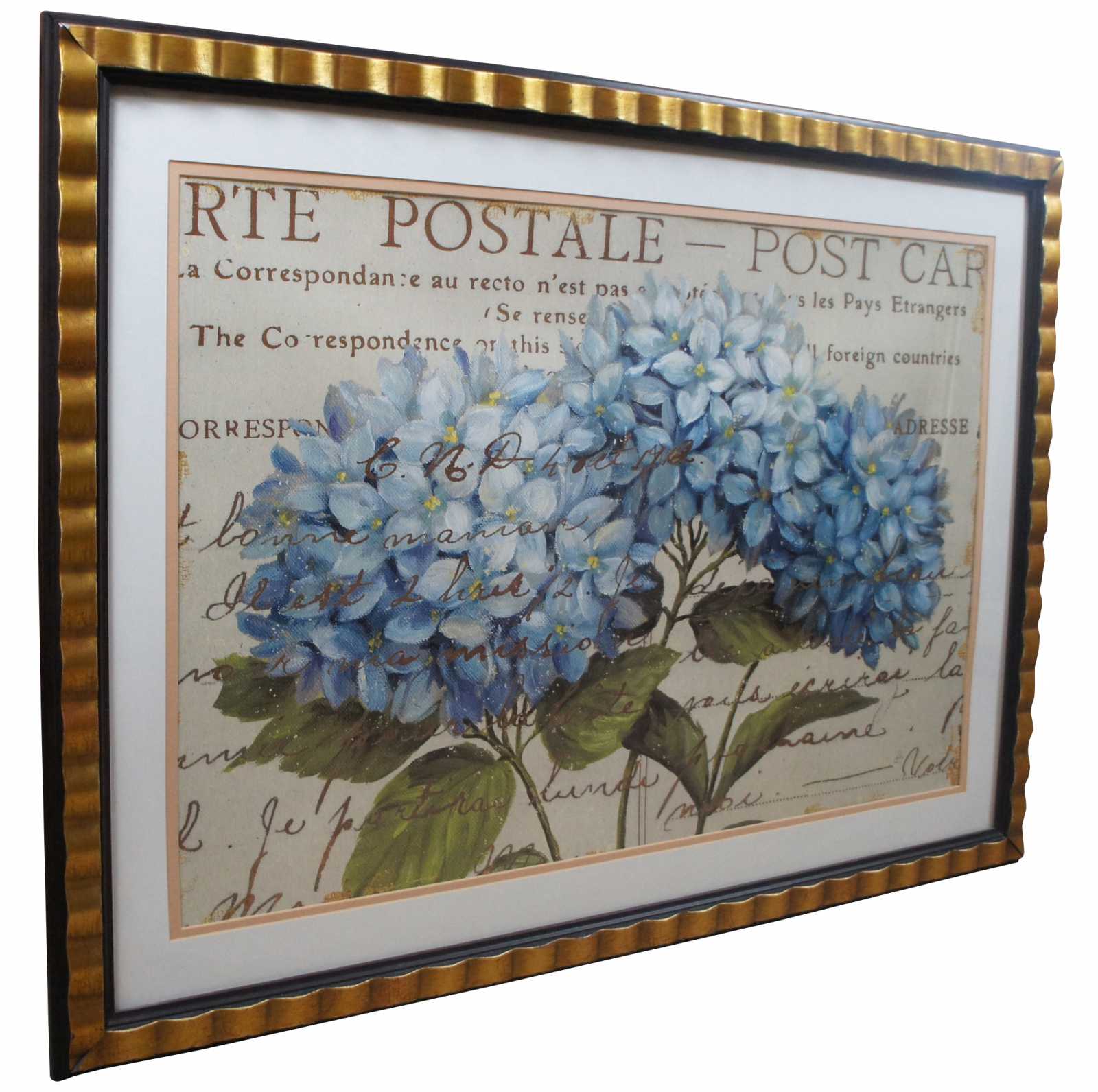 Framed print by Daphne Brissonnet titled “Thinking of You III,” featuring a nosegay of forget-me-nots on a background of a vintage French postcard. “Daphne Brissonnet has always been drawn to the beauty of nature. Her early studies in botany opened her eyes to the form, dimension and subtle colors of her natural subjects. As she discovered a universe of unexpected beauty in the flowers and plants she studied, painting these subjects became an important part of her life, while revealing her talents as an artist. Primarily self-taught, Daphne continues to refine her skills by attending workshops in France and the U.S. as well as closer to her home in Canada.”