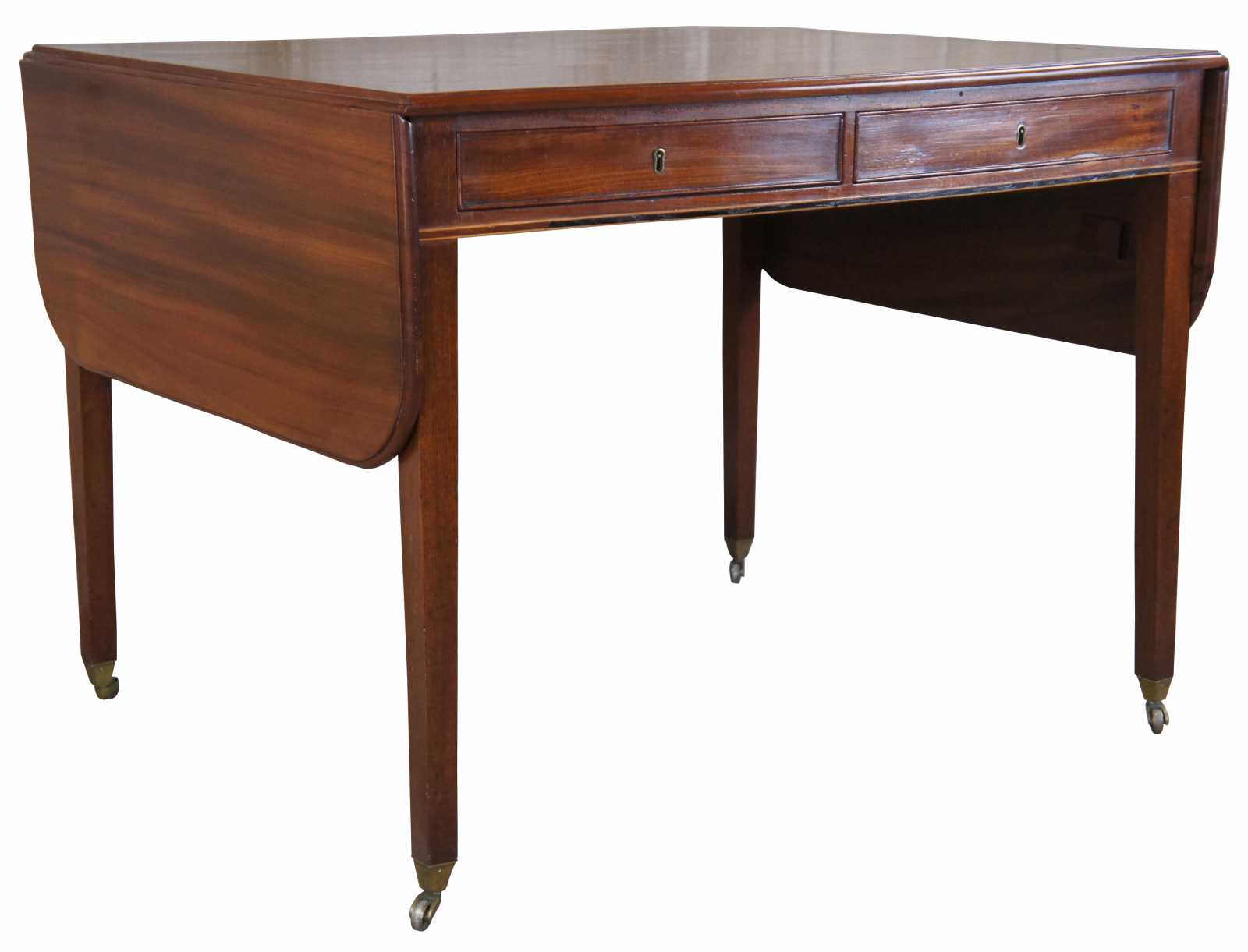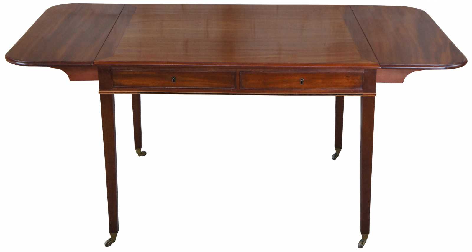 An exquisite 19th century sheraton drop leaf table. Made from mahogany with a rectangular form top featuring hand dovetailed drawers along each side, inlaid trim and square tapered legs leading to casters. Its unqiue size allows it to be used as a desk. Includes key for safekeeping.