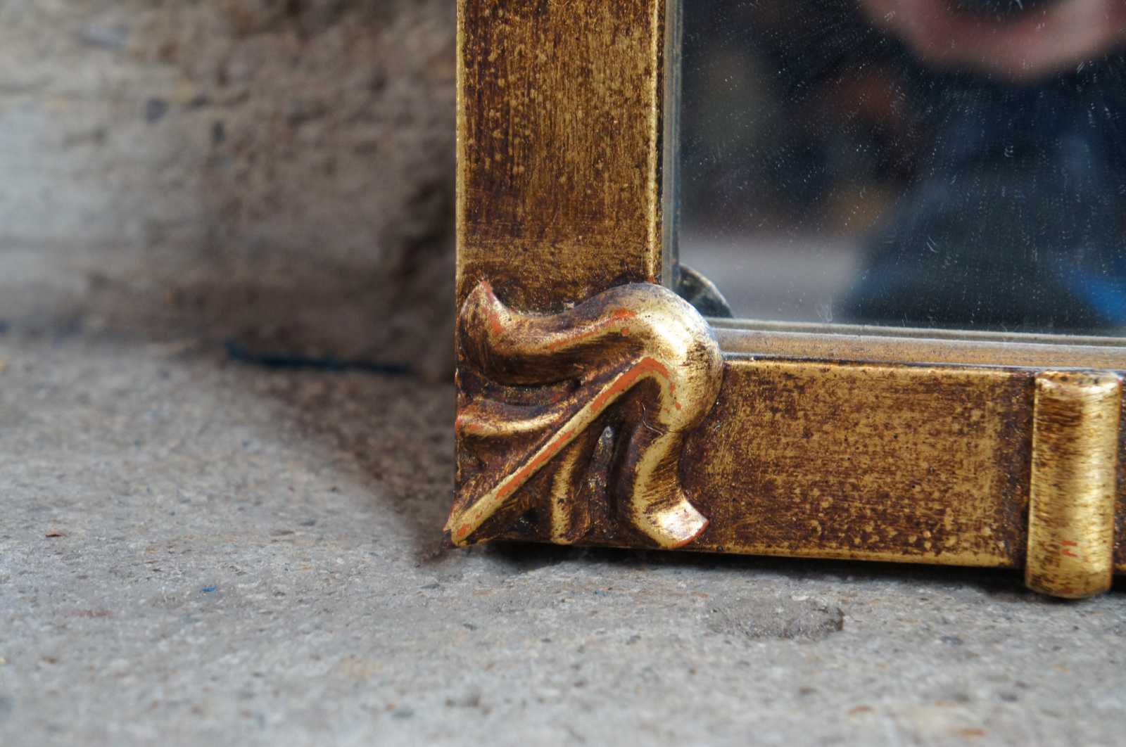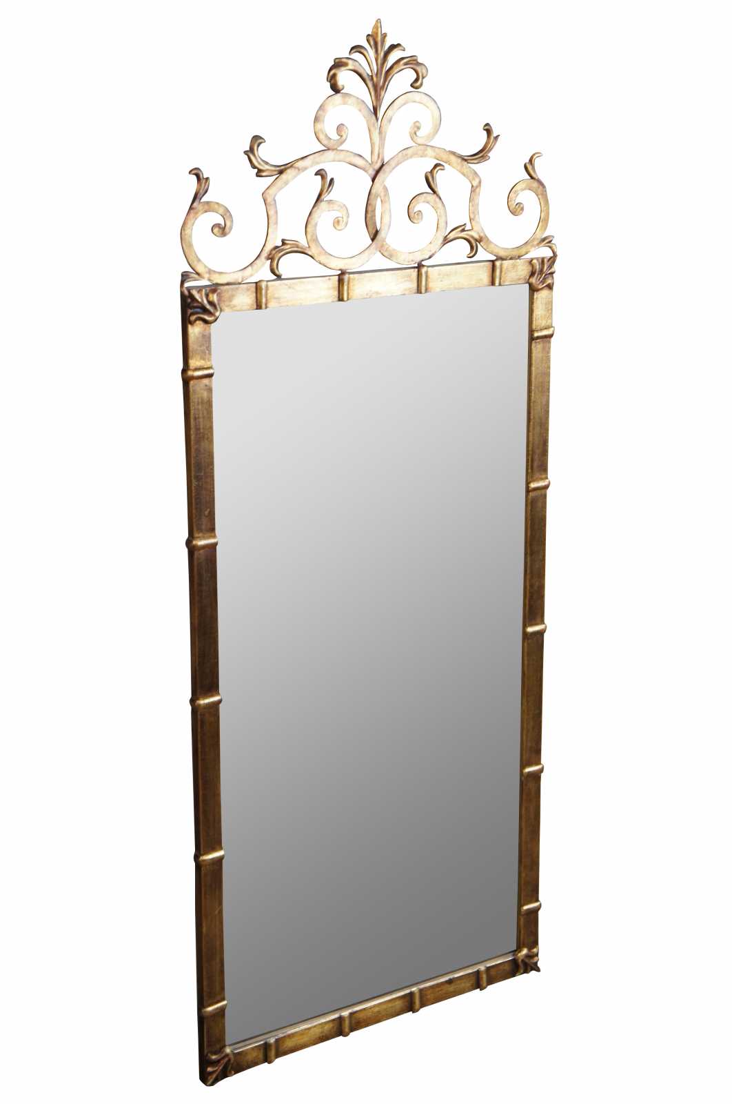 Circa 1960s Palladio Italian wall mirror in the manner of Rococo or Regency styling. Made from metal with an intermittent ribbed design along the frame and interlaced scrolling crown. Features an acanthus topper that is matched by fleur de lis leaves on each corner of the frame.