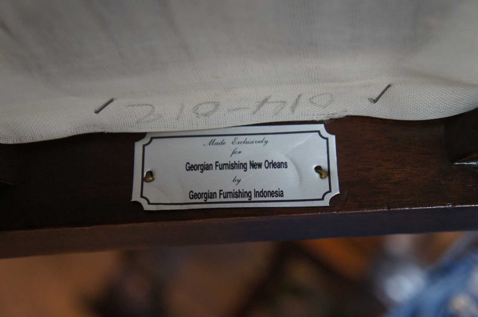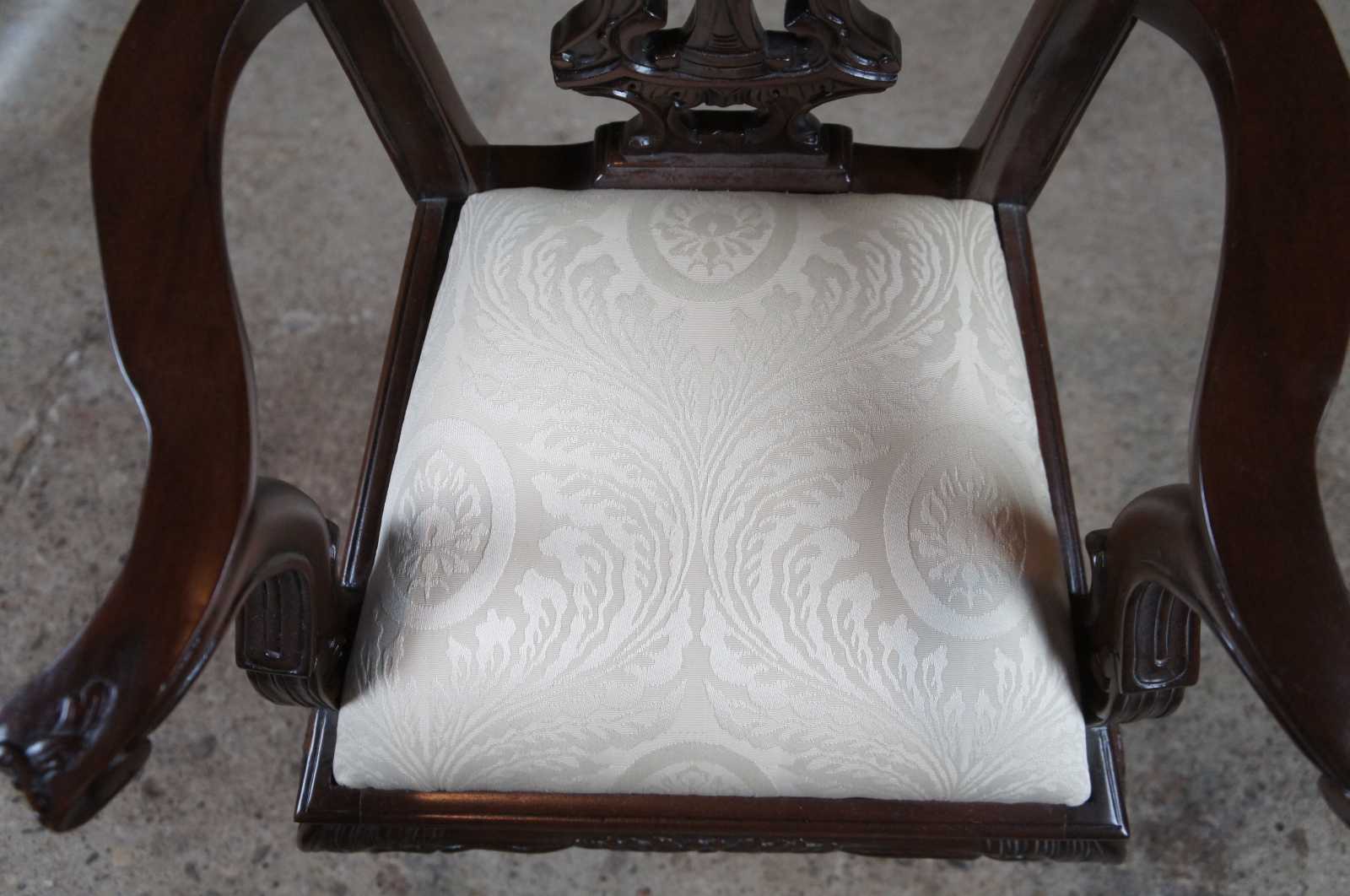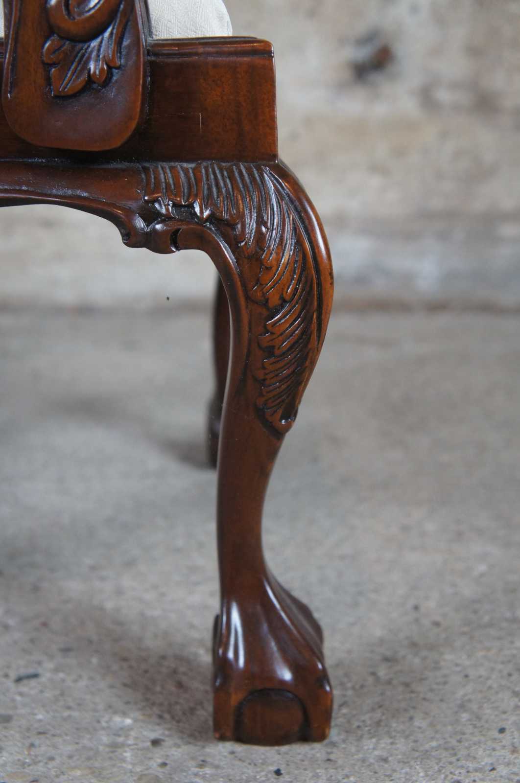 Late 20th century chippendale child or dolls chair. Made exclusively for Georgian Furnishing Co., LTD. in New Orleans, LA. Made from Mahogany with an intricately carved crest and rail over pierced splat. Upholstered in a white french fabric. The chair is supported by acanthus carved over ball and claw feet.