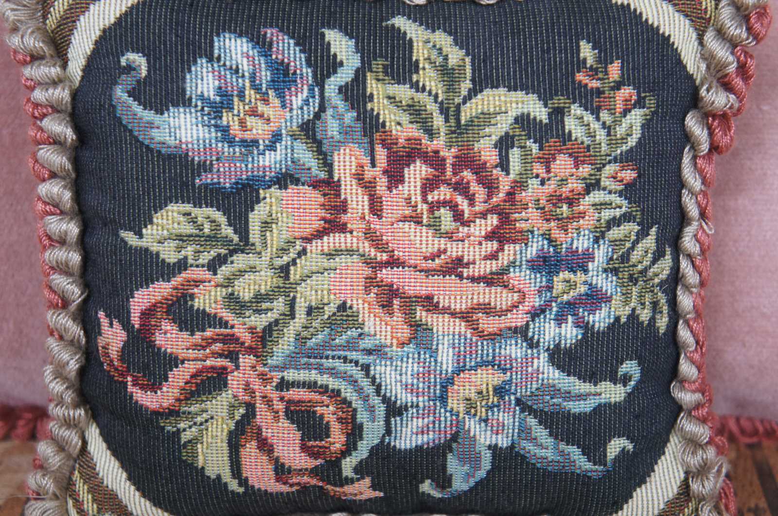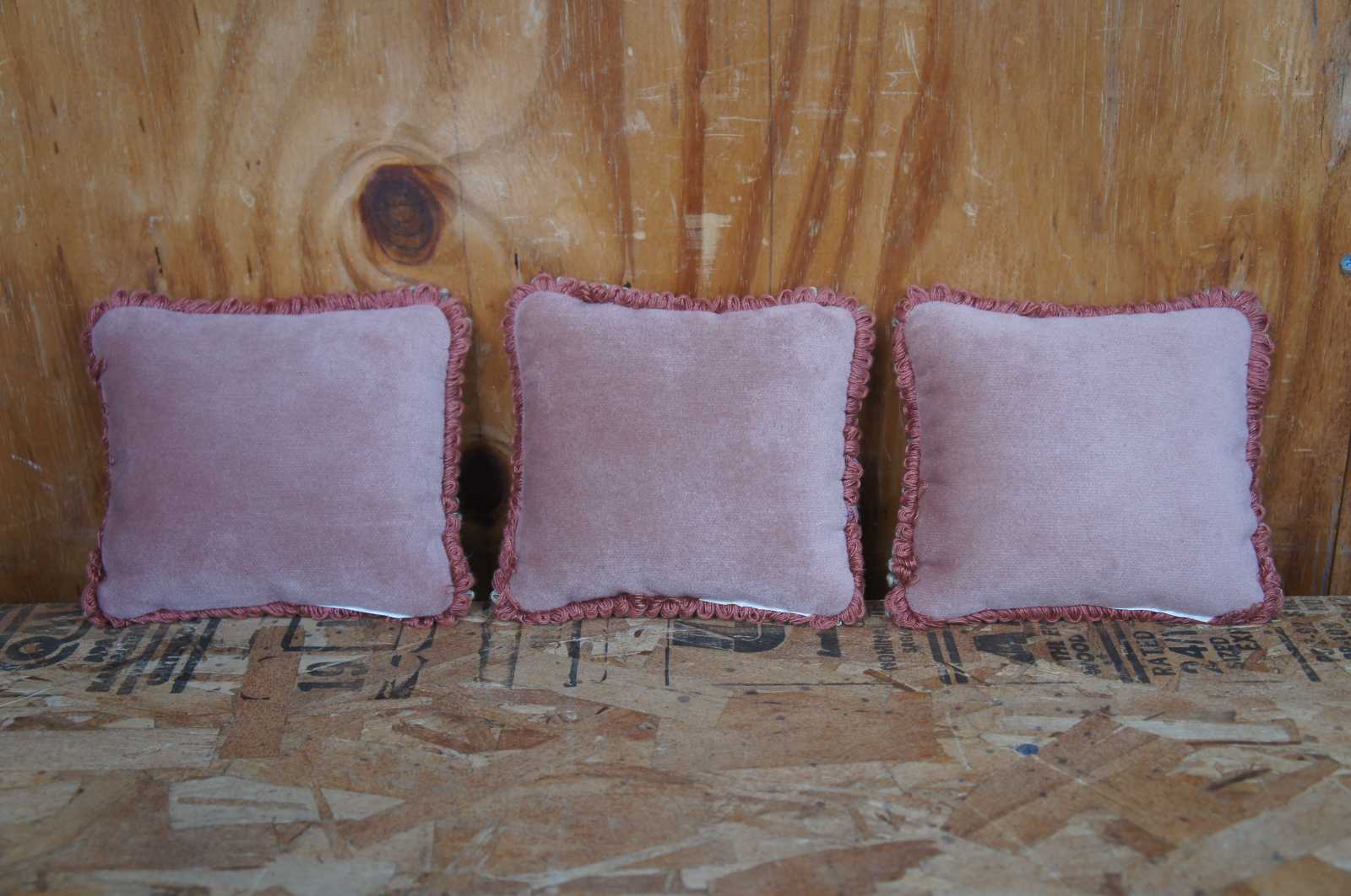 Three tapestry needlepoint accent pillows featuring a bouquet of multi-colored flowers on one side with soft pink velvet on the other, finished with braided fringe.