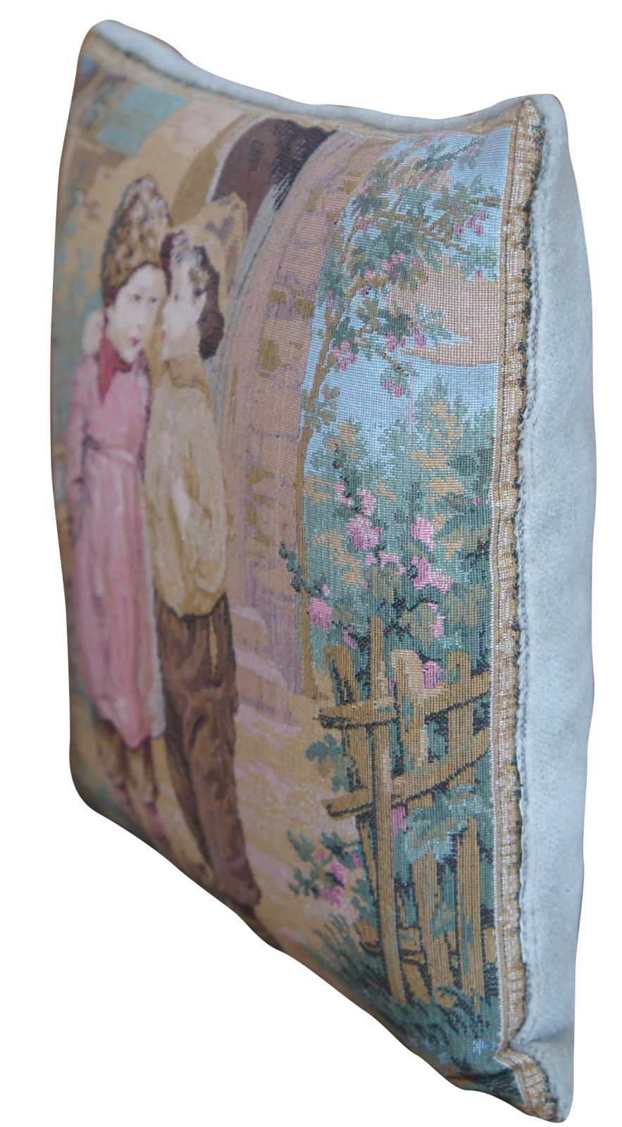 Vintage needlepoint accent pillow featuring a boy and a girl meandering around the farmhouse.