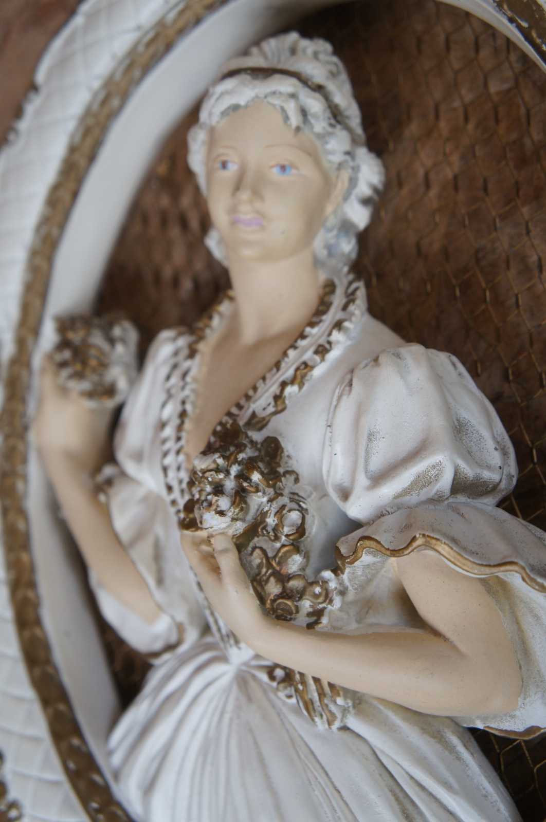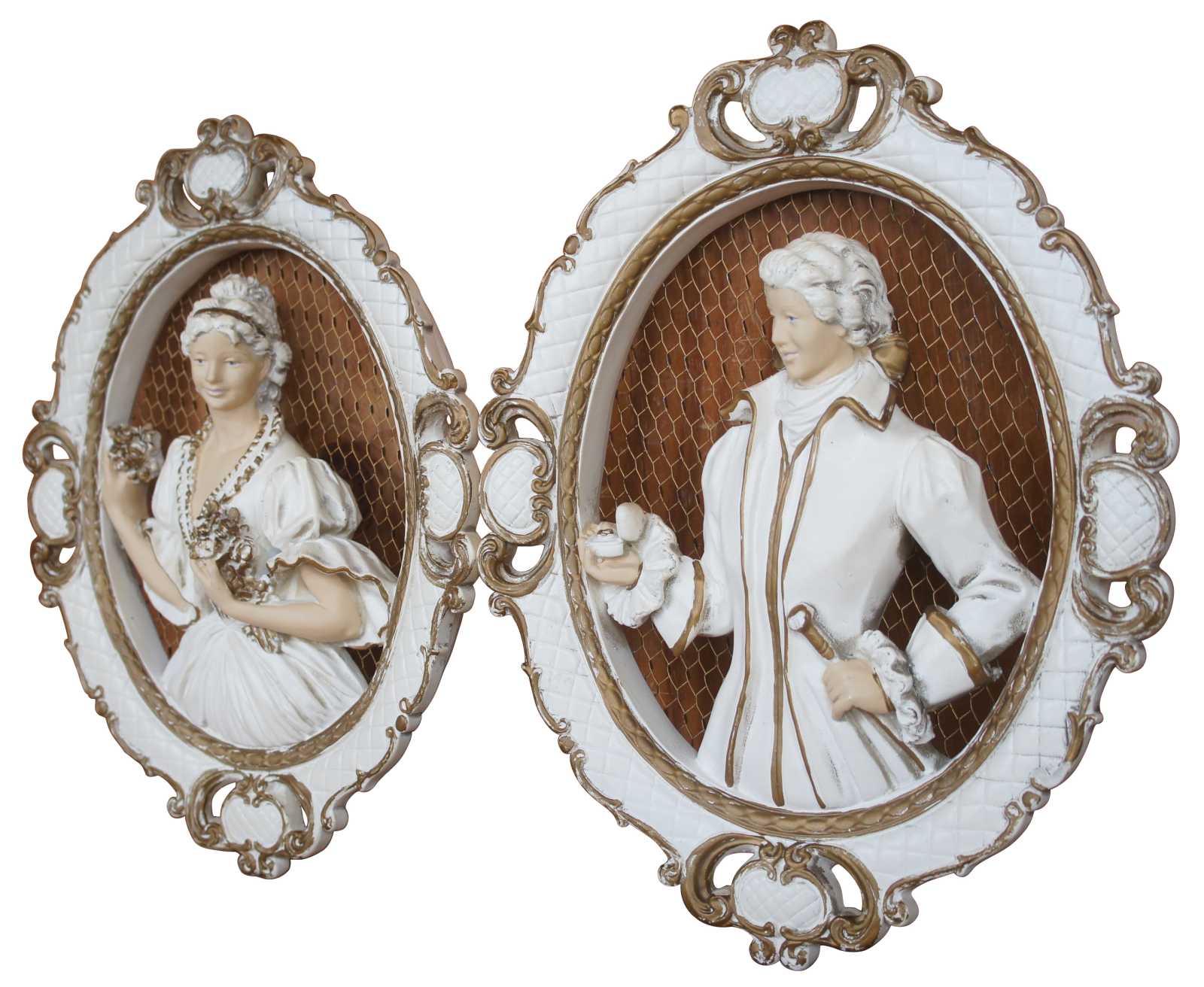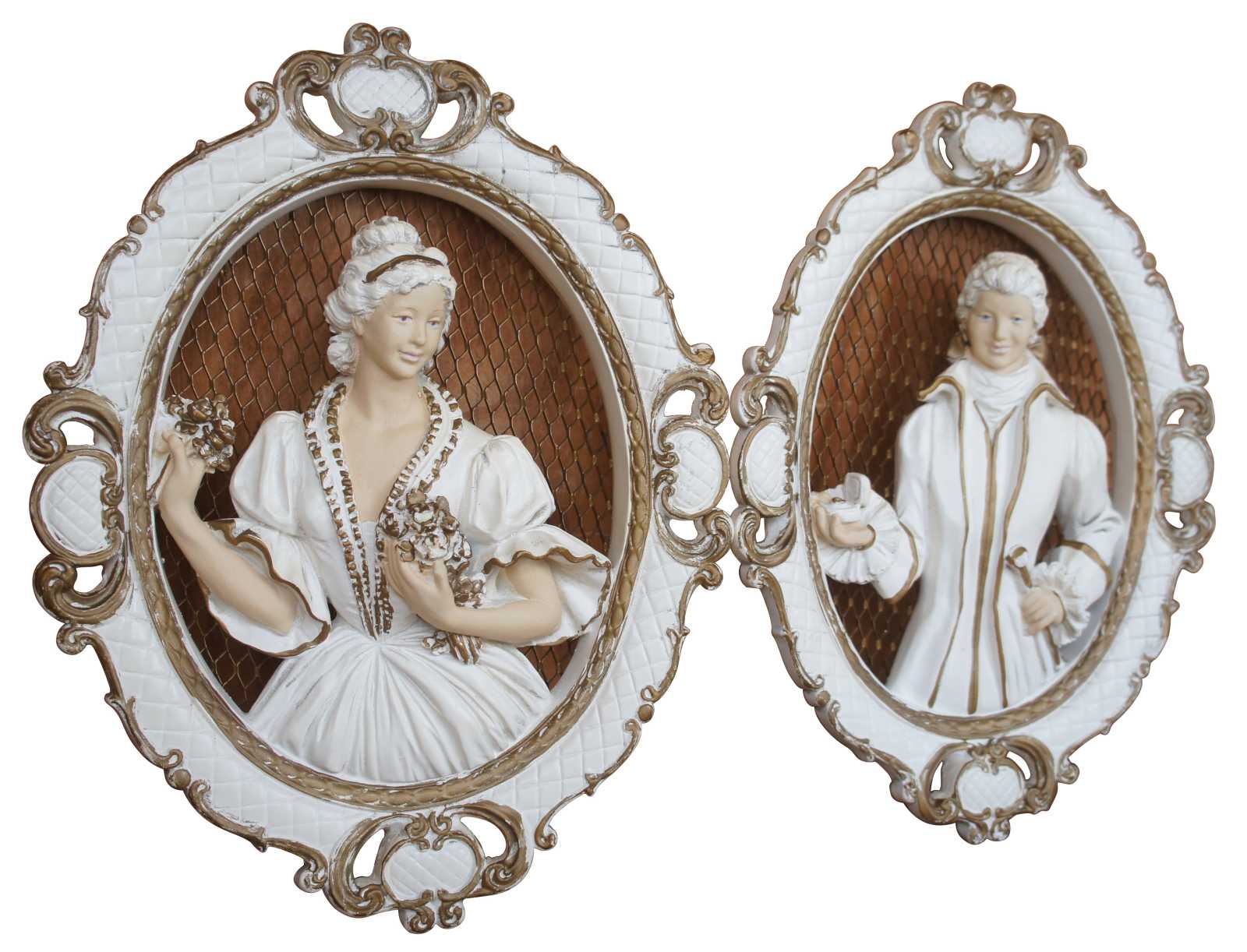 Two mid century wall plaques by Universal Statuary Corp, circa 1958. Made of chalkware featuring ornate frame with lattice back and French Louis XIV stylized scene depicting a Victorian couple; a man proposing with a ring and a woman gathering wild flowers.
