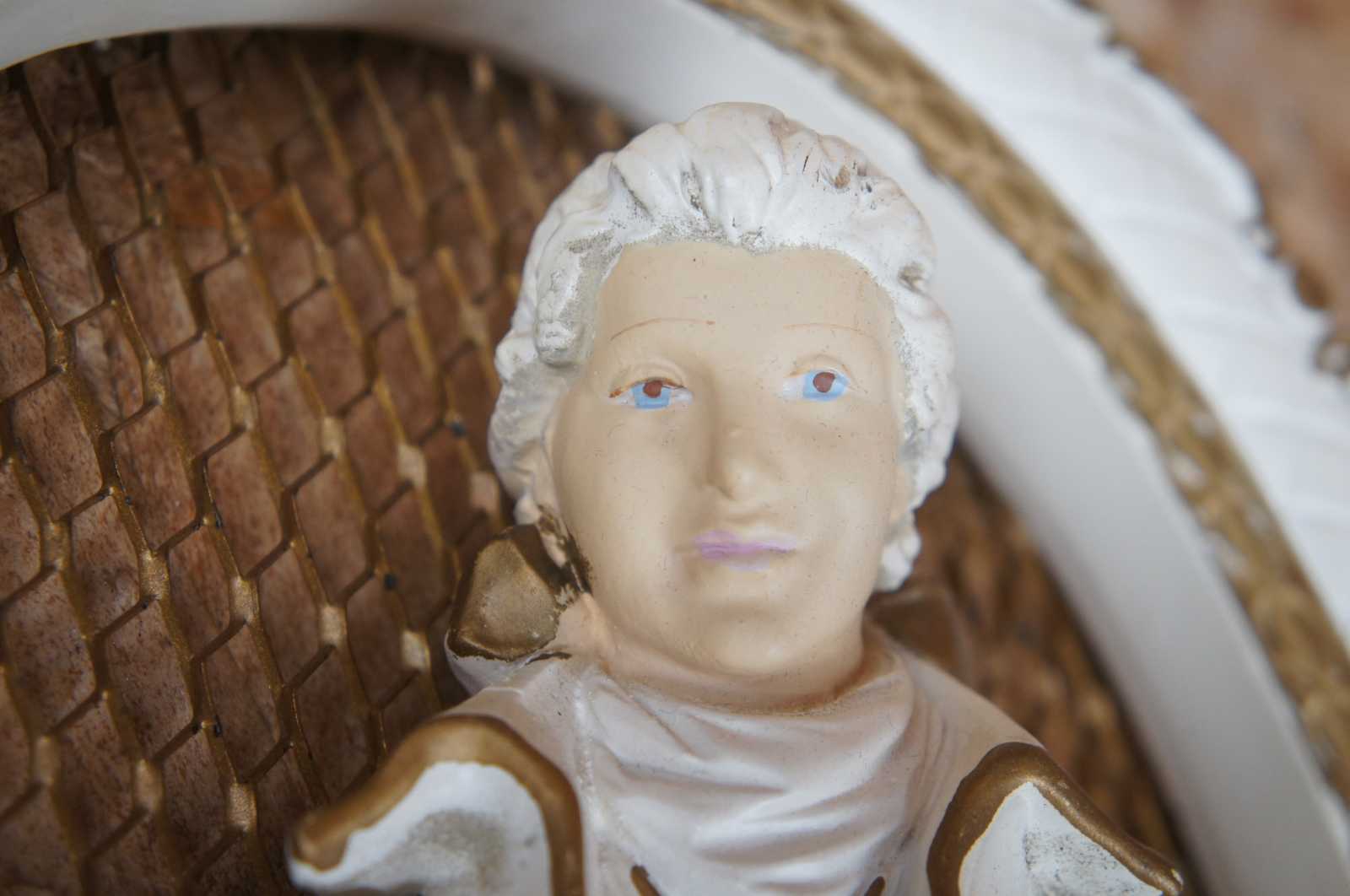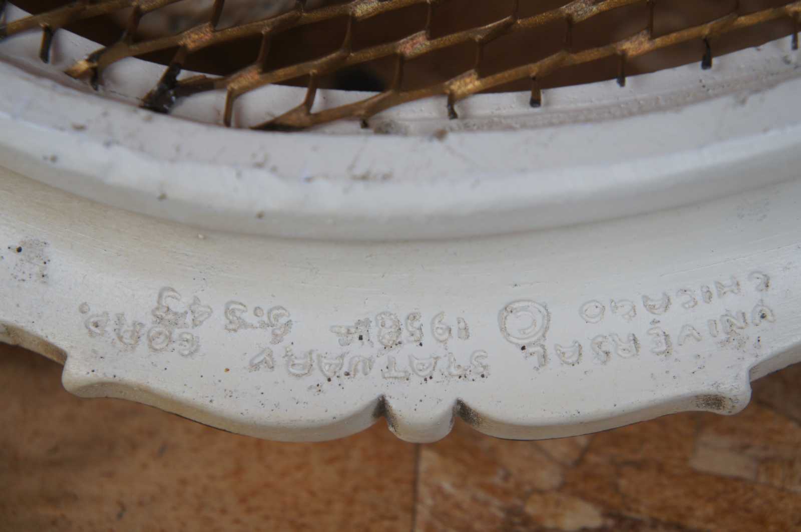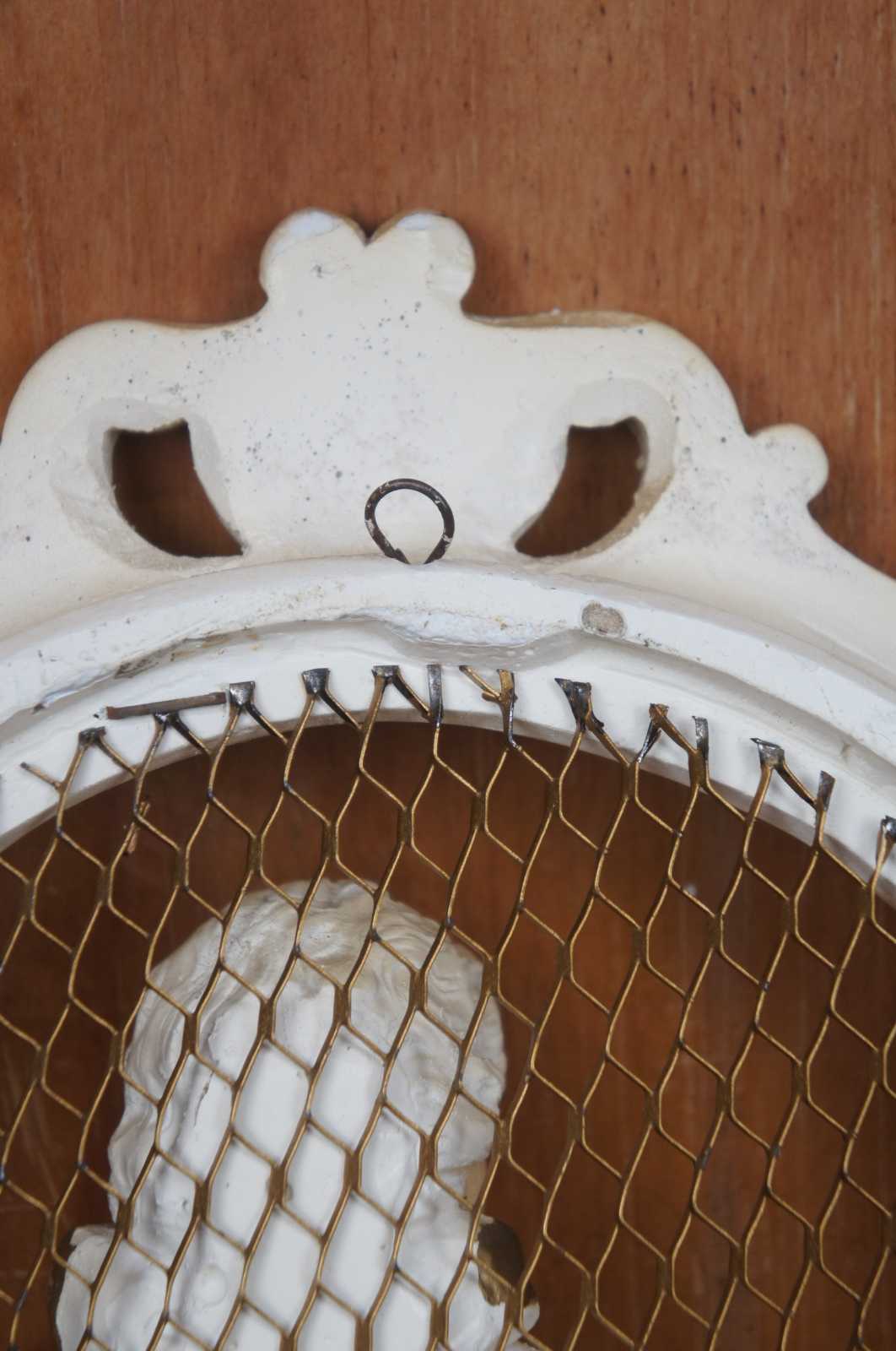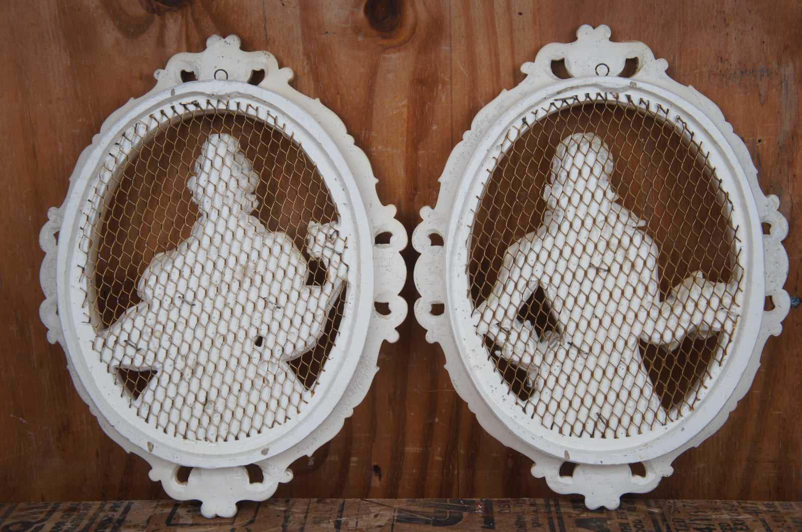 Two mid century wall plaques by Universal Statuary Corp, circa 1958. Made of chalkware featuring ornate frame with lattice back and French Louis XIV stylized scene depicting a Victorian couple; a man proposing with a ring and a woman gathering wild flowers.