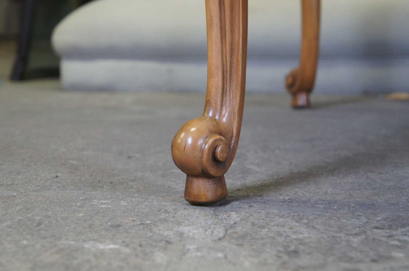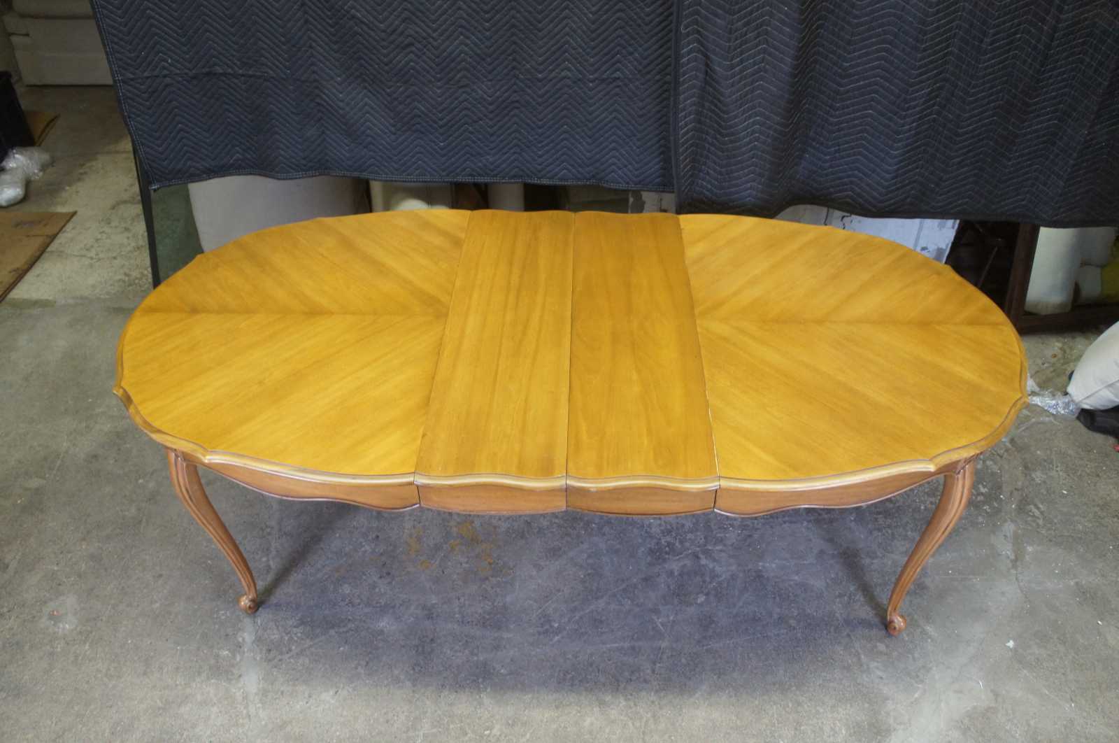 Mid 20th century French Provincial dining table. Made from walnut with an oval form featuring a scalloped top with matchbook veneer ang long scrolled french legs. Extends to 101