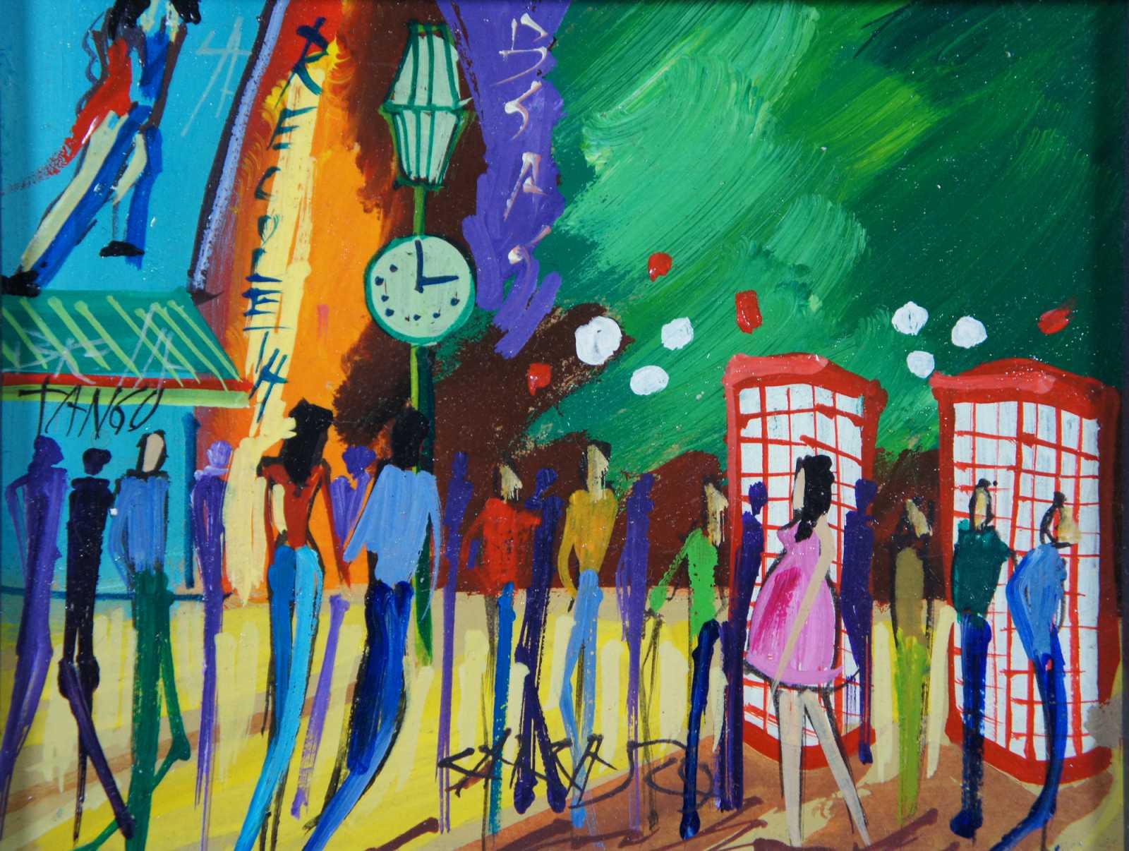 Set of three contemporary acrylic on board cityscape scenes by Argentinian artist Angel Carrasco. Signed and titled on the back.