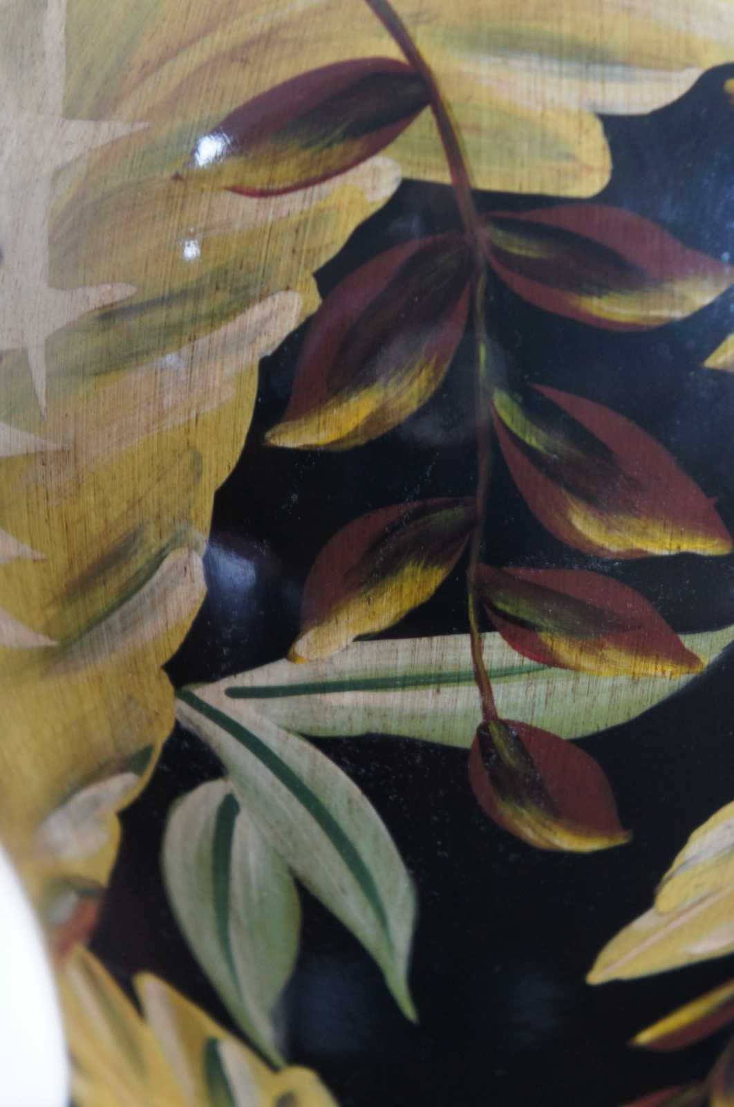 Pair of vase shaped black porcelain table lamps with hand painted flowers and matching finials by John Richard.