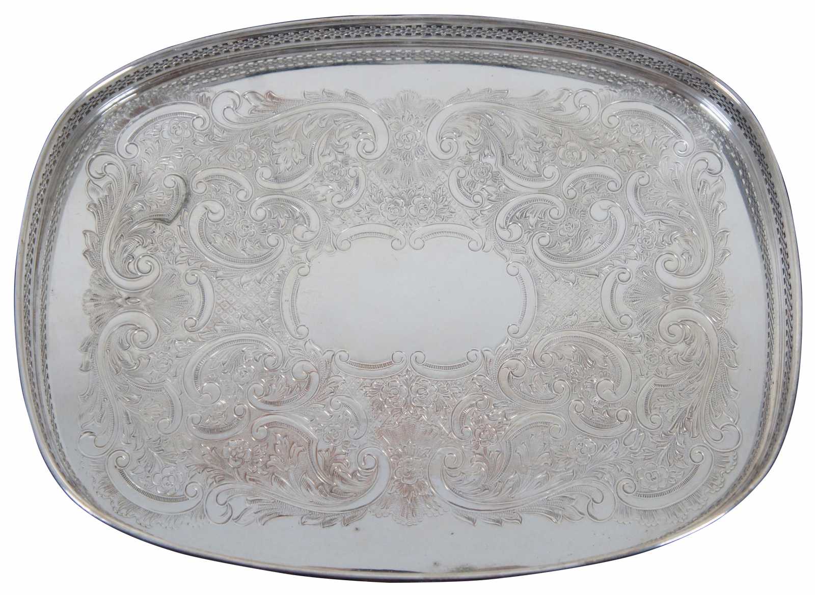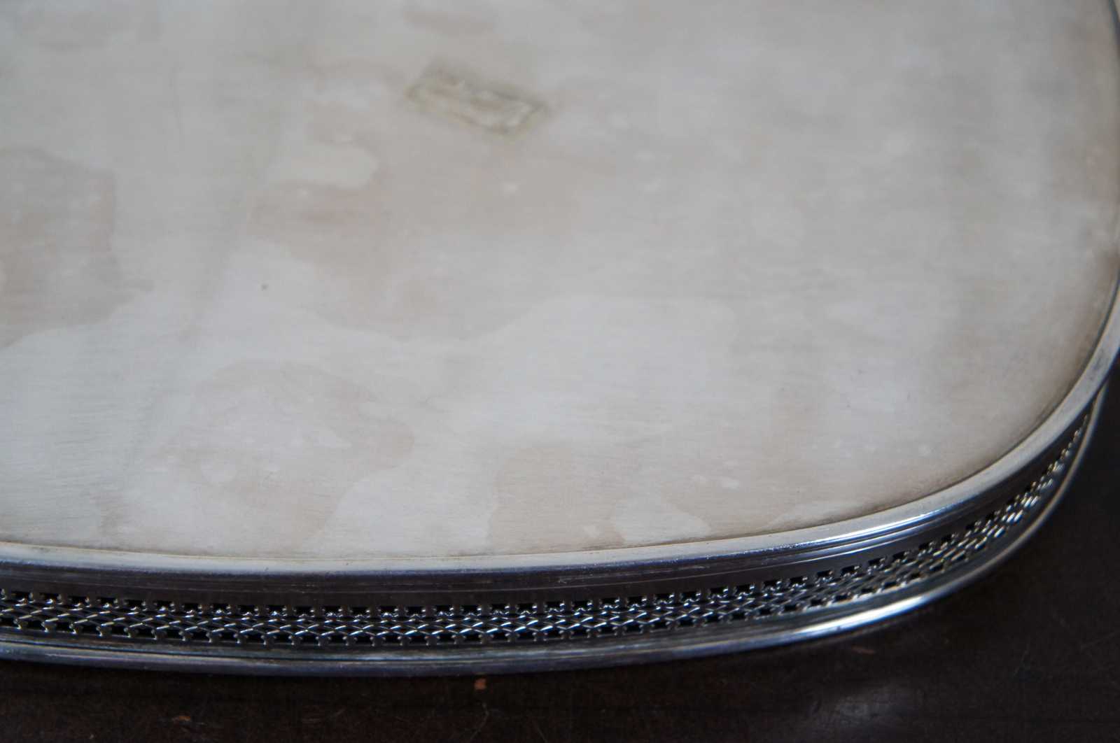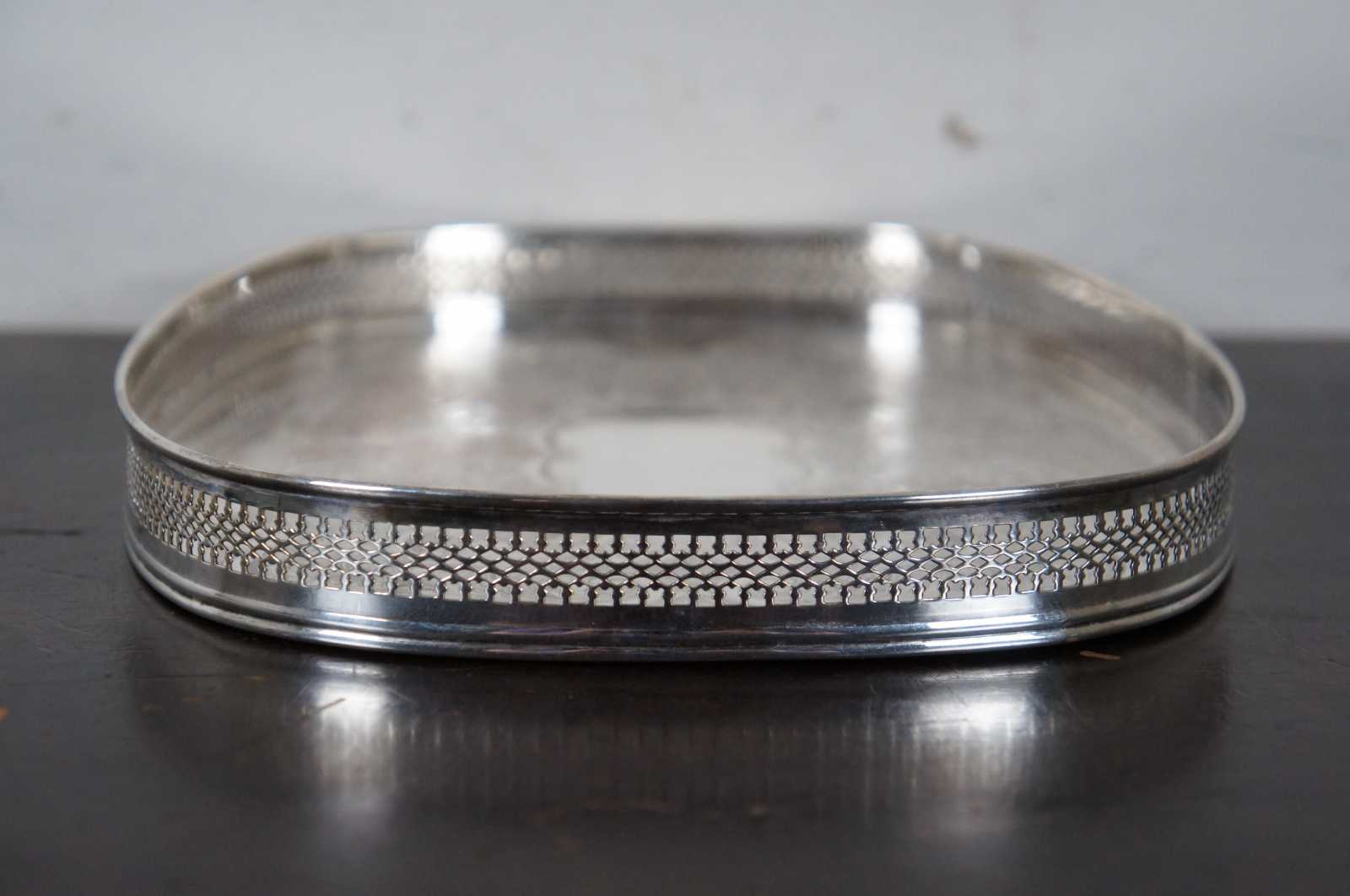 Vintage oval silver plate tray with raised pierced / reticulated edge and stamped floral pattern. Marked on reverse with an F topped by a crown.