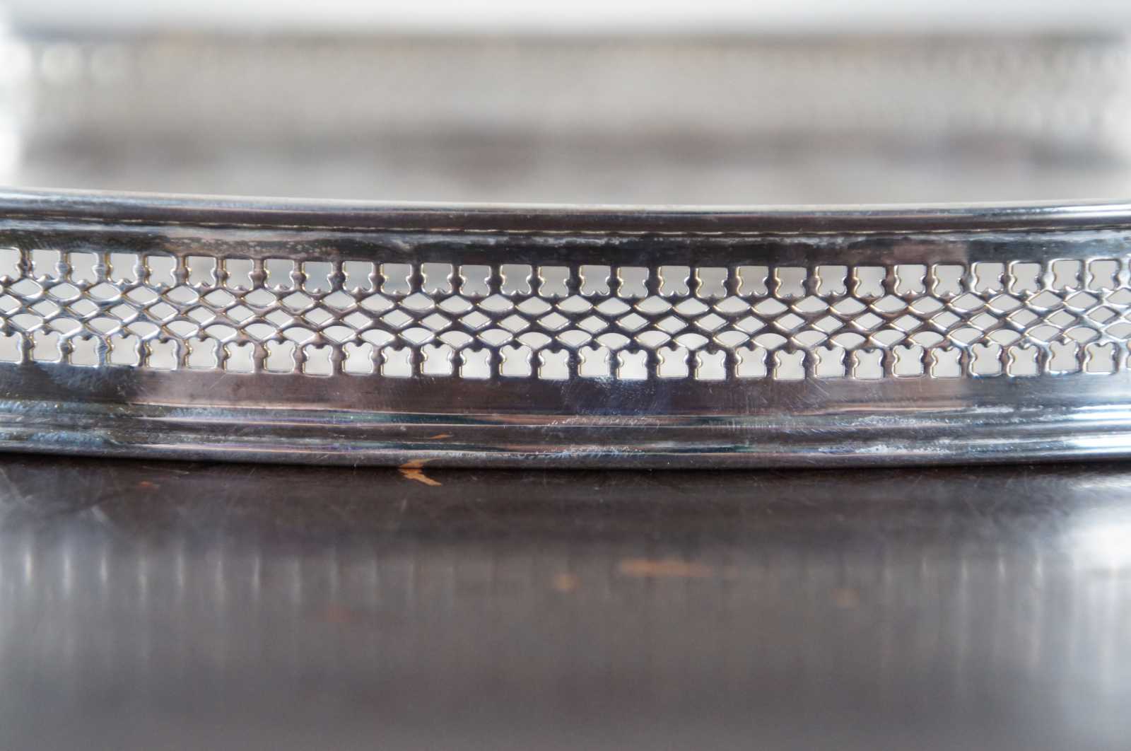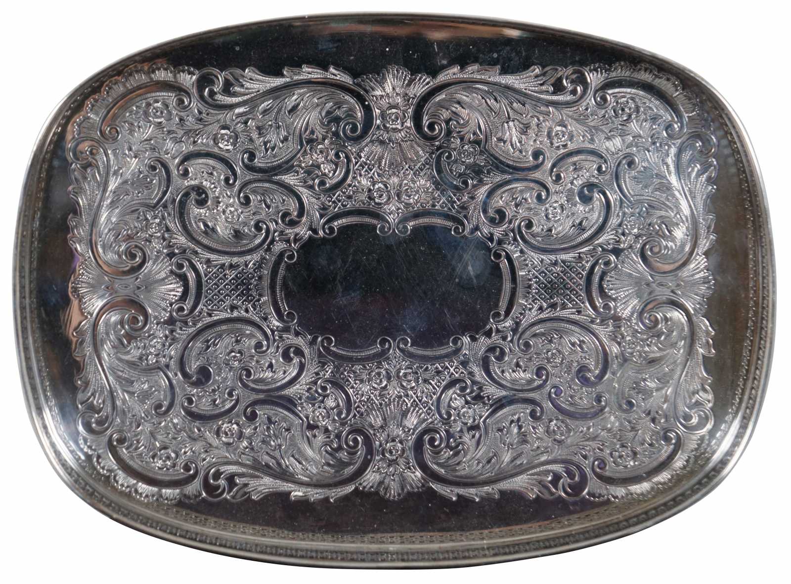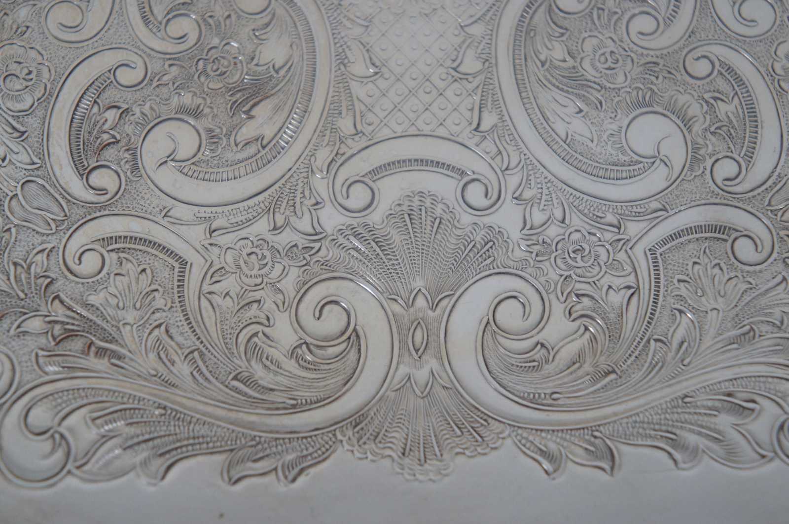 Vintage oval silver plate tray with raised pierced / reticulated edge and stamped floral pattern. Marked on reverse with an F topped by a crown.