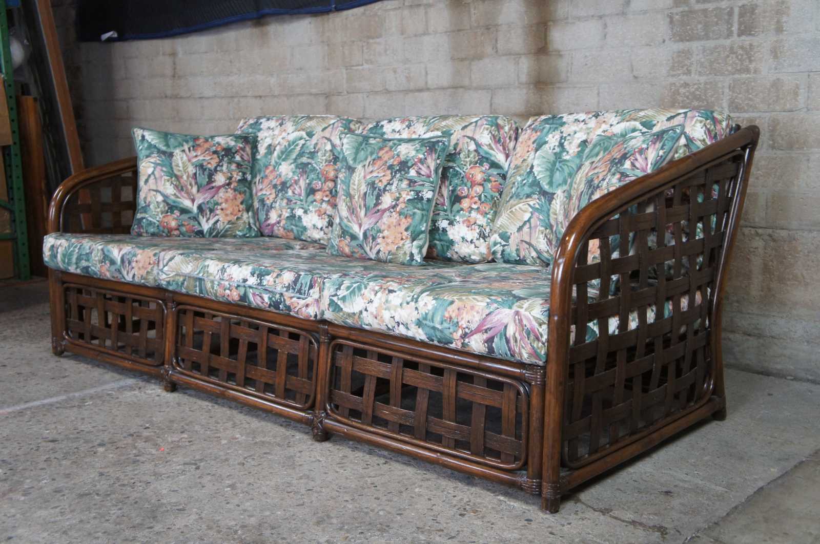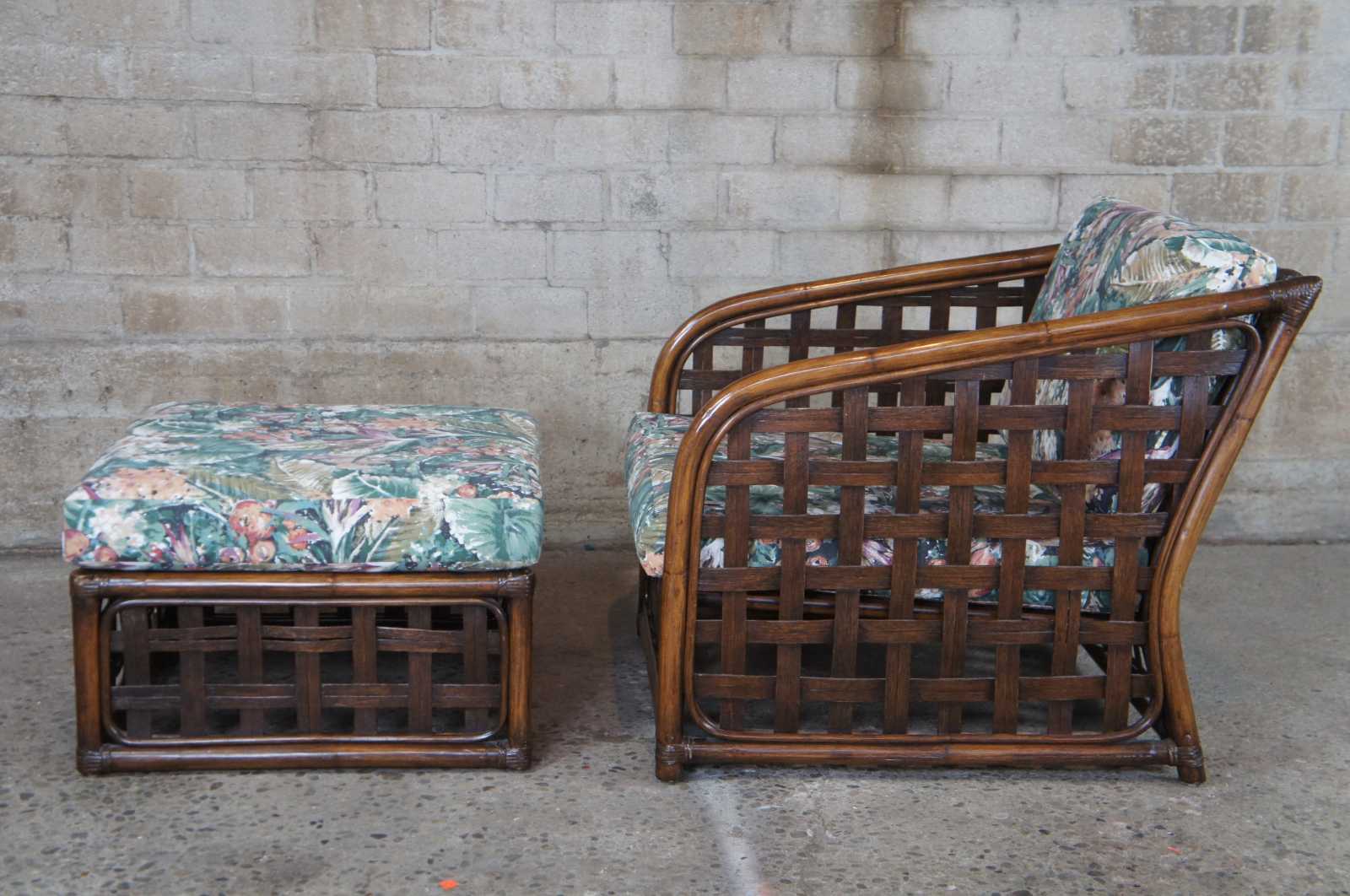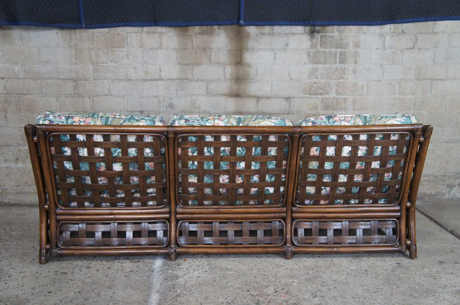 Vintage six piece Ficks Reed patio set, circa 1970s. Features bamboo and rattan construction with floral upholstery. Includes sofa / couch, coffee table, side table, arm chair and ottoman and sofa table. Coffe table and side table include a lower storage compartment and reeded tops.