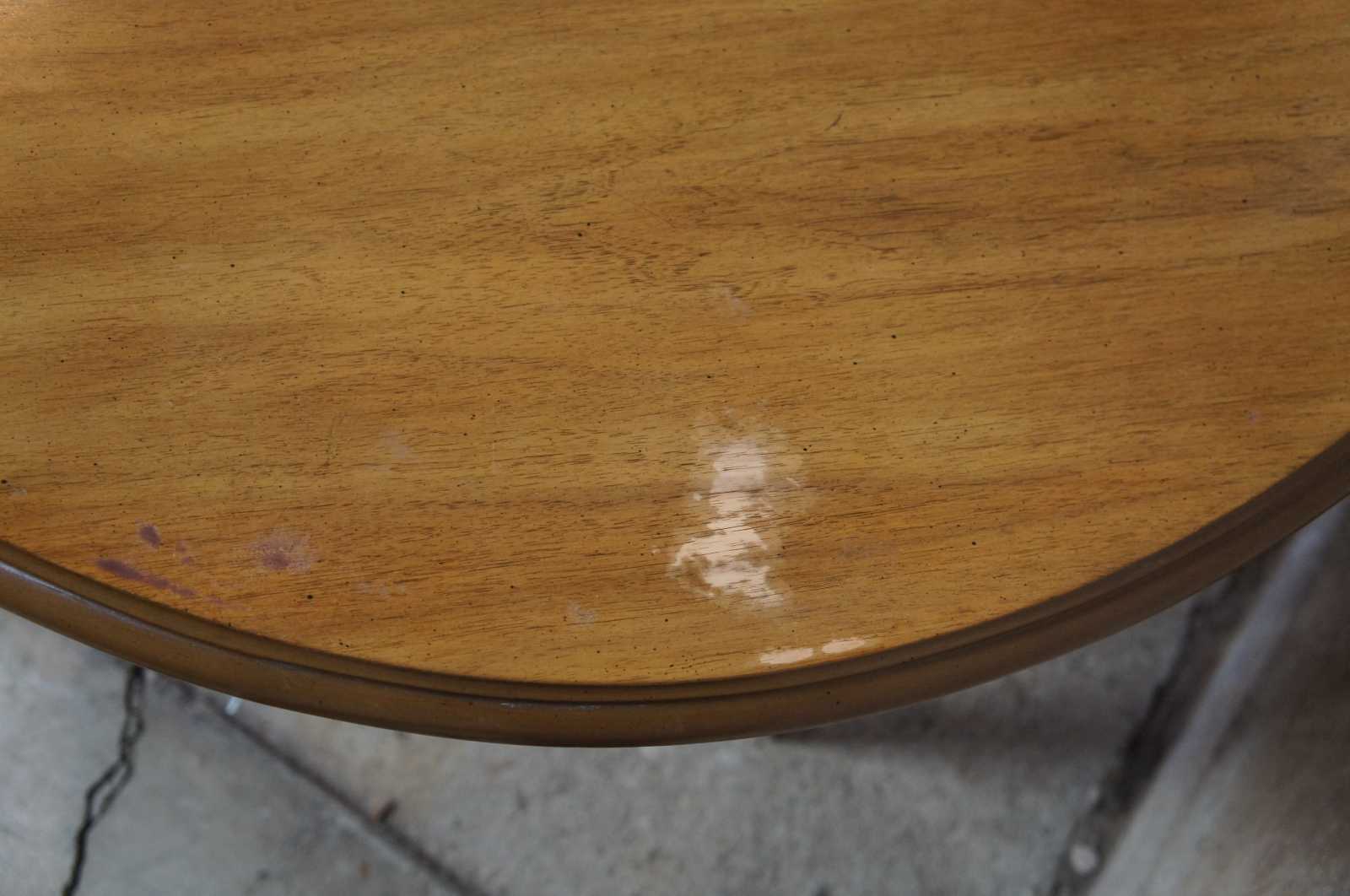 Vintage Stanley Furniture dining table. Made of walnut with matchbook parquetry oval top and tapered fluted legs. 645-38