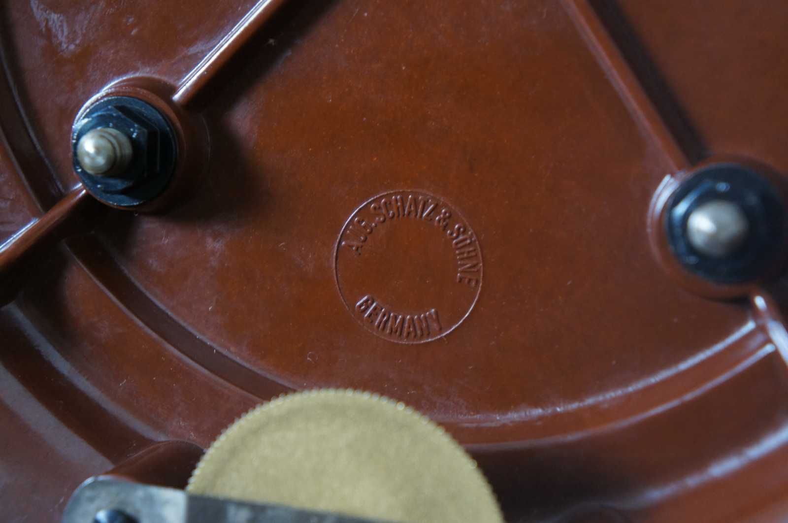 The company known as Schatz was first known as Jahresuhrenfabrik. The company was founded by August Schatz in the mid-1850s in the Black Forest region of Triburg, Germany. It was registered in 1881 as Schatz & Wintermantel, and was re-structured in 1884 as Jahresuhrenfabrik A.G. It was registered again in1897 as Jahresuhrenfabrik GmbH, and finally in 1923 as Jahresuhrenfabrik August Schatz & Sohne. They produced cuckoo clocks, barometers, and 400- day clocks. In later years, they produced electric clocks and battery- operated quartz clocks. The company struggled to compete in the early 1980s, and finally closed down in 1985.