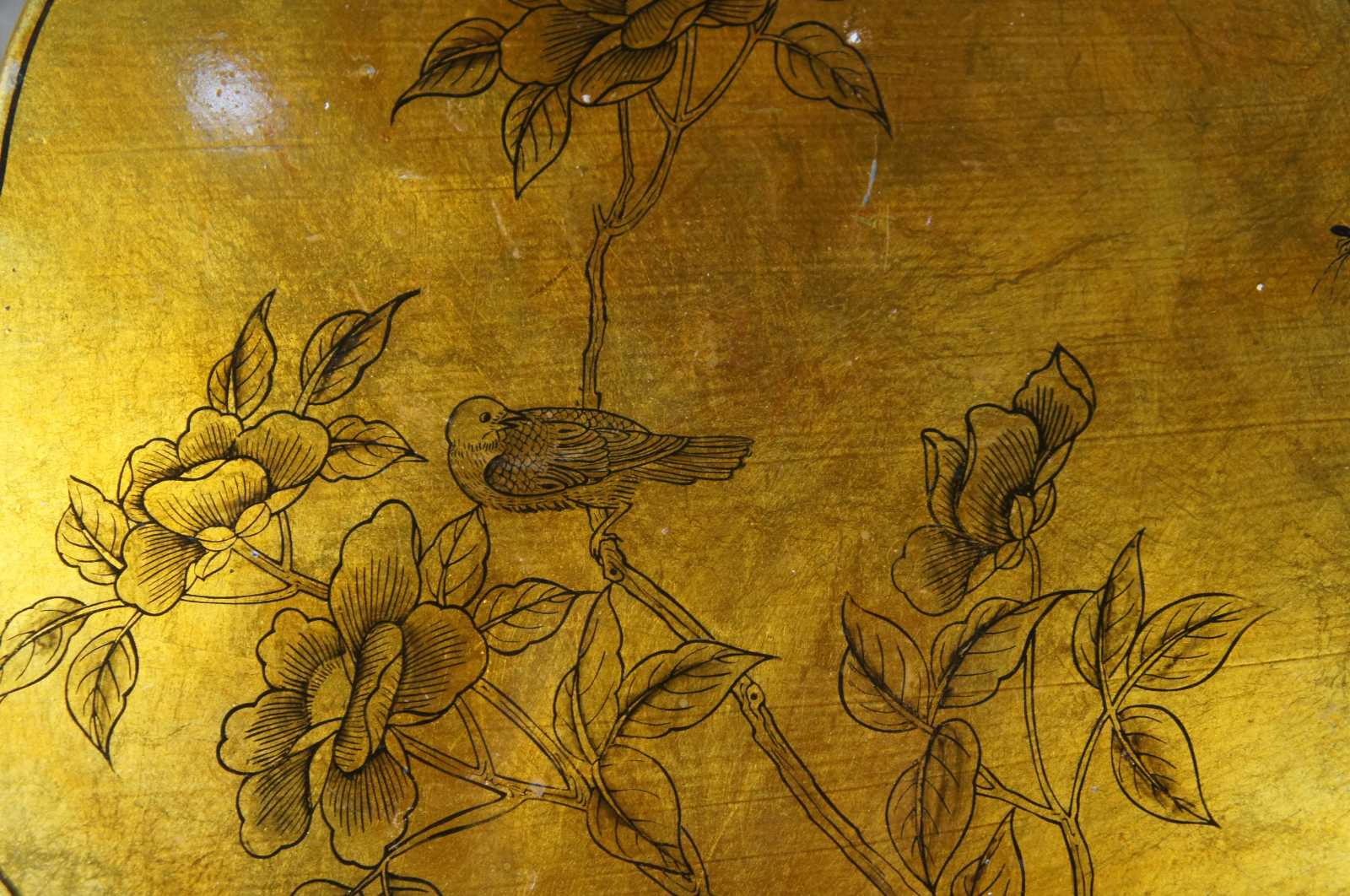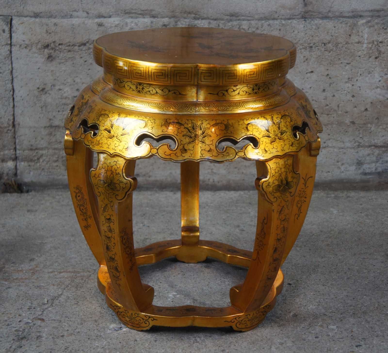 Vibrant 20th century gold and black oriental gardent stool or stand. An elaborate design with a pierced apron with flowing flowers, scrolling clouds and greek key trim. Features a bird perched along the top.