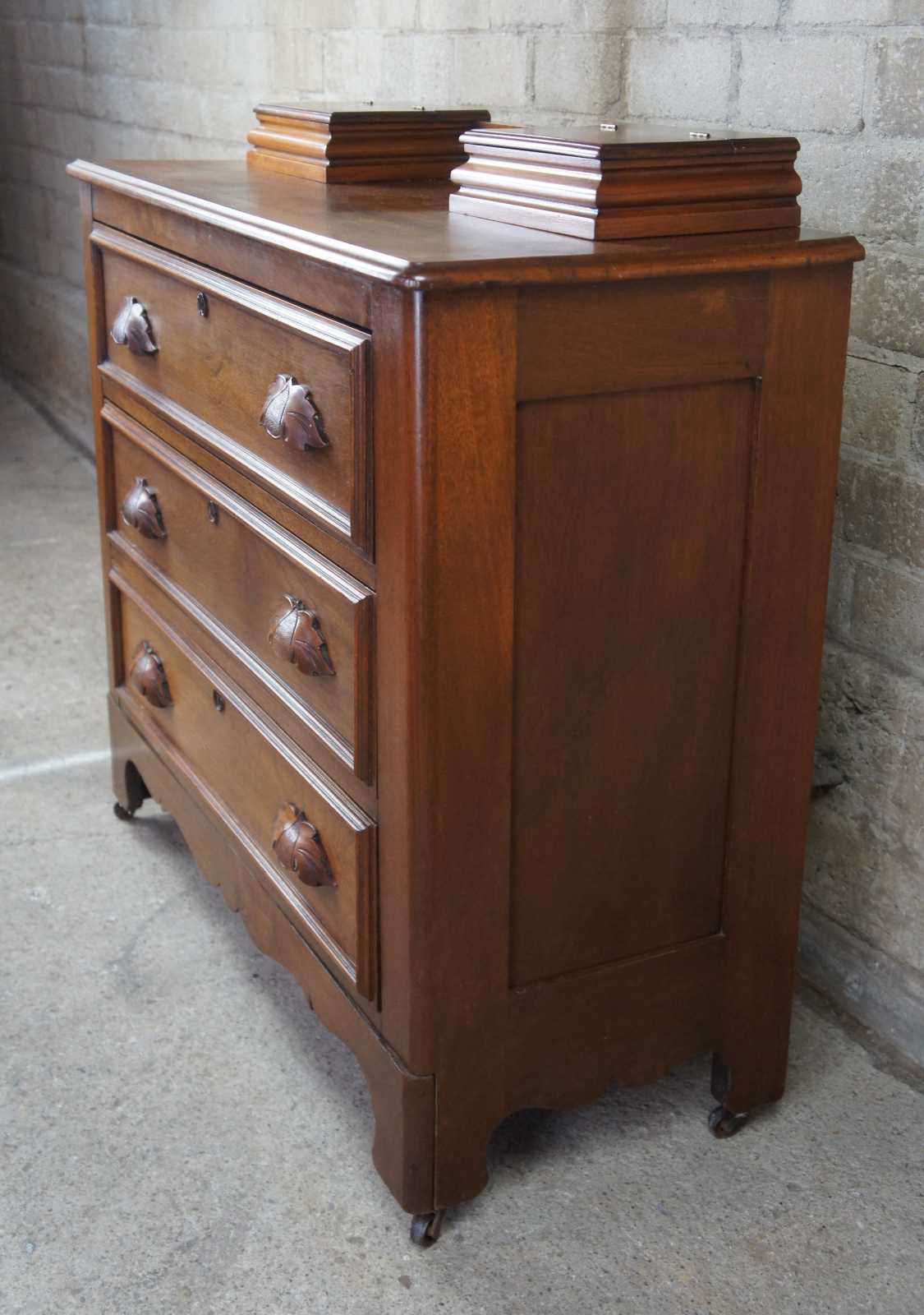 Circa 1880s Victorian dresser. Made from walnut with two glovebox drawers over three larger lower drawers. Features ovular shaped drawer trim, leaf carved pulls and serpentine cut lower apron. The drawers are constructed using the Knapp Joint. The Knapp joint was developed during the late Victoria Era in post-Civil War United States. It was patented by Charles Knapp of Waterloo, WI in 1867. The Knapp Joint is particularly unique to furniture as it was only used from 1870 until 1900.