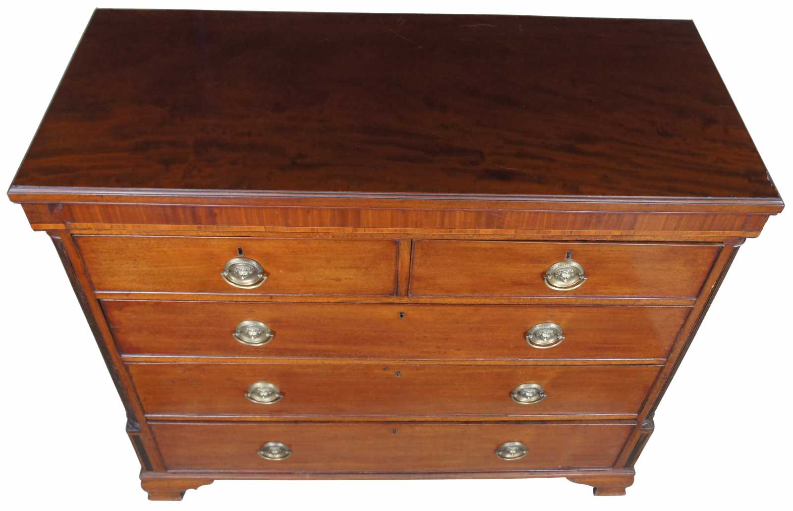 Circa 1850s English mahogany rectangular form "Two over Three" chest of drawers. A remarkable design with banding, quarter cut reeded columns over inlay and brass lion head pulls. the chest is supported by bracket feet.