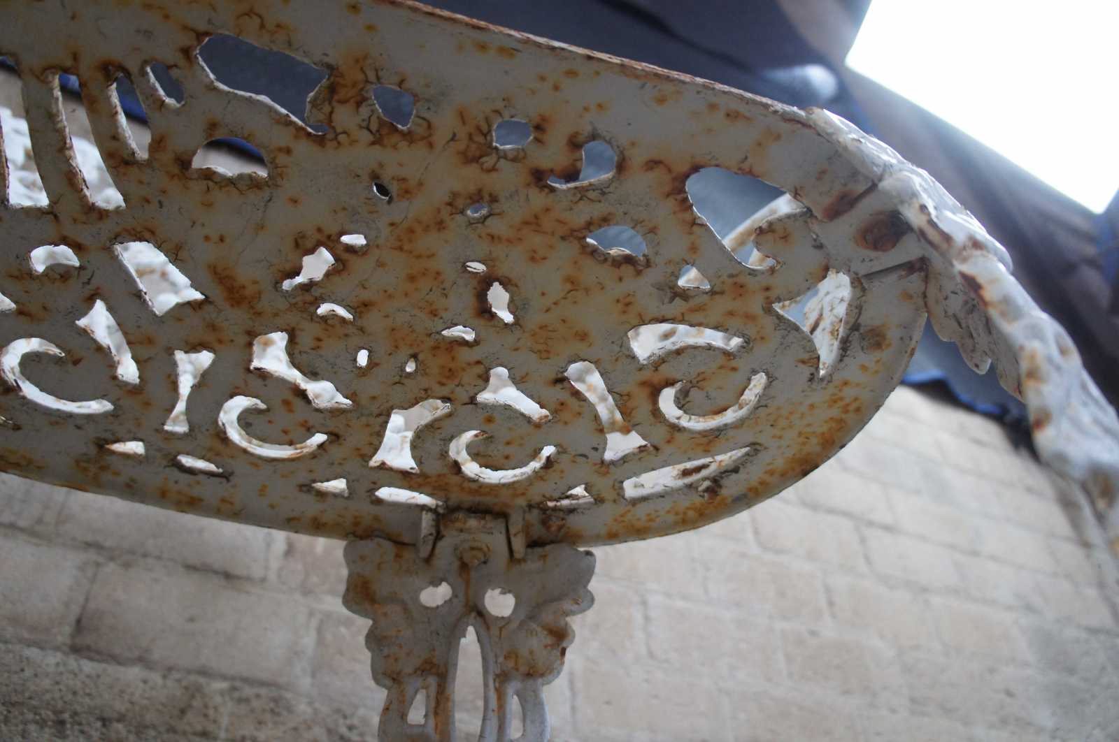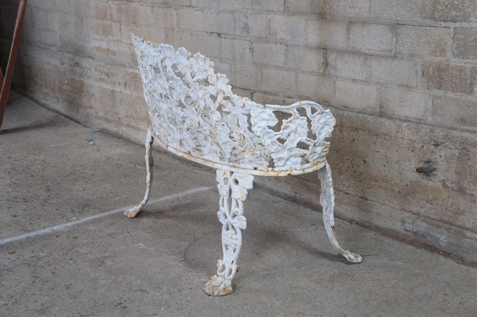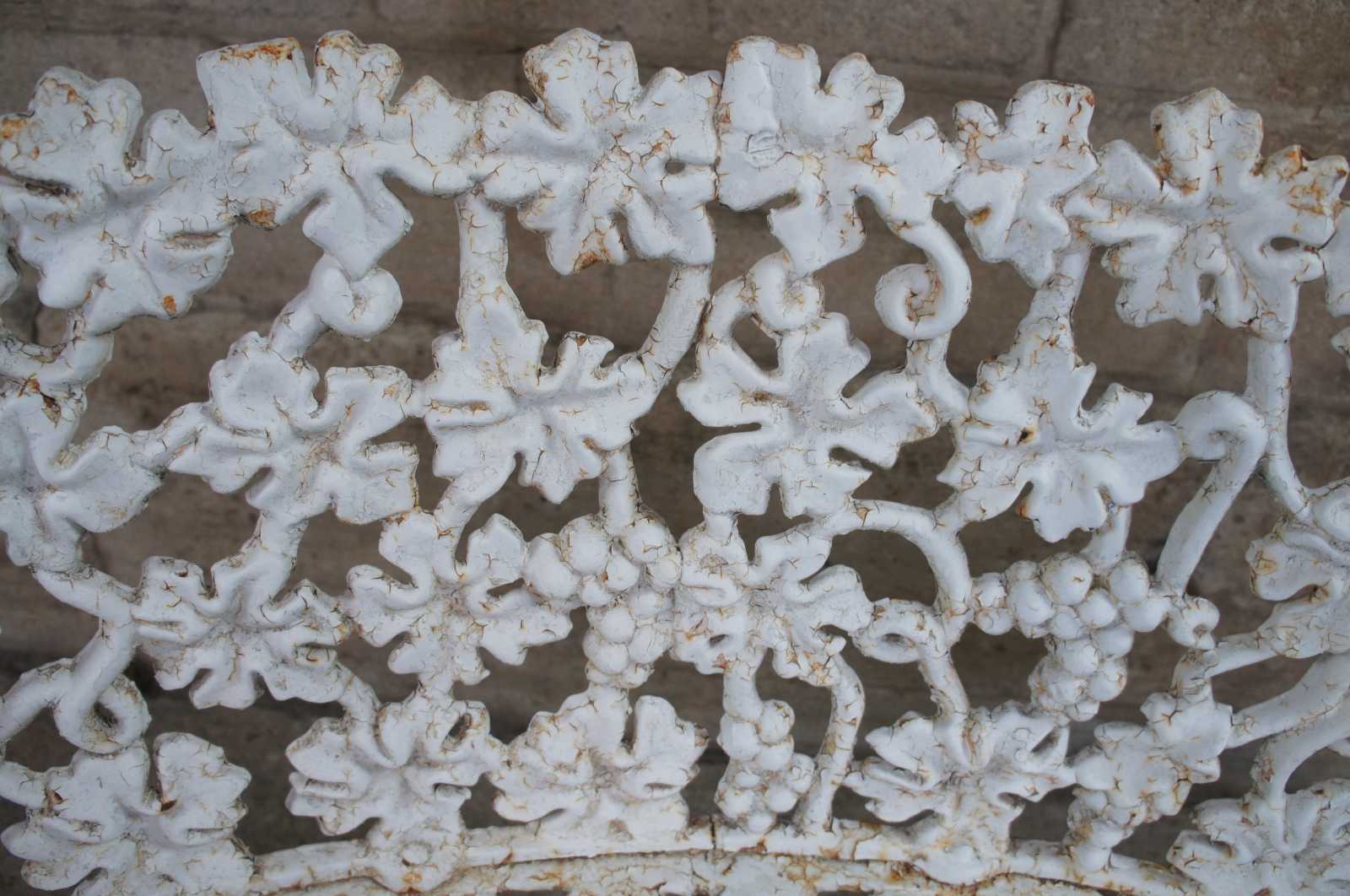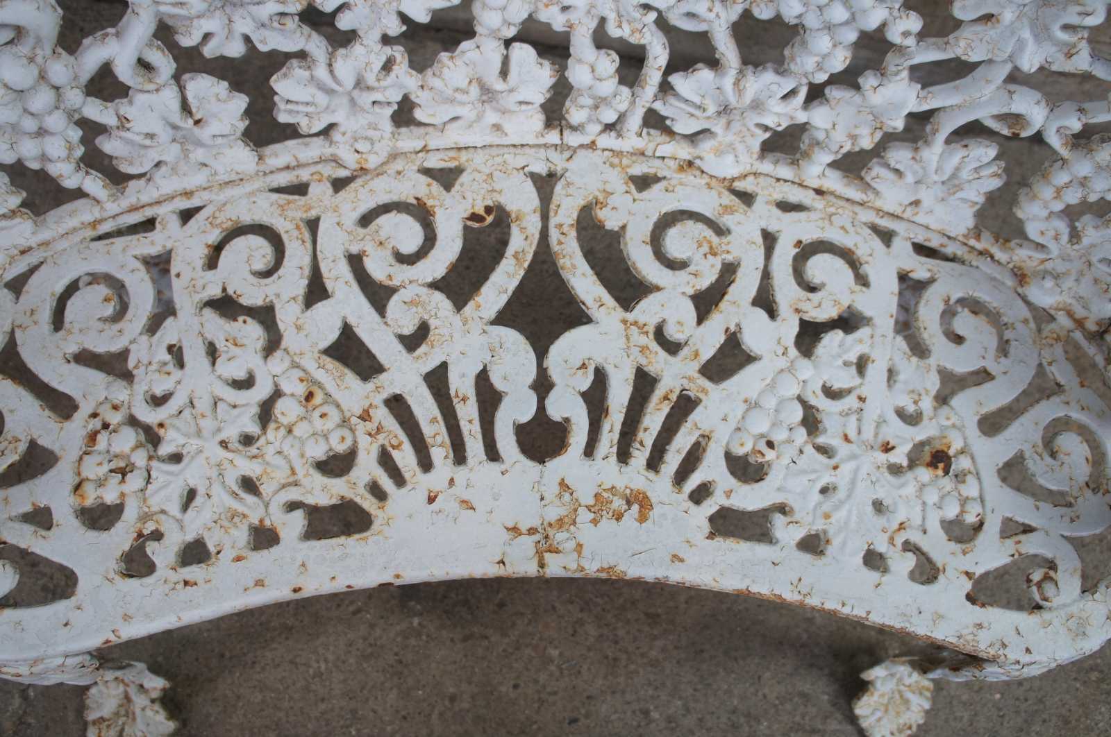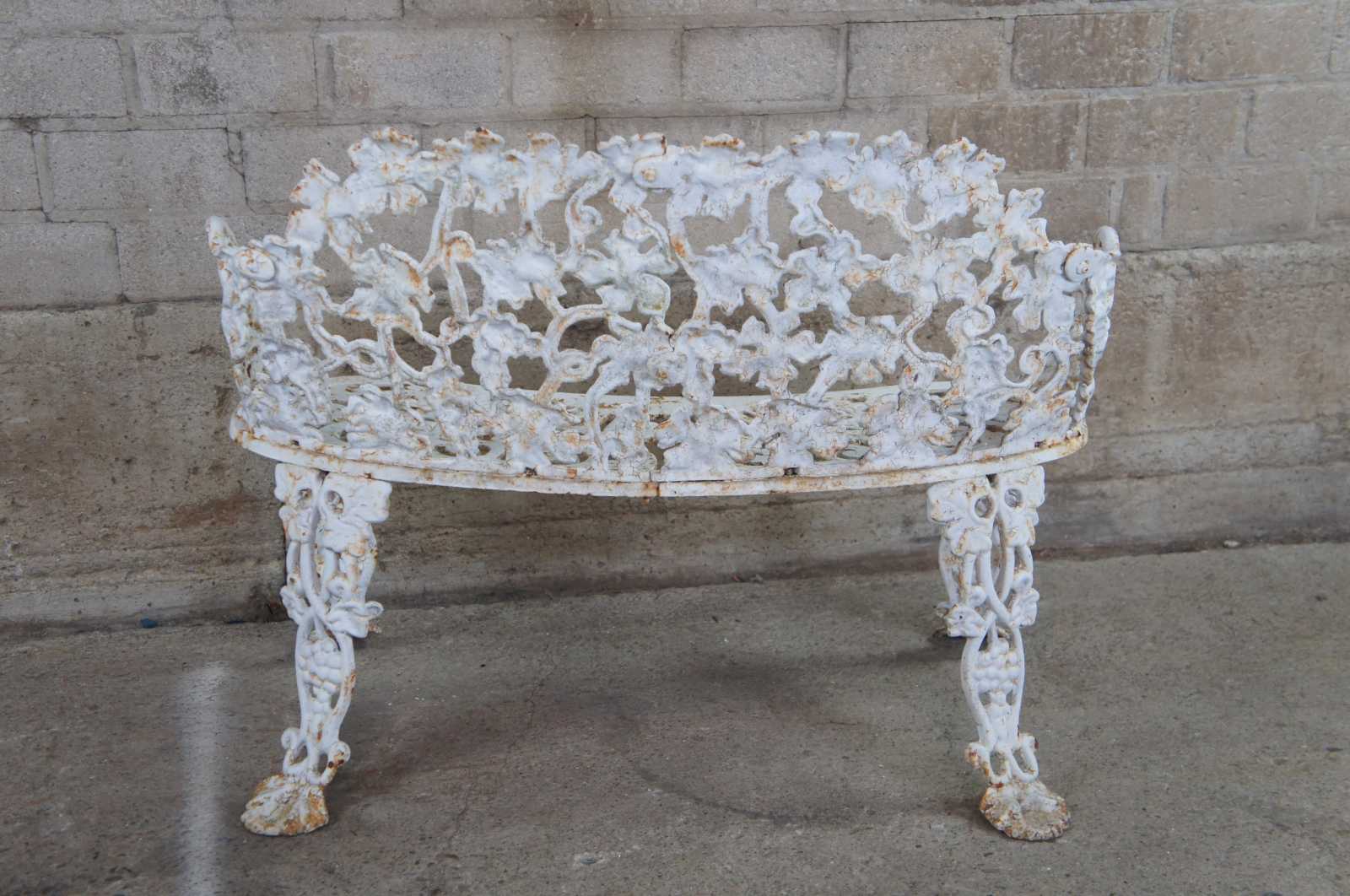 Victorian reticulated garden bench features cast iron construction in grape and leaf pattern and seated on cabriole legs terminating in stylized paw feet