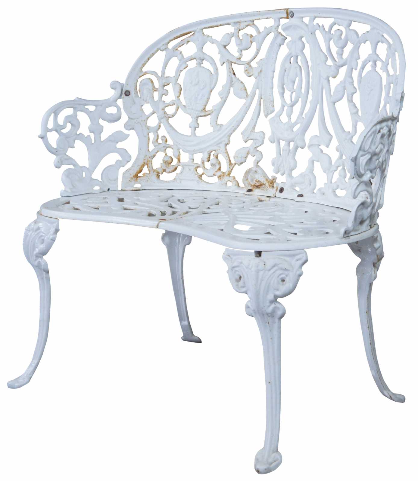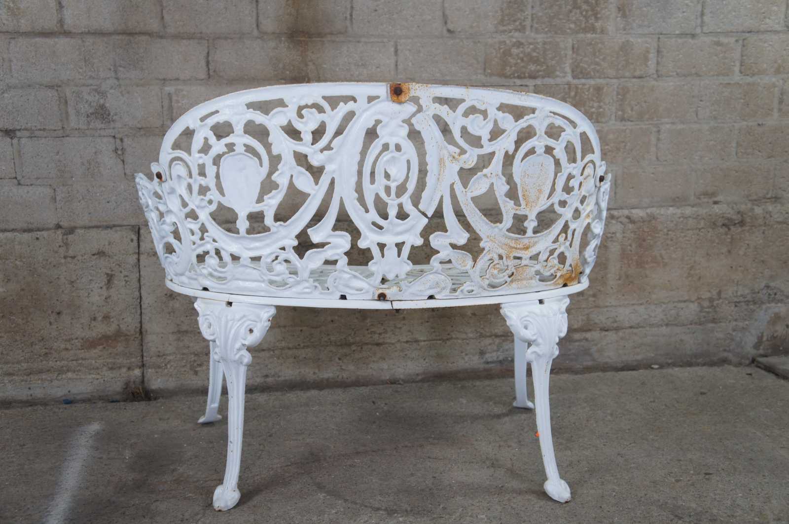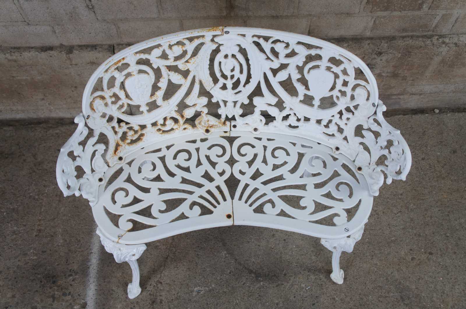 Antique French cast iron patio or garden bench. Made of cast iron featuring an ornate design with crest and scrolled seat