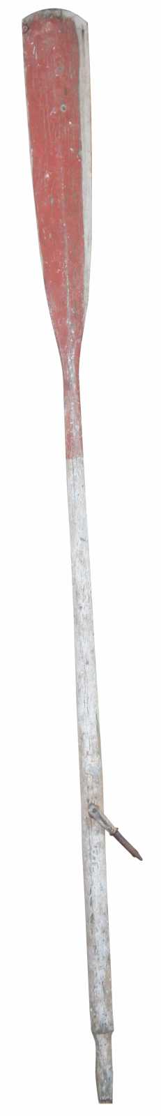 Vintage 84" long wooden rowing oar. Features primitive red paint and metal prong for attachment.