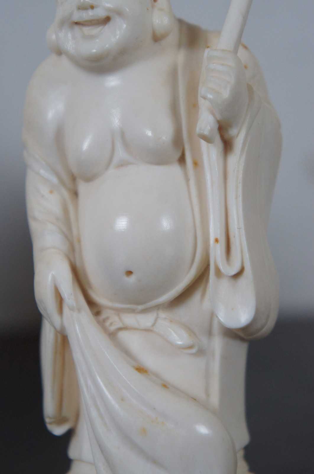 Vintage carved camel bone set of Japan’s Seven Lucky Gods with an elegantly carved wood base. “In Japanese mythology, the Seven Lucky Gods or Seven Gods of Fortune (七福神, shichifukujin in Japanese) are believed to grant good luck and are often represented in netsuke and in artworks. One of the seven (Jurōjin) is said to be based on an historical figure. The dieties include Ebisu, Daikokuten, Bishamonten, Benzaiten, Jurojin, Hotei, and Fukurokuju.