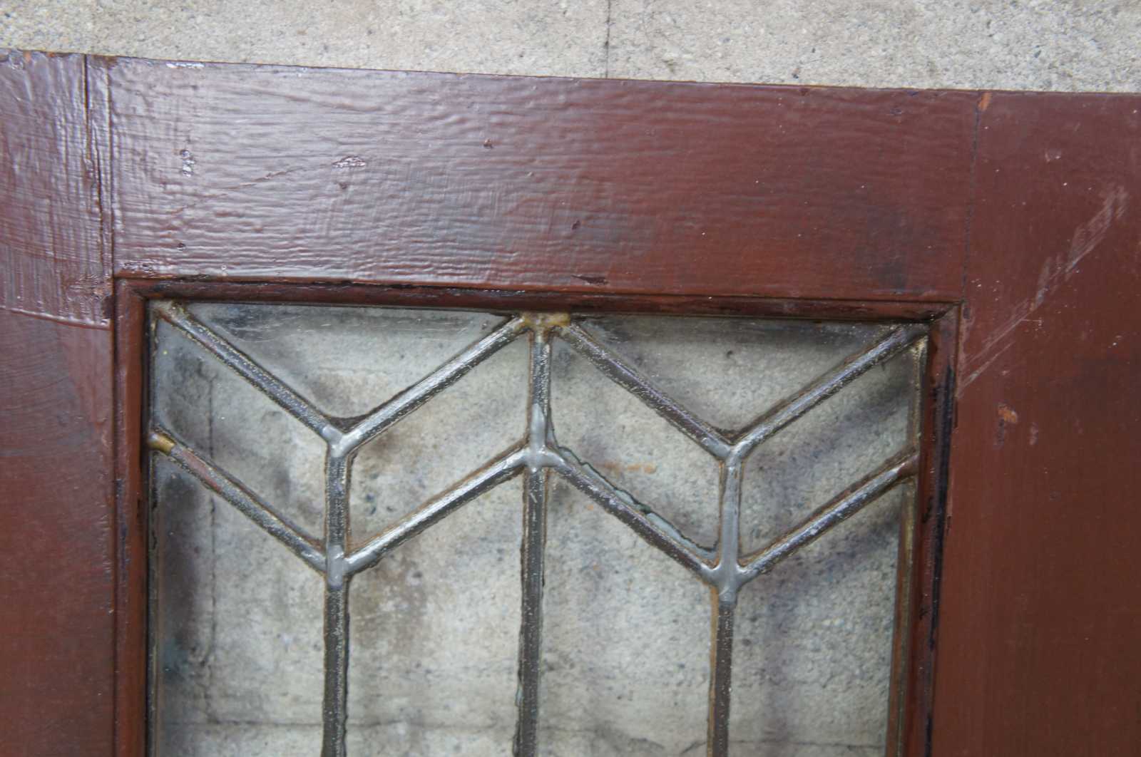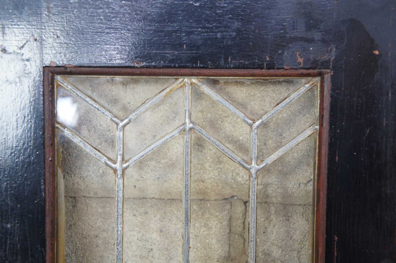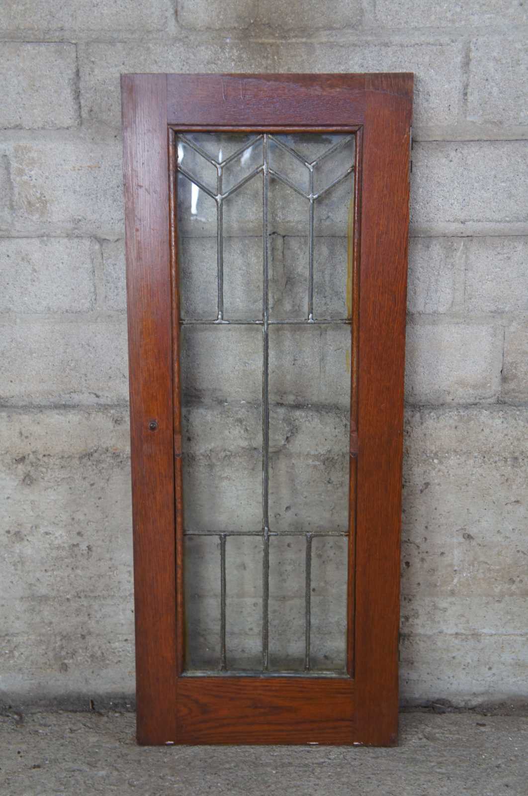 Reclaimed antique oak cabinet doors. Each features a unique leaded glass pattern in chevron design. Three available; sold separately. 2 lefts & a right.