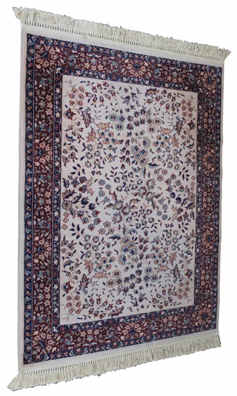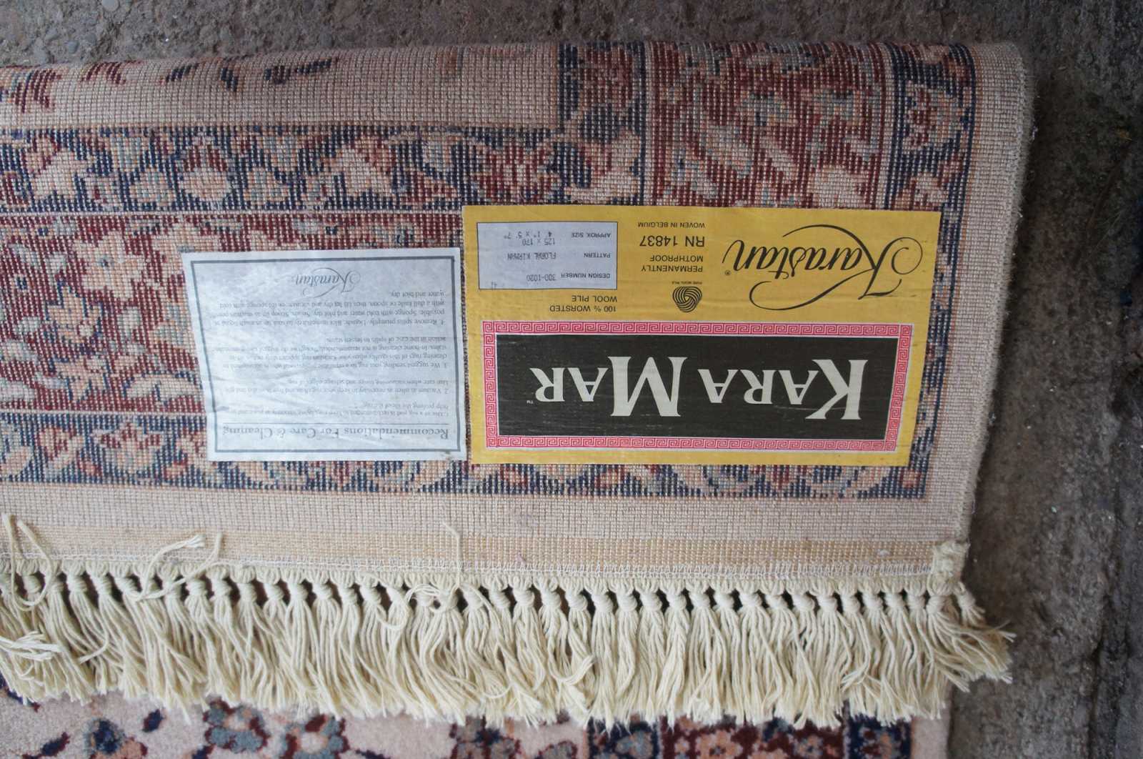 Vintage Karastan KaraMar area rug, carpet or mat. Made of 100% worsted wool in Belgium, this beauty features the floral Kirman pattern, design number 300-1020, RN 14837.