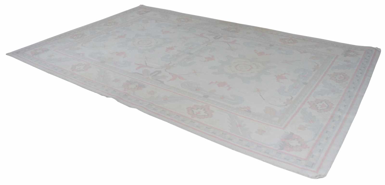 20th century southwestern area rug. Beige with pink and ligh blue geometric motif.