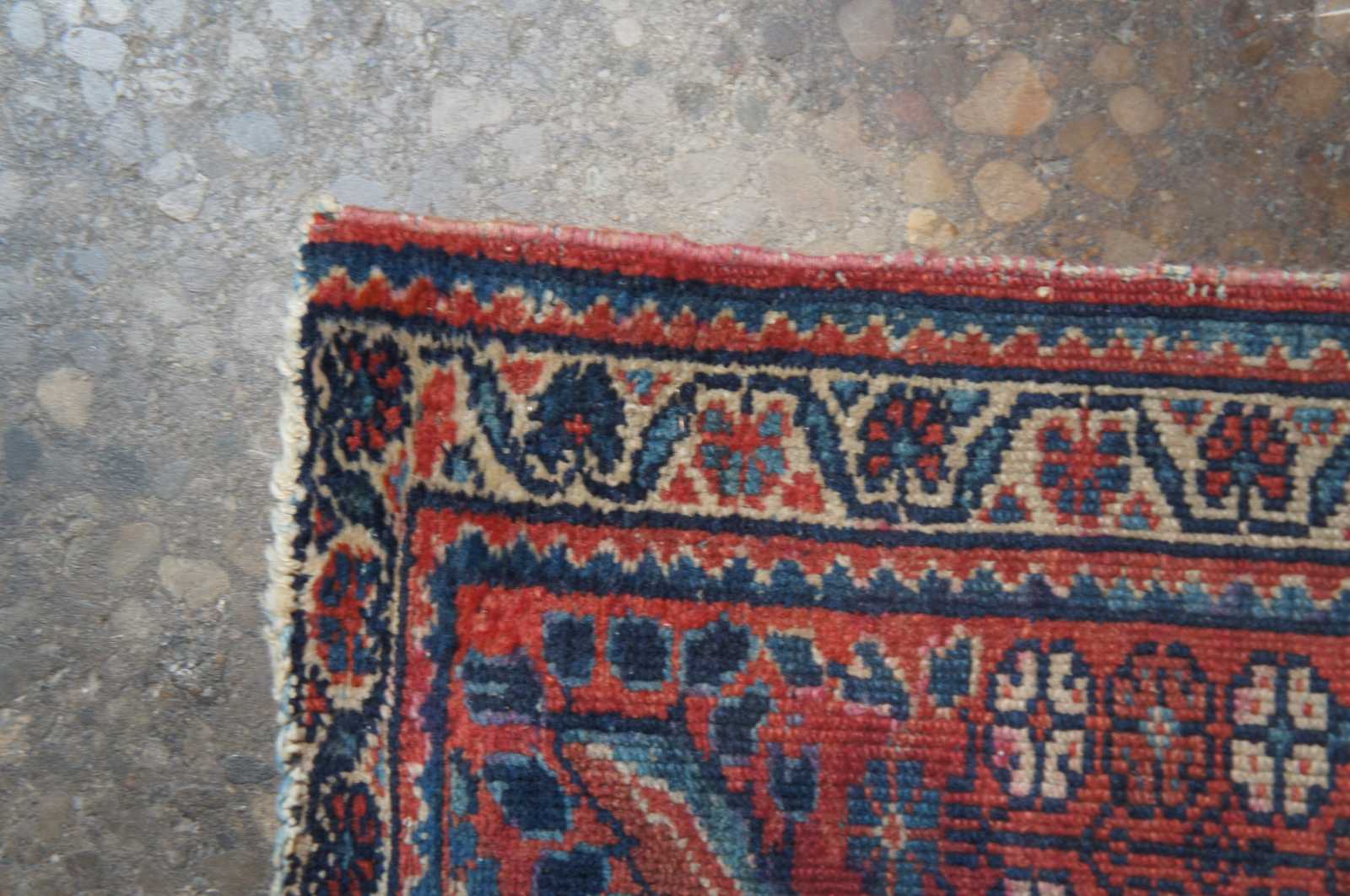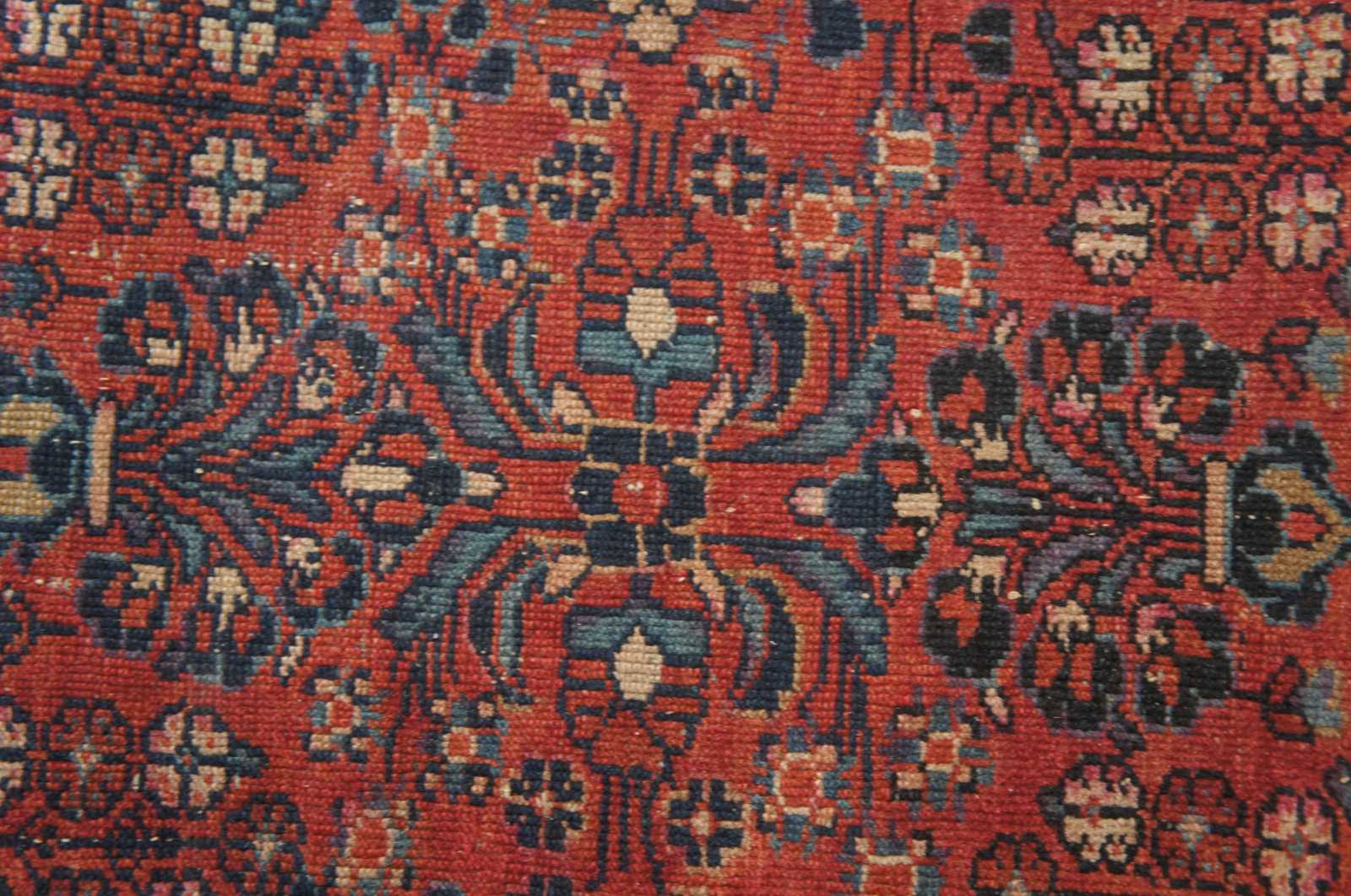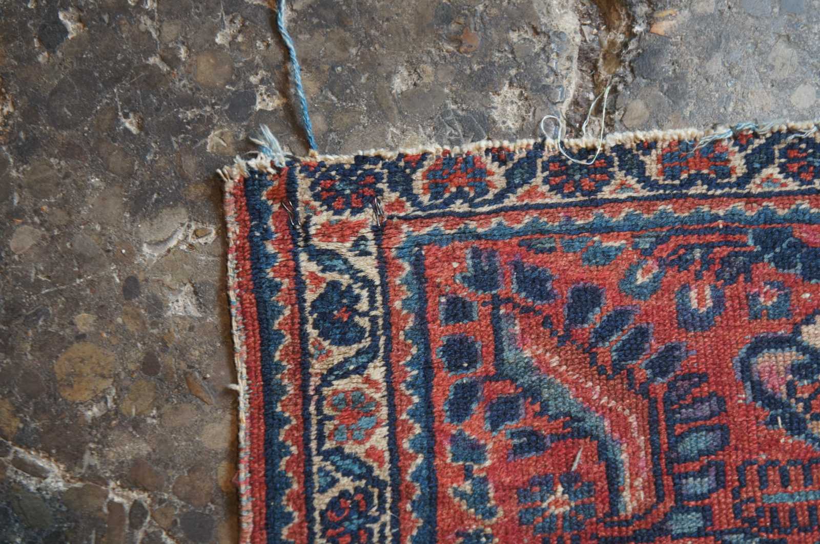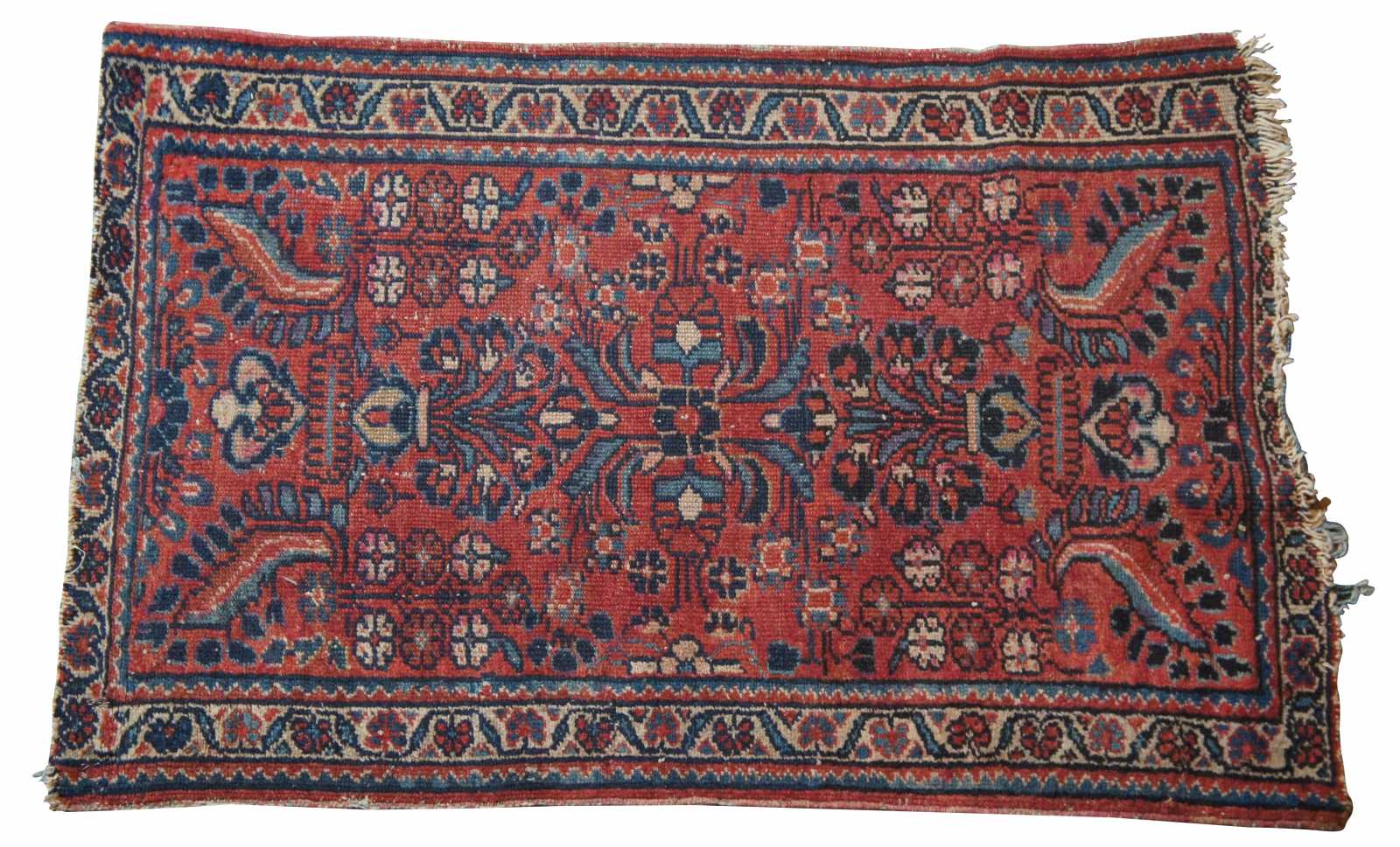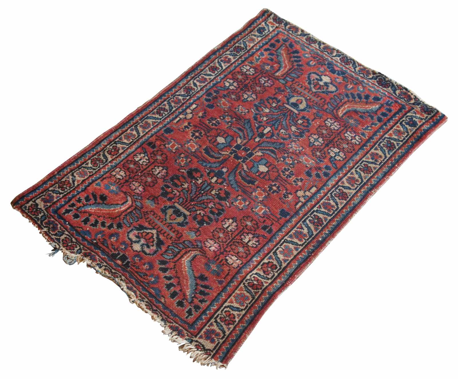 Antique Persian rug, carpet or mat featuring floral designs over a red field and tan border.