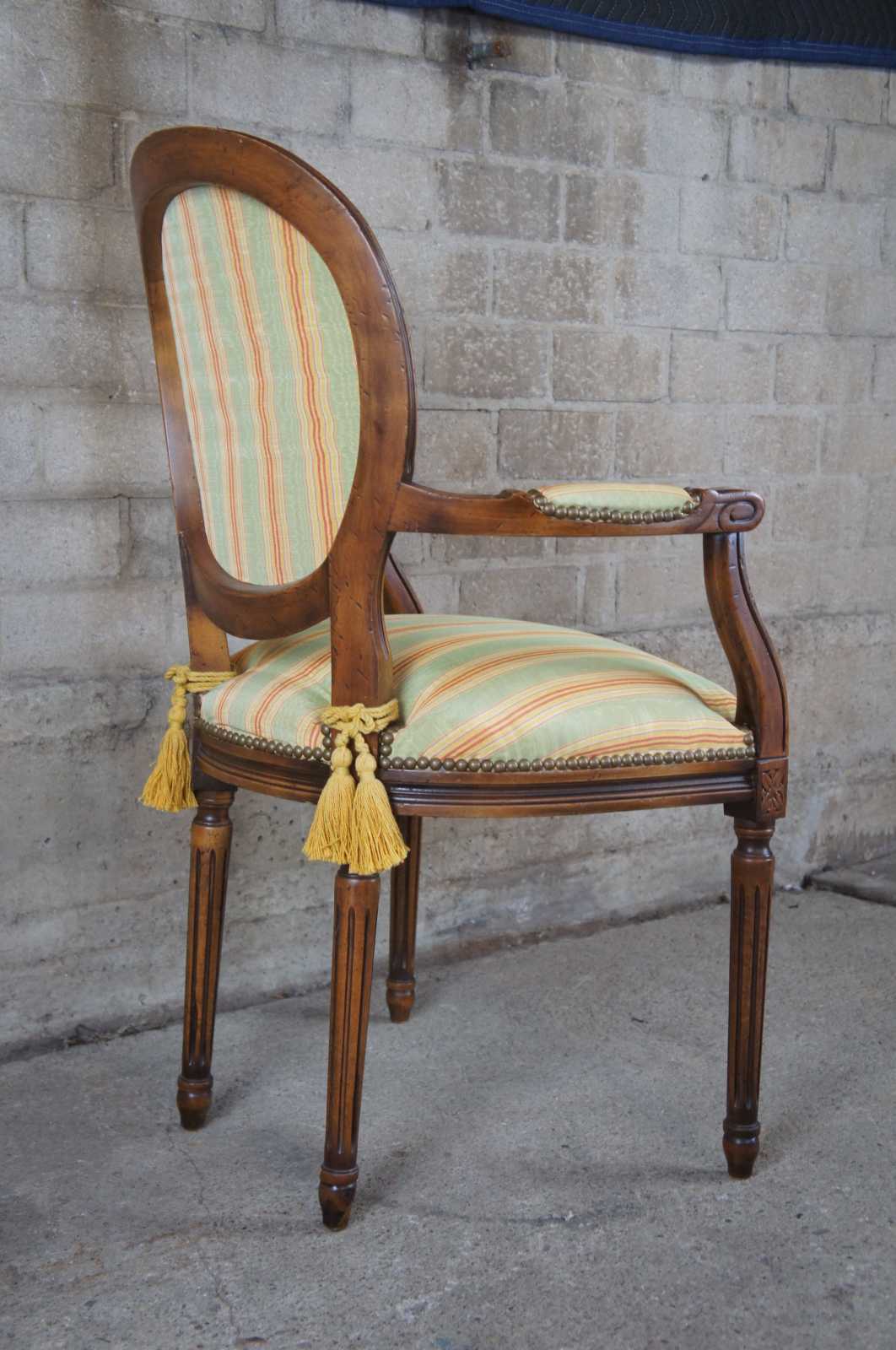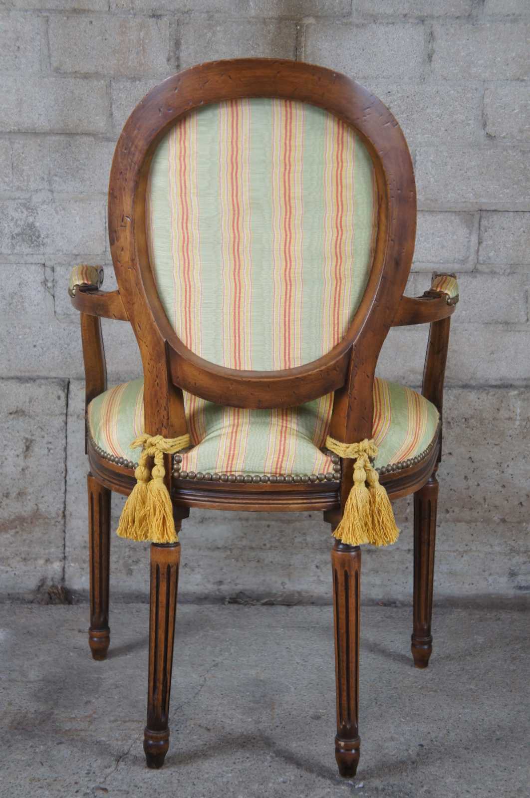 Italian made arm chair by Chateau D'AX. Walnut with padded arms, round back, striped upholstery, nailhead trim and tapered fluted legs. Marked along along underside.