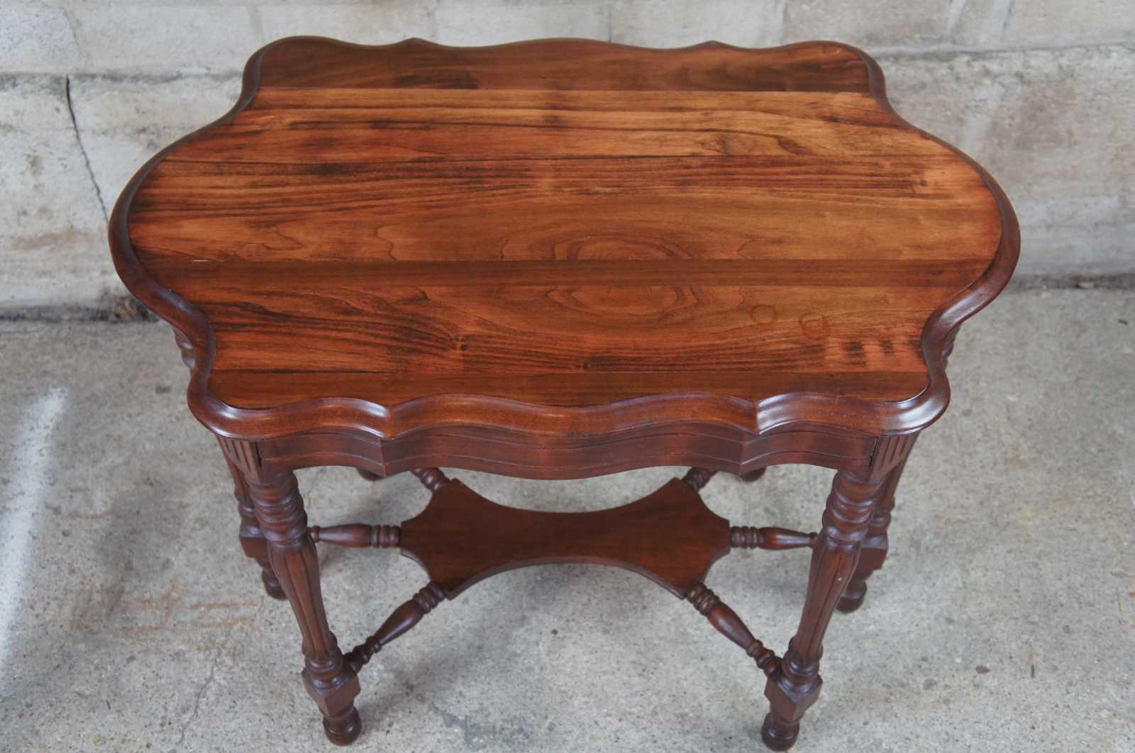 Vintage Jacobean turtle top side table. Made of walnut with scalloped shape with ogee edge. The table is supported by six turned legs tapering fluted legs connected by a turned stretcher and nubby feet.