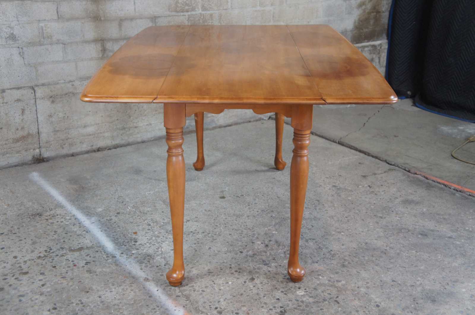 Circa 1980s American Country maple drop leaf dining table. Features two long large leaves on each side, and ogee edge and queen anne legs.