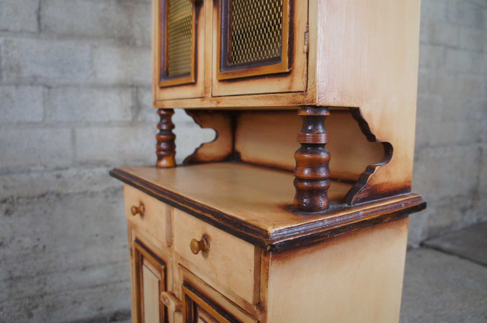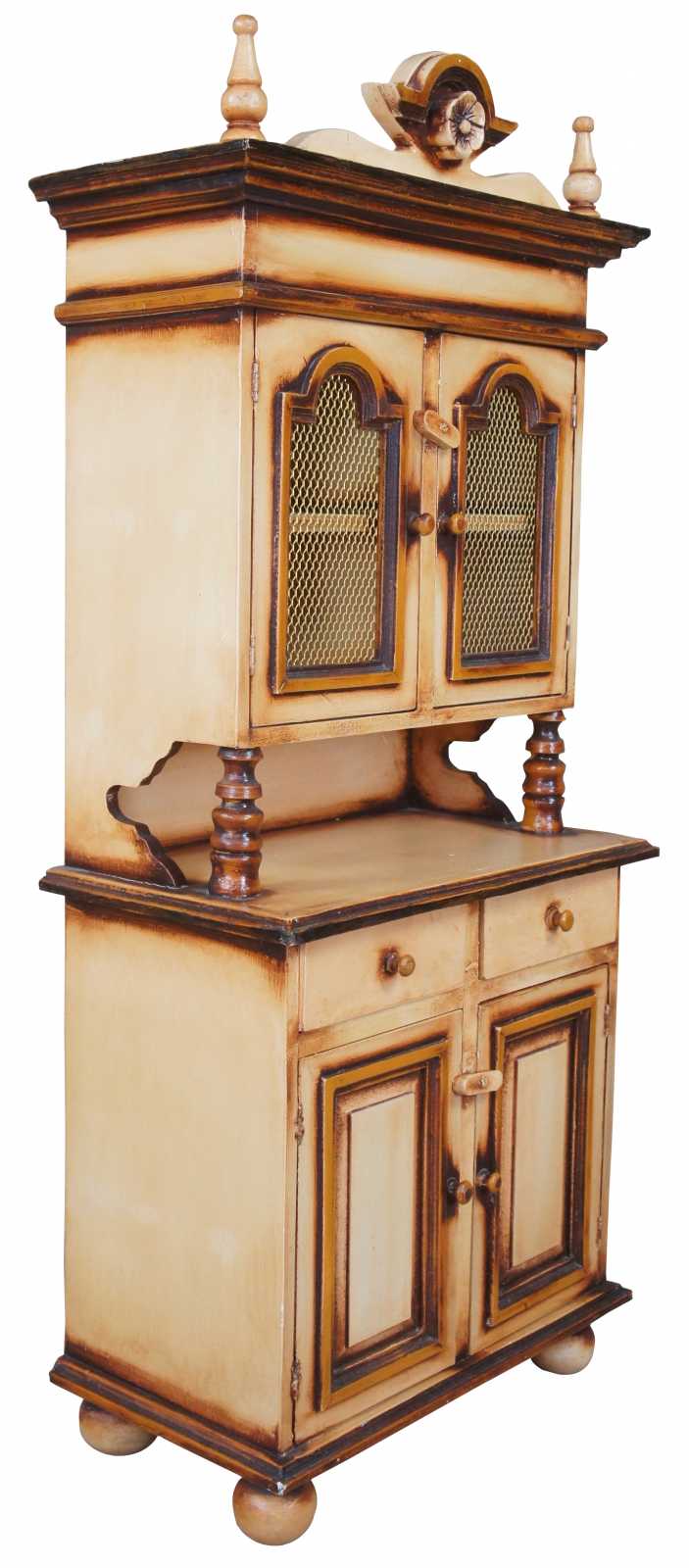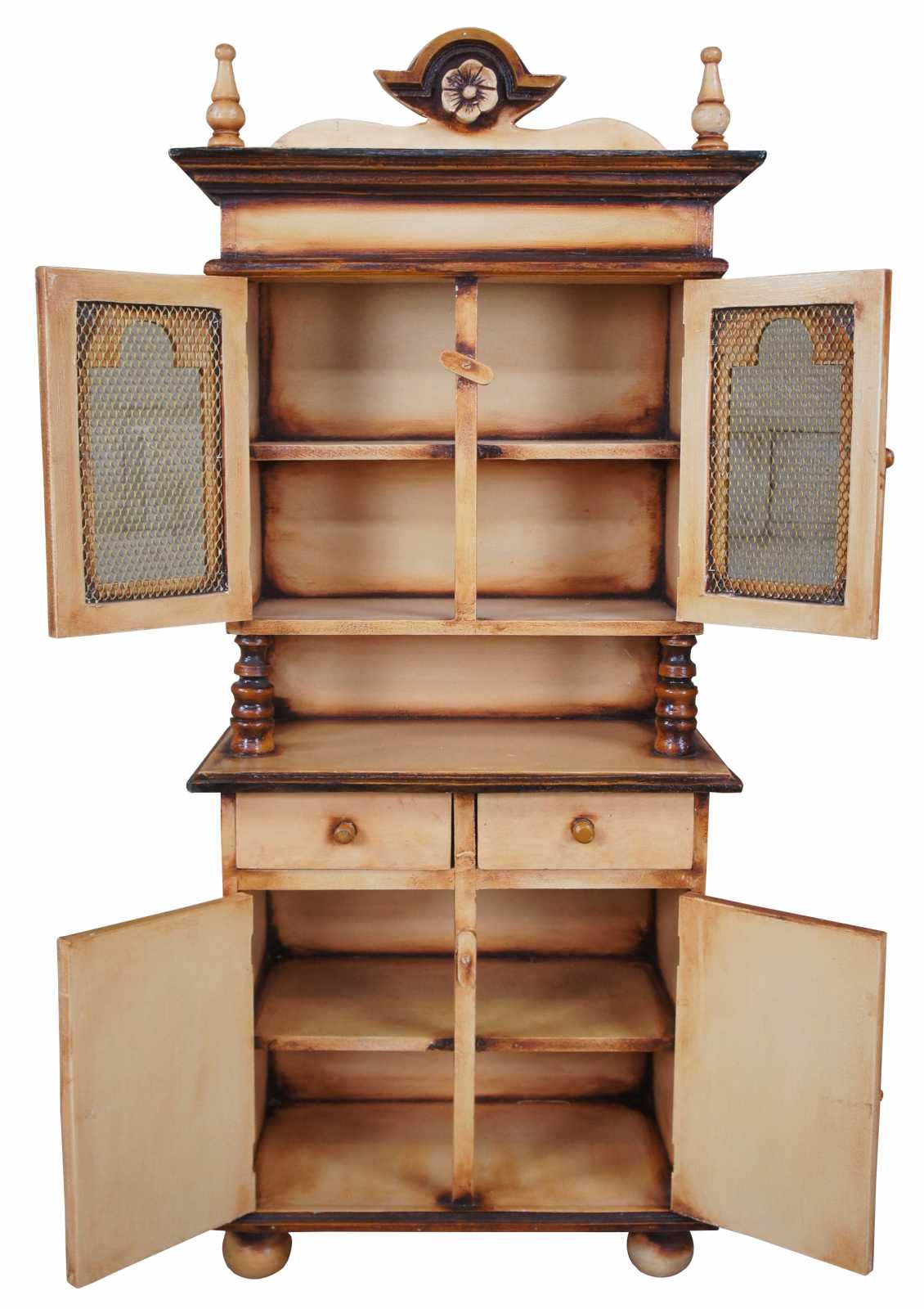 Antique miniature folk art stepback cupboard with wire mesh doors, turned supports and bun feet.