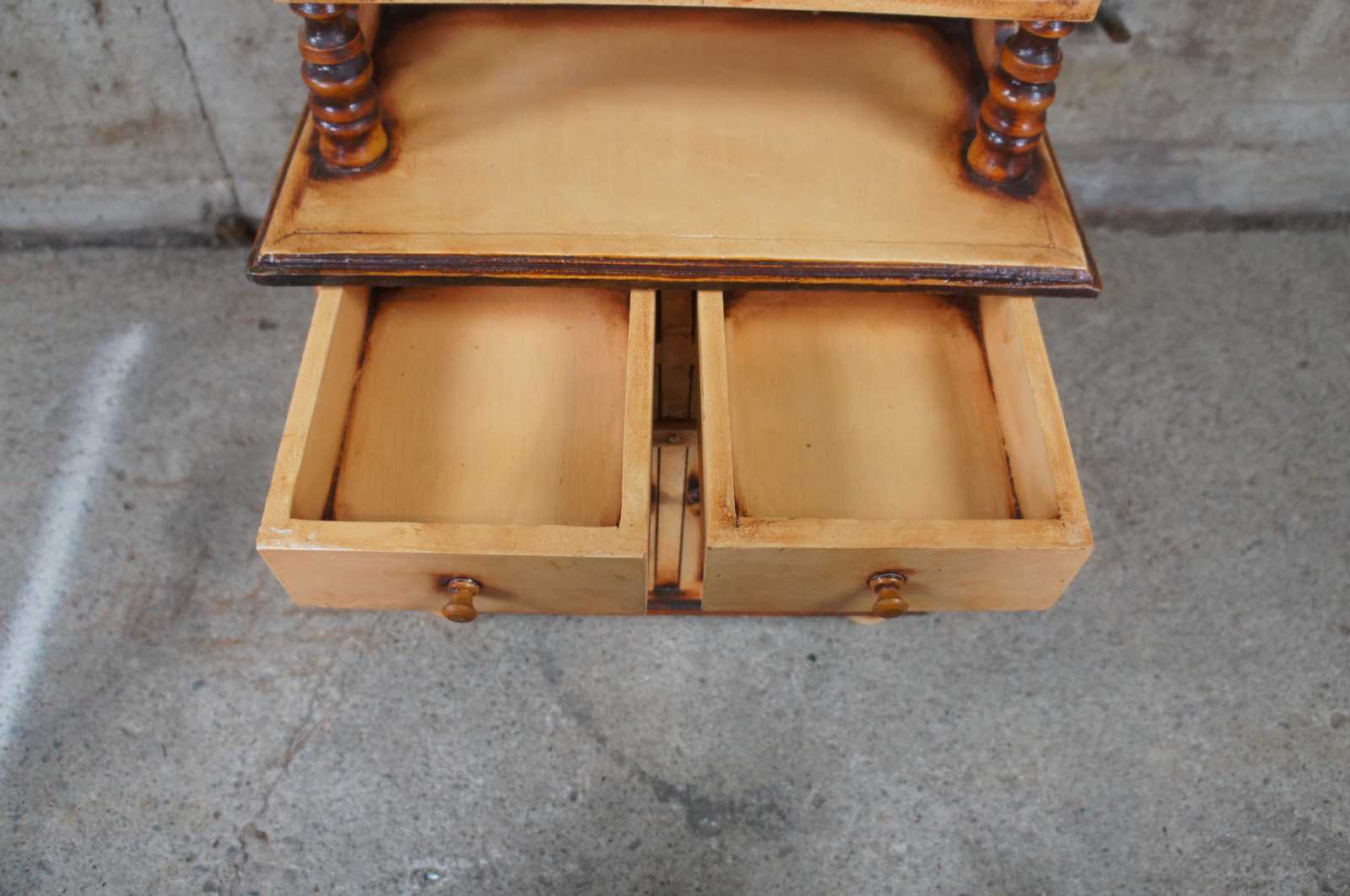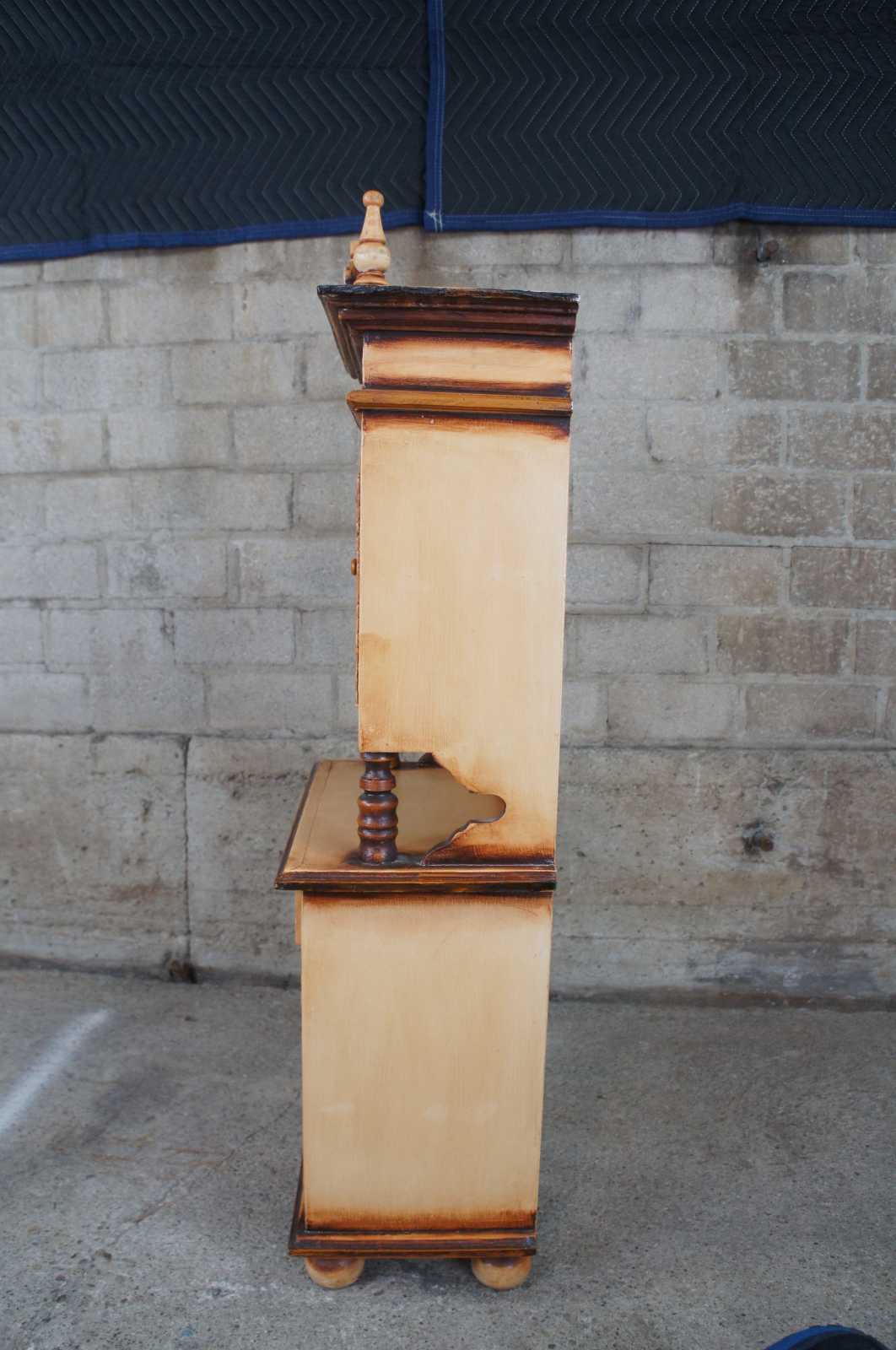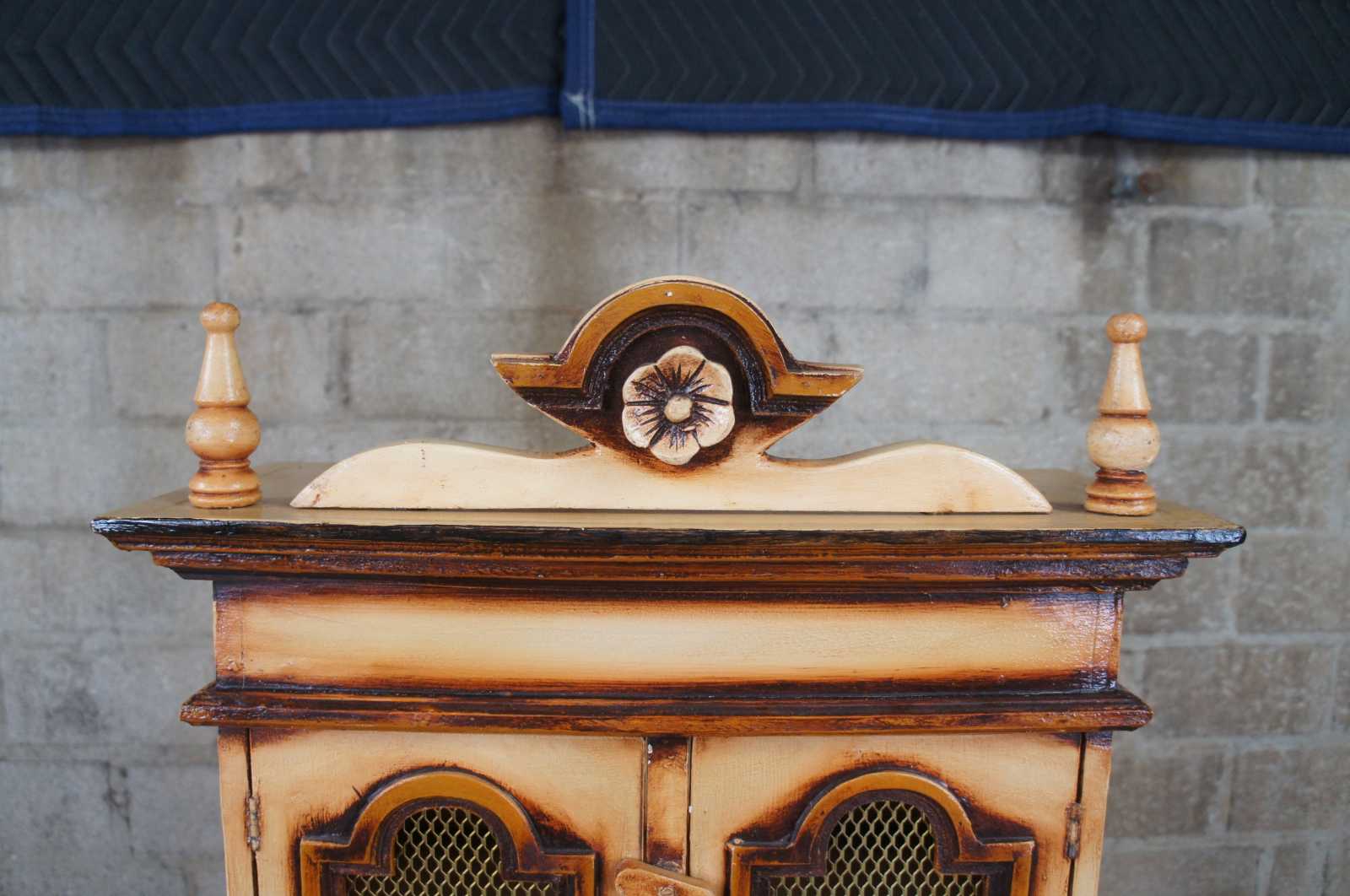 Antique miniature folk art stepback cupboard with wire mesh doors, turned supports and bun feet.