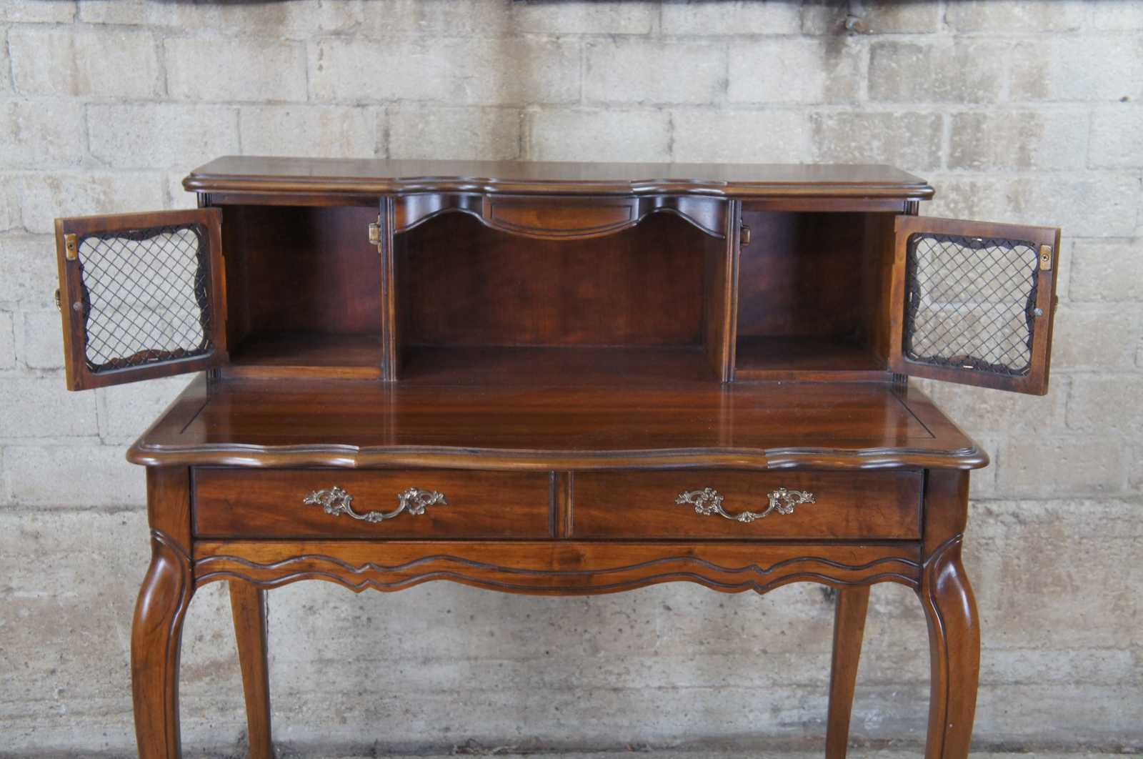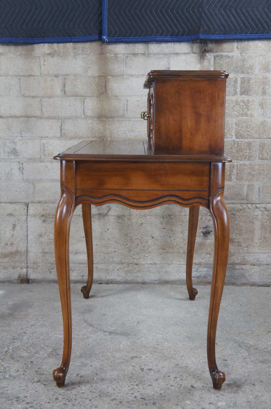Vintage Hammary Maisonette French Louis XV ladies writing desk. Made of fruitwood featuring a scalloped serpentine design with one drawer, two compartments over cabriole legs.