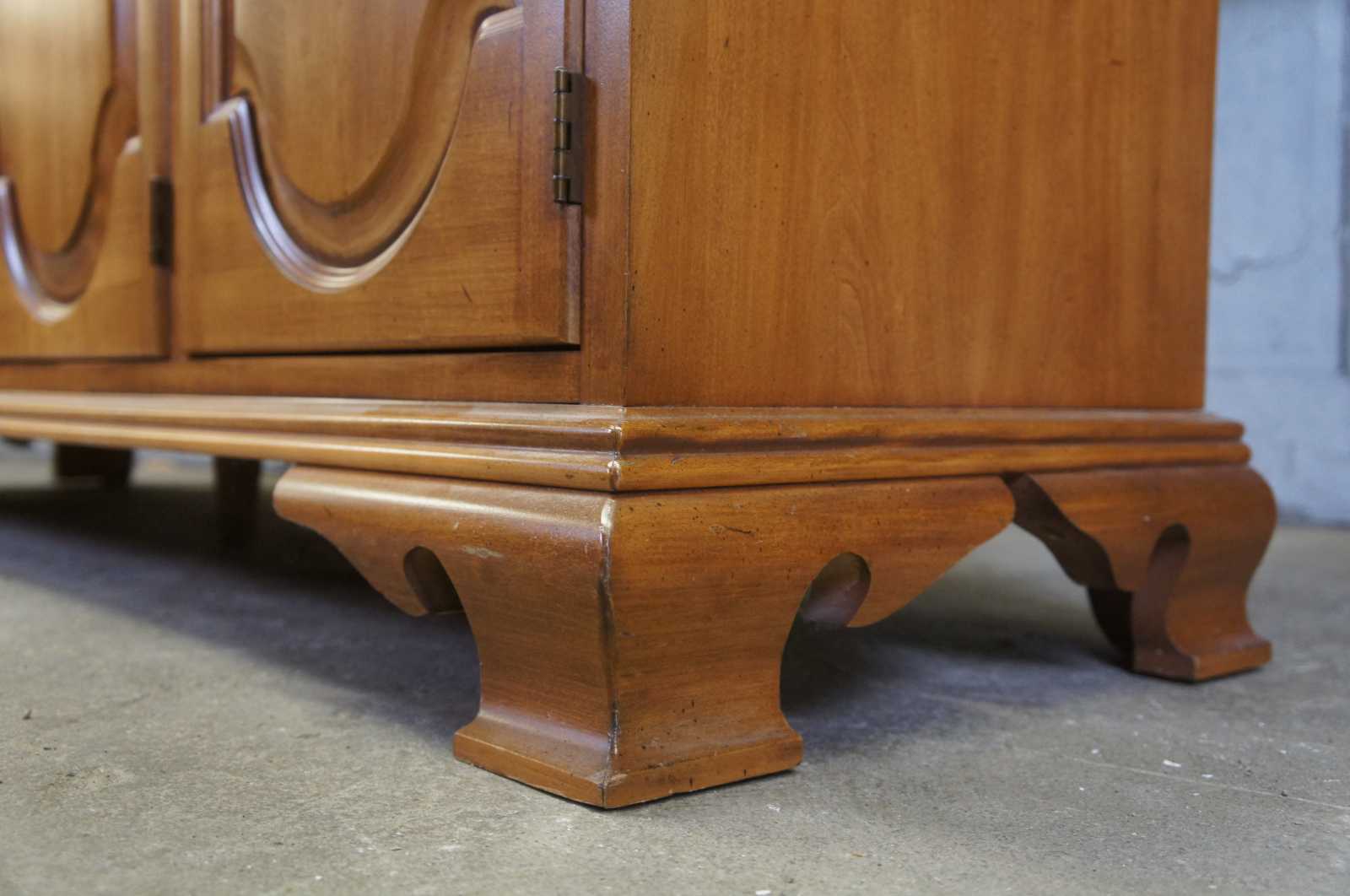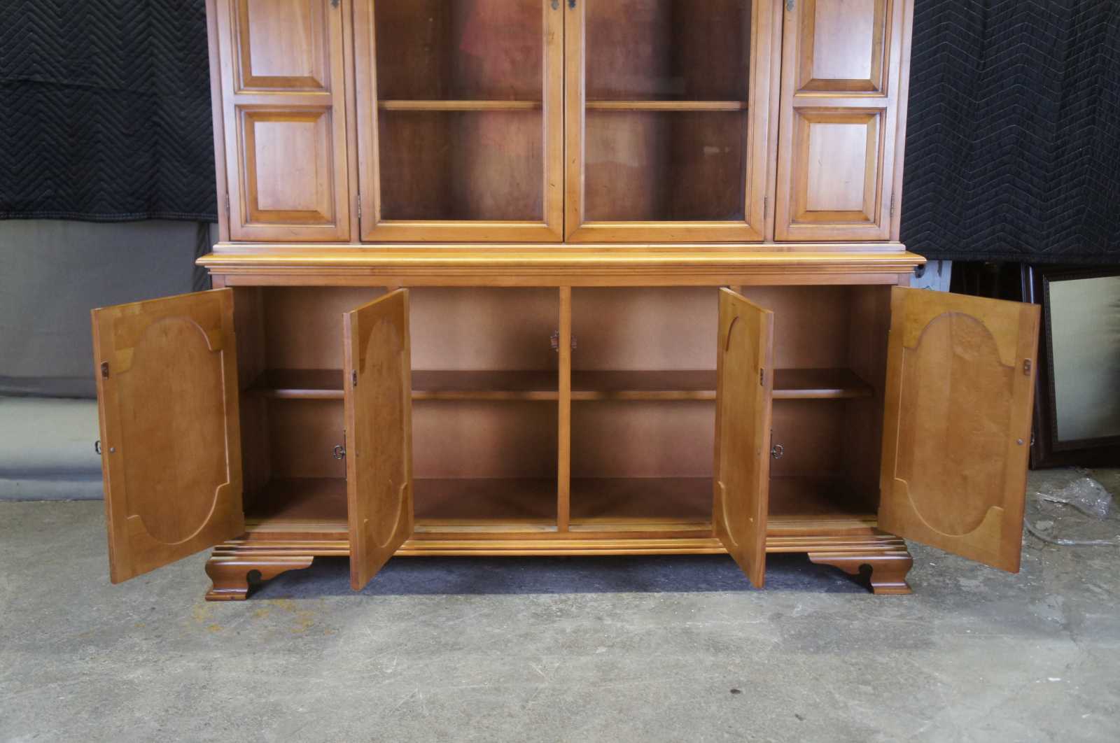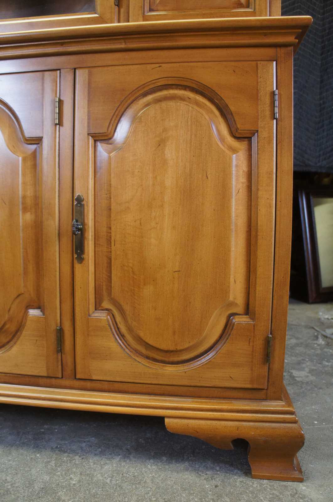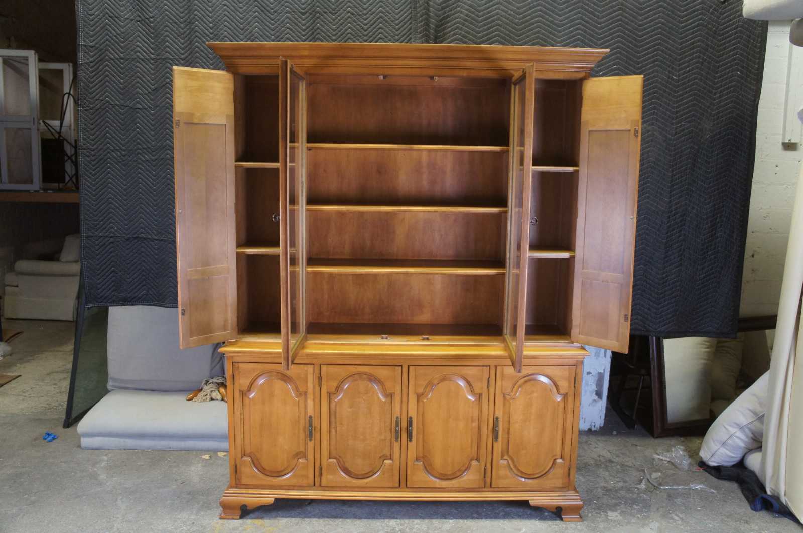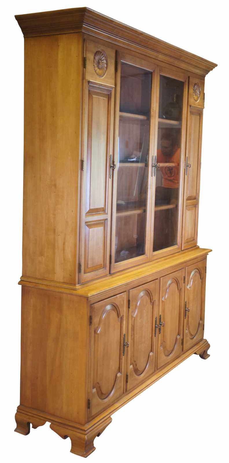 Circa 1970s Italian Provincial China Hutch. Made from walnut with a stepback top with 4 glass covered shelves. Features outer cabinet, lower storage, floral carvings and bracket feet.