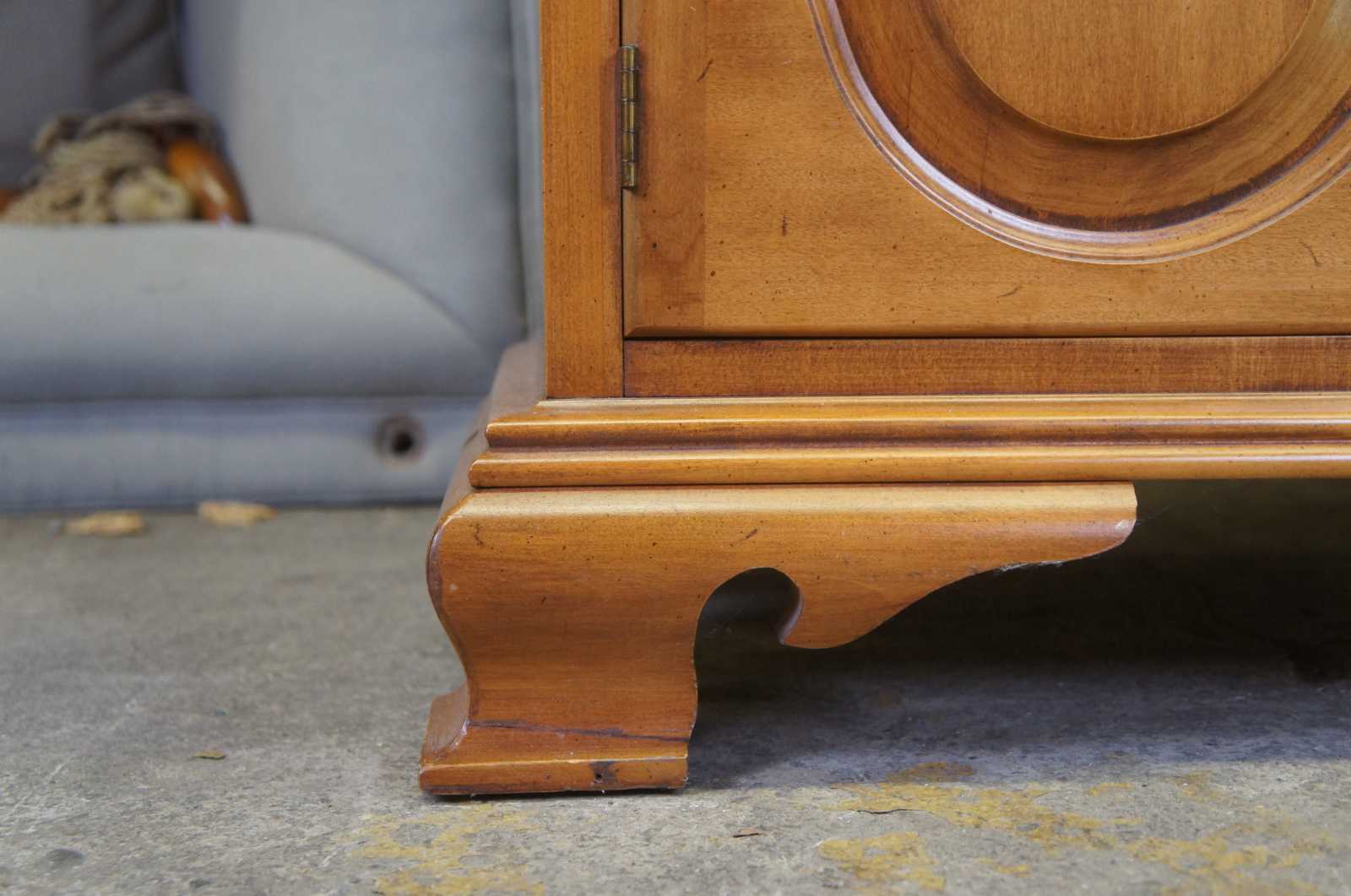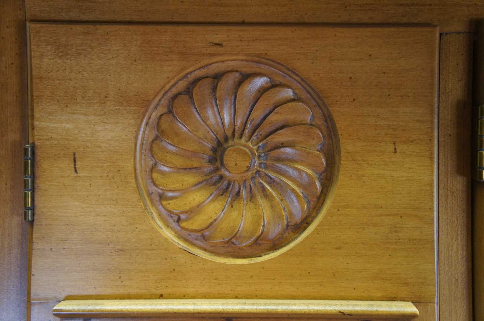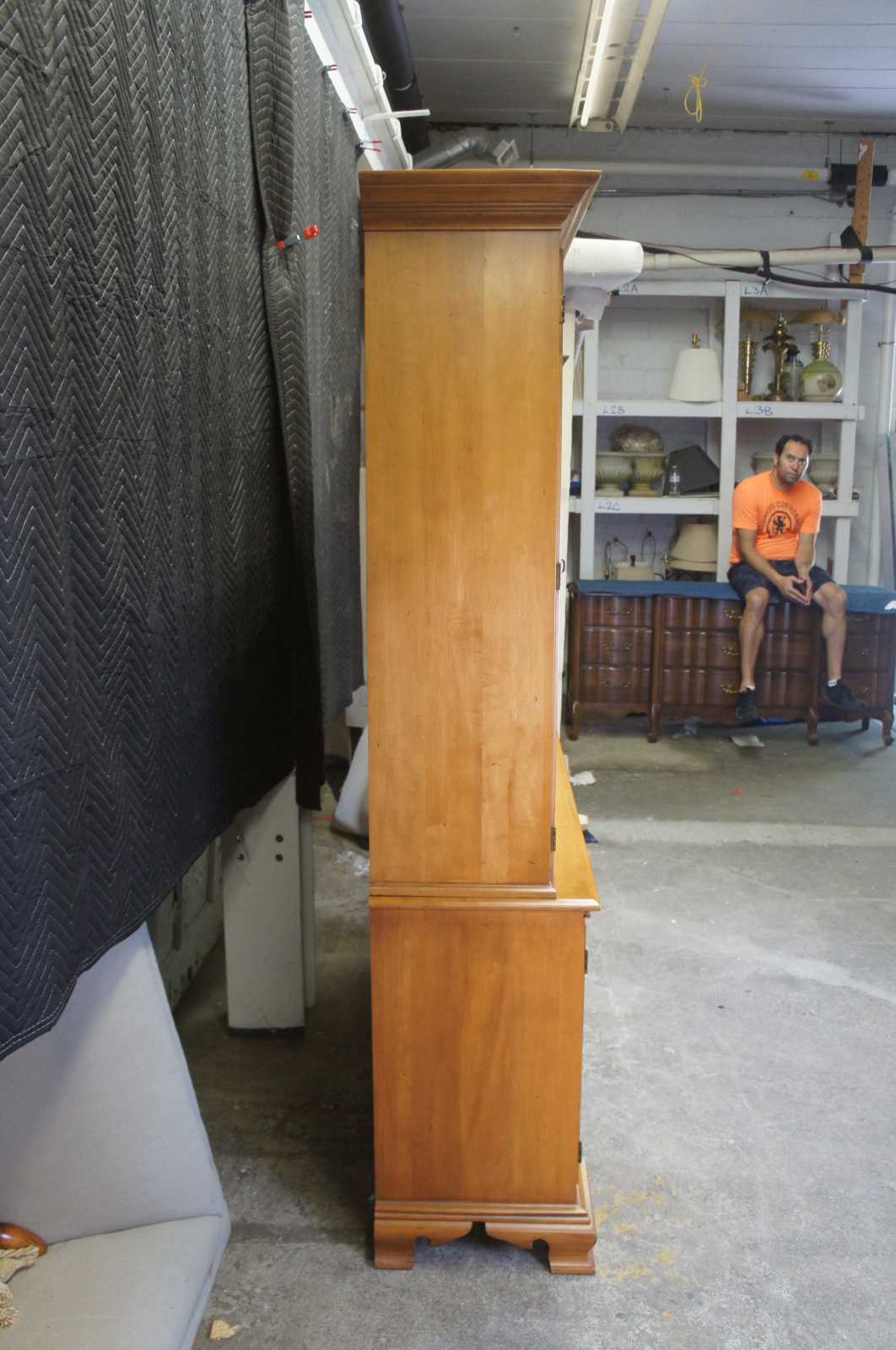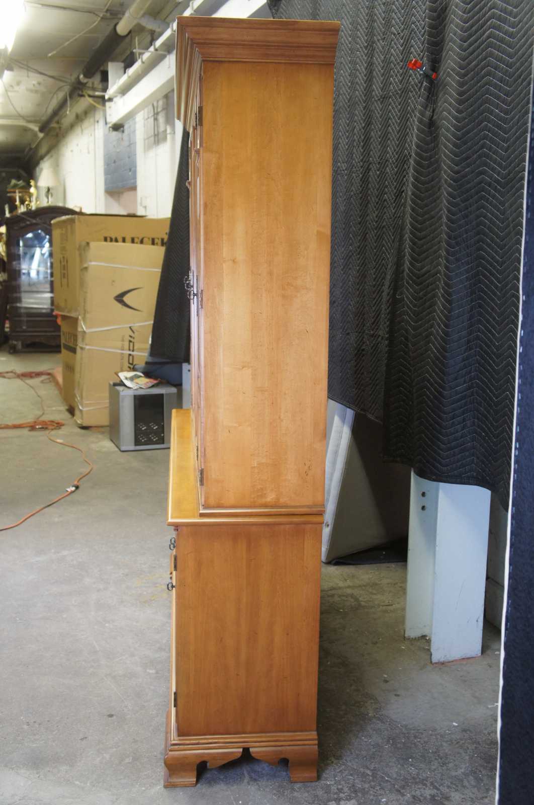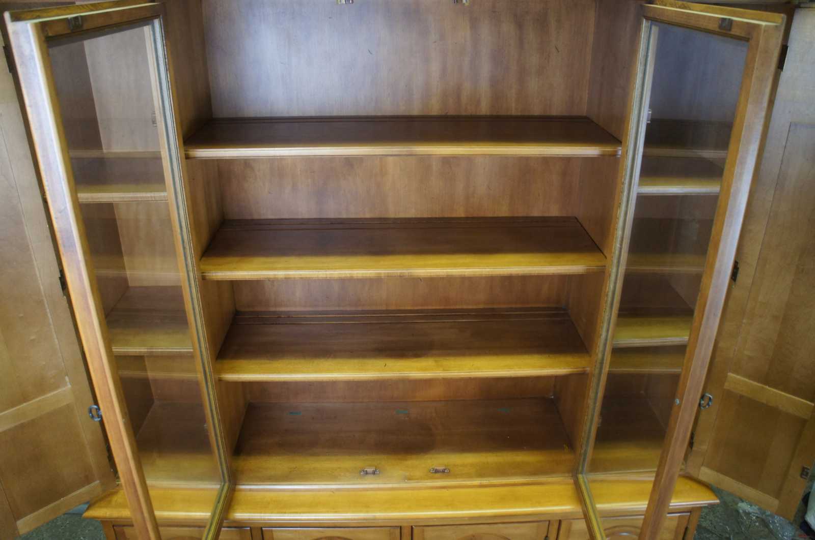 Circa 1970s Italian Provincial China Hutch. Made from walnut with a stepback top with 4 glass covered shelves. Features outer cabinet, lower storage, floral carvings and bracket feet.