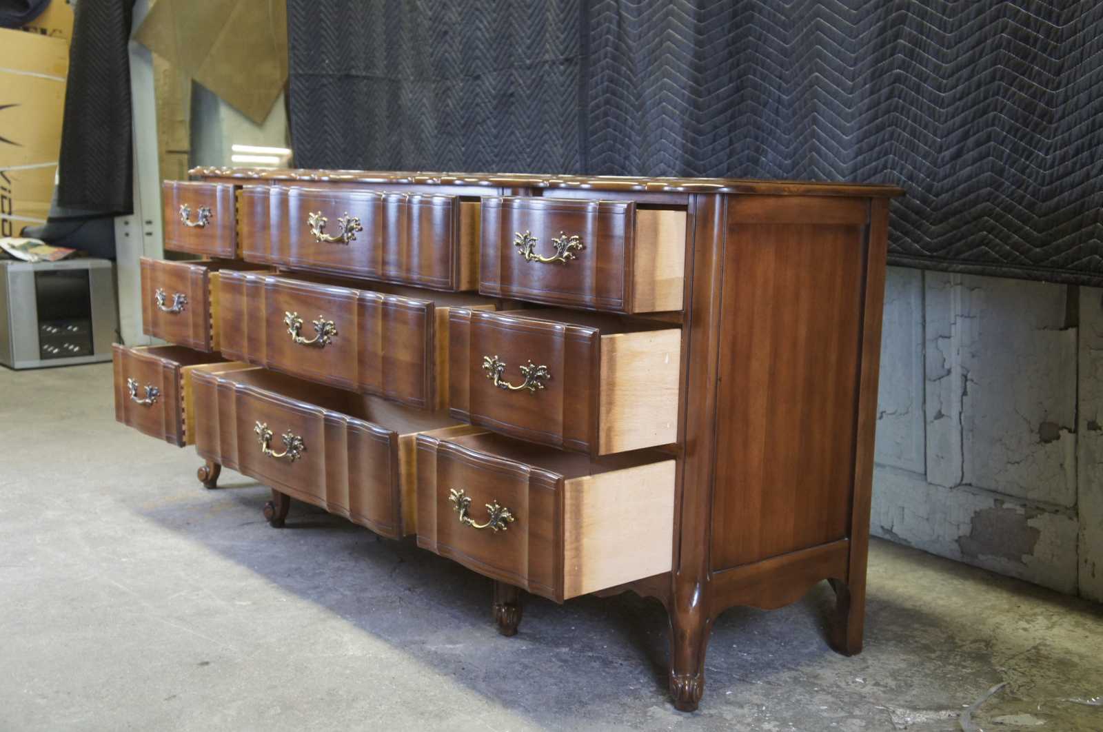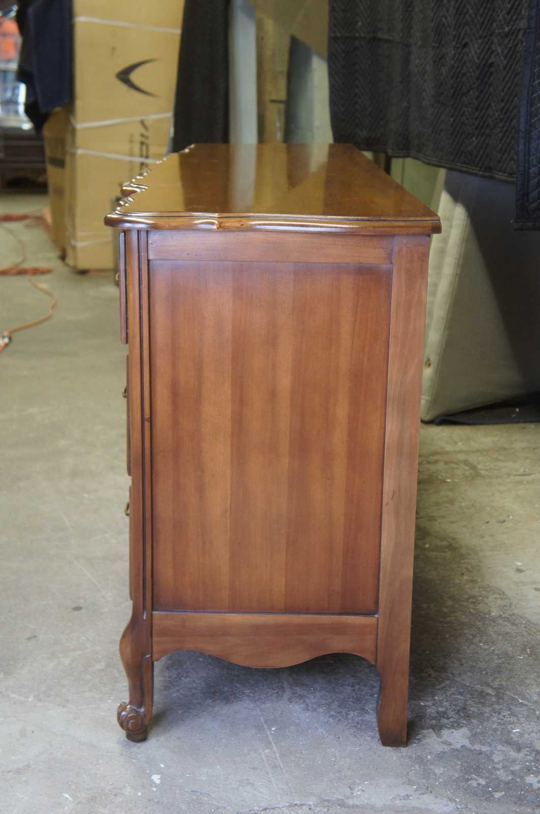 Vintage dresser by Kent Coffey. From the Marqee French collection, featuring French Provincial styling with scalloped / serpentine top over nine drawers and scrolled cabriole feet.