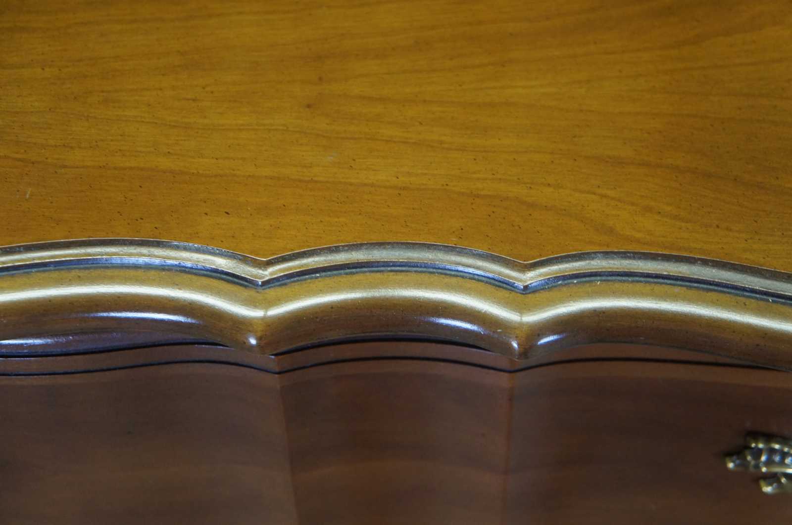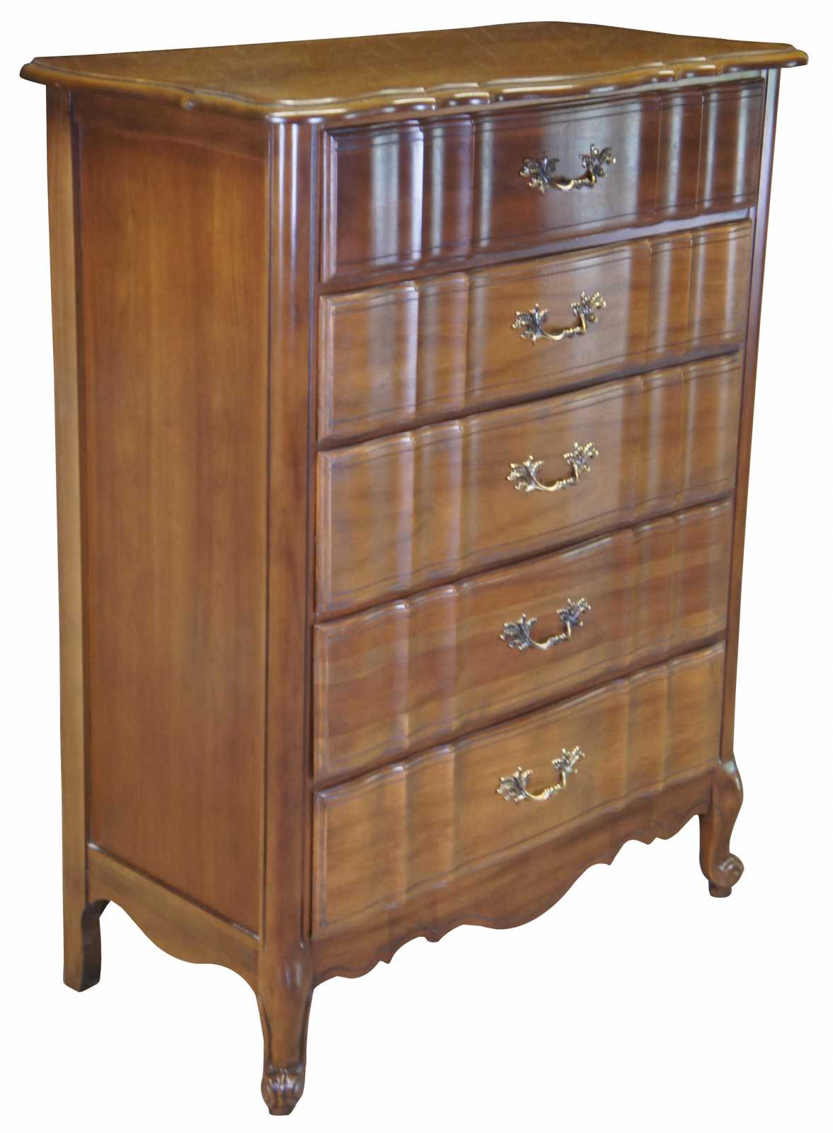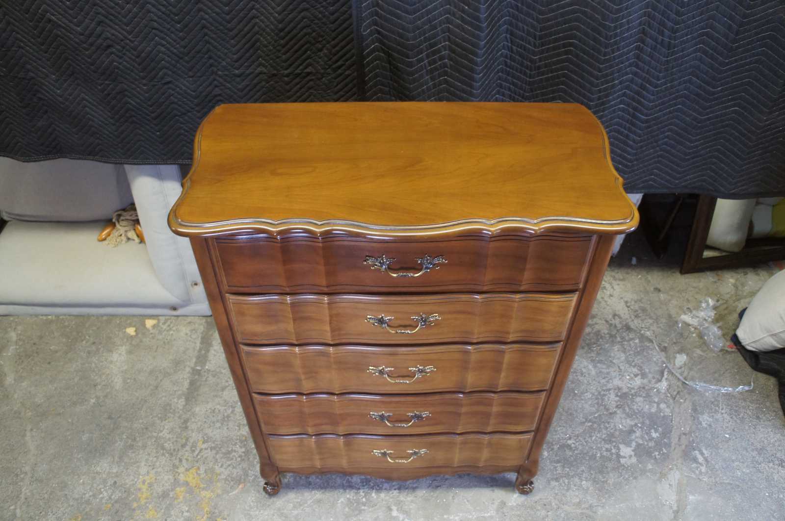 Vintage fruitwood chest or dresser by Kent Coffey. From the Marqee French collection, featuring French Provincial styling with scalloped / serpentine top over five drawers and scrolled cabriole feet. 300-140