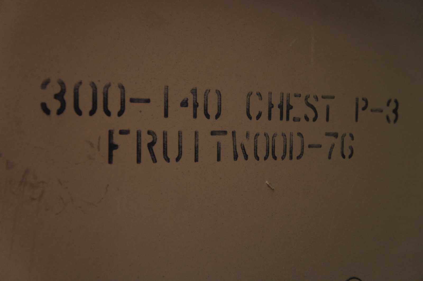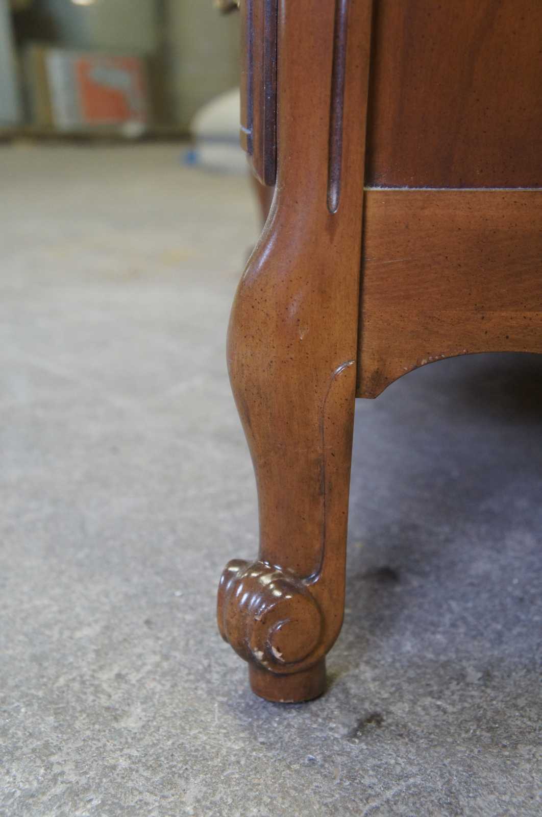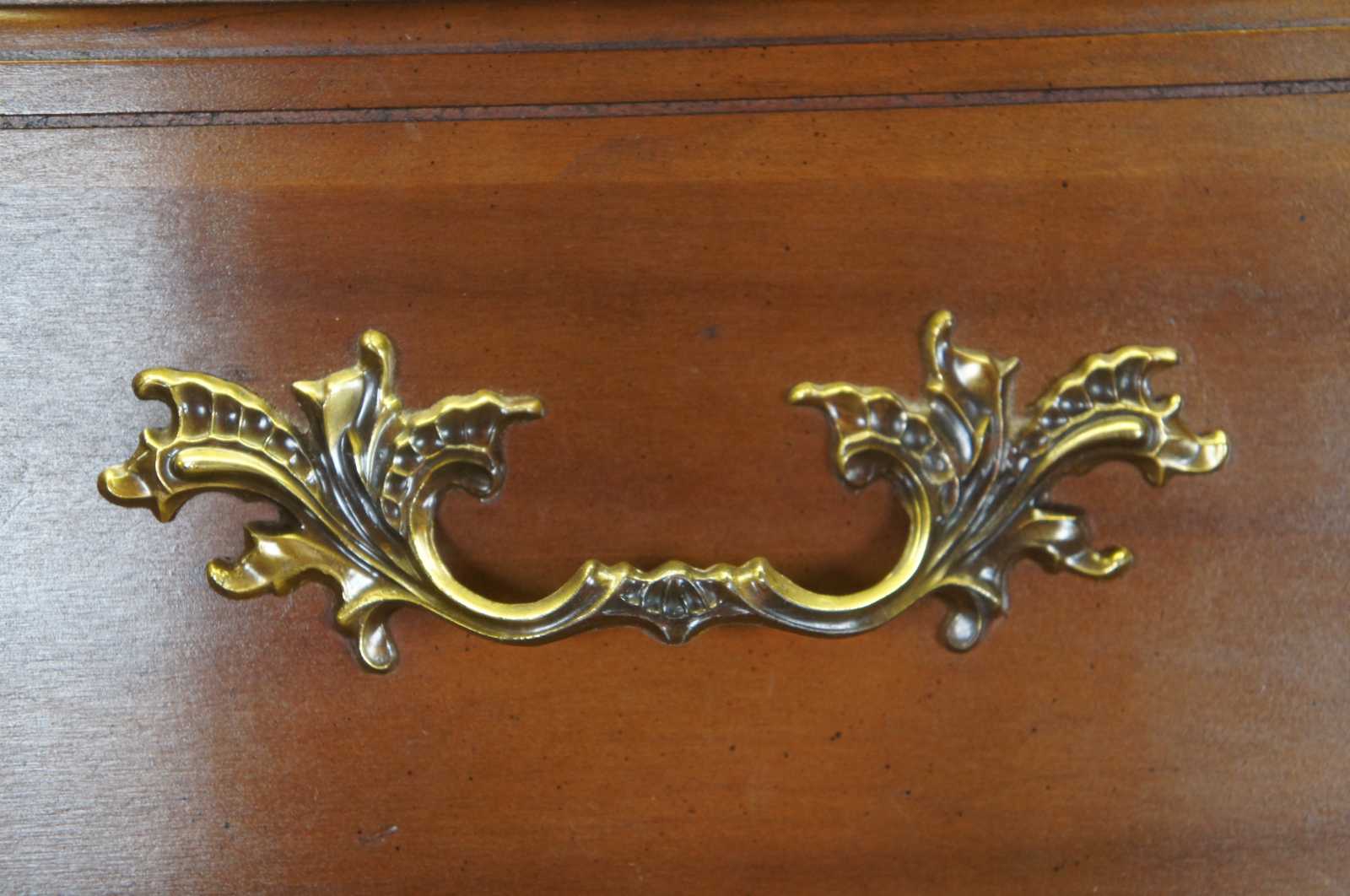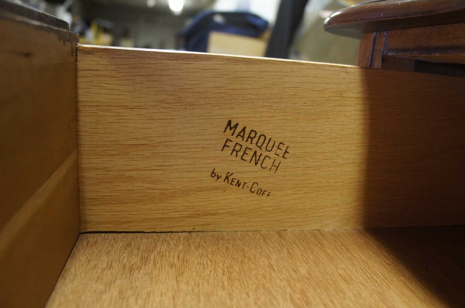 Vintage fruitwood chest or dresser by Kent Coffey. From the Marqee French collection, featuring French Provincial styling with scalloped / serpentine top over five drawers and scrolled cabriole feet. 300-140