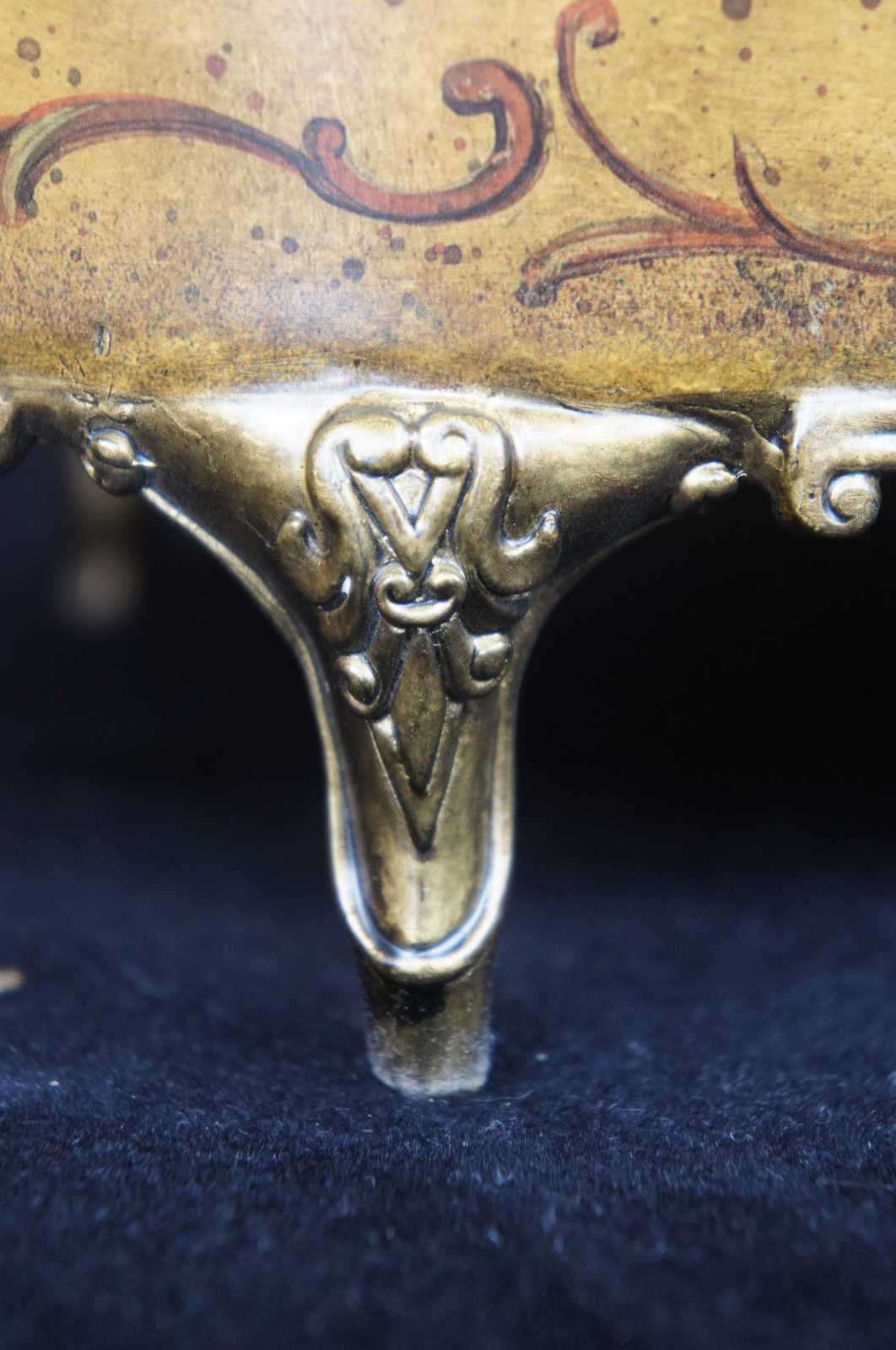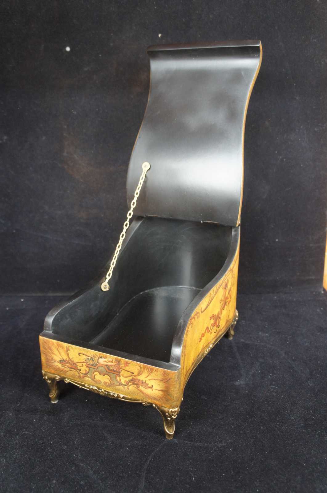 Vintage keepsake jewelry box in the form of a French chaise lounge featuring ornate painted neoclassical motif of cherubs and a landscape with a man playing an instrument to his female companion.
