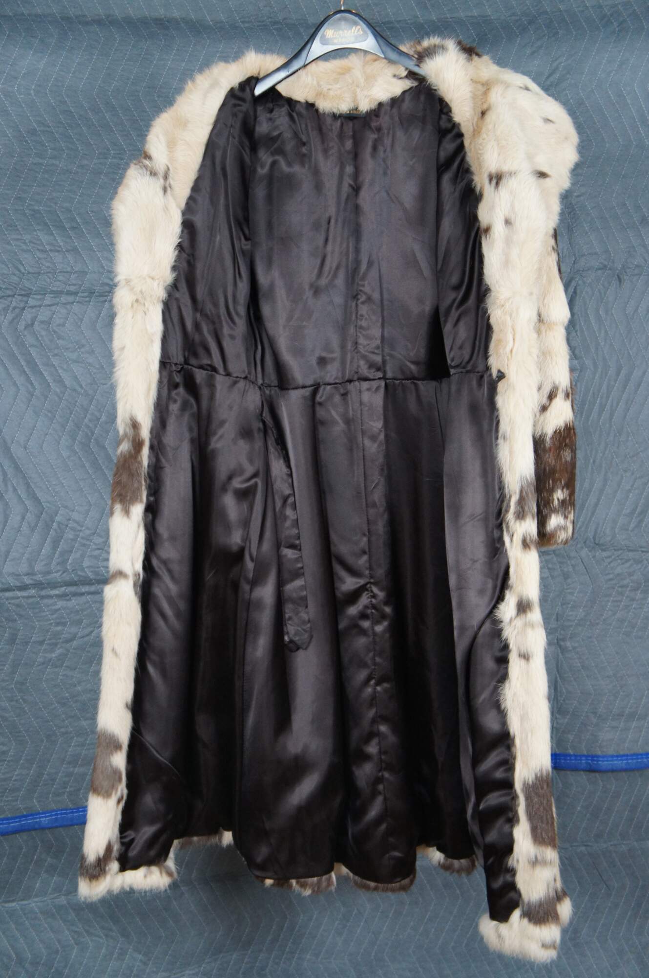 Vintage mid to late 20th century womens, full length, brown and white spotted cow hide fur coat, with leather belt and side pocket edges, and acetate satin lining. Made in Korea.