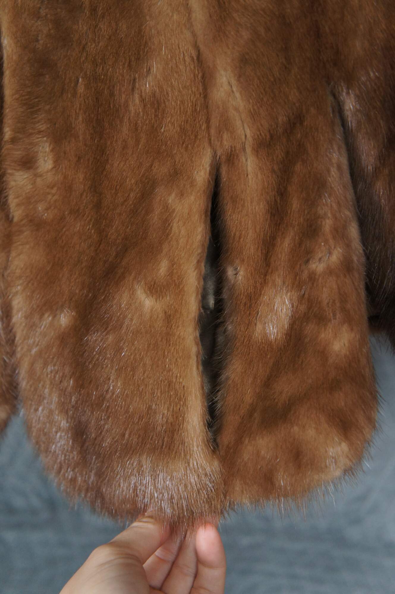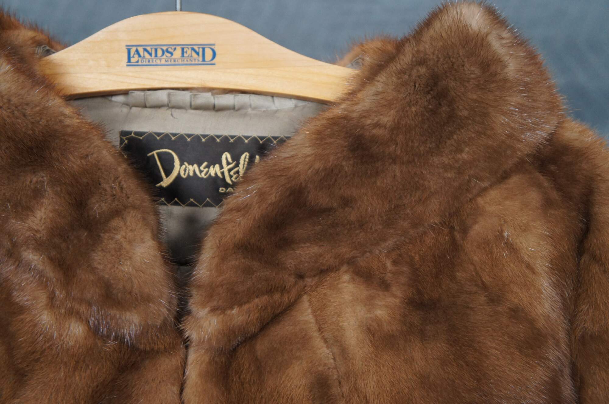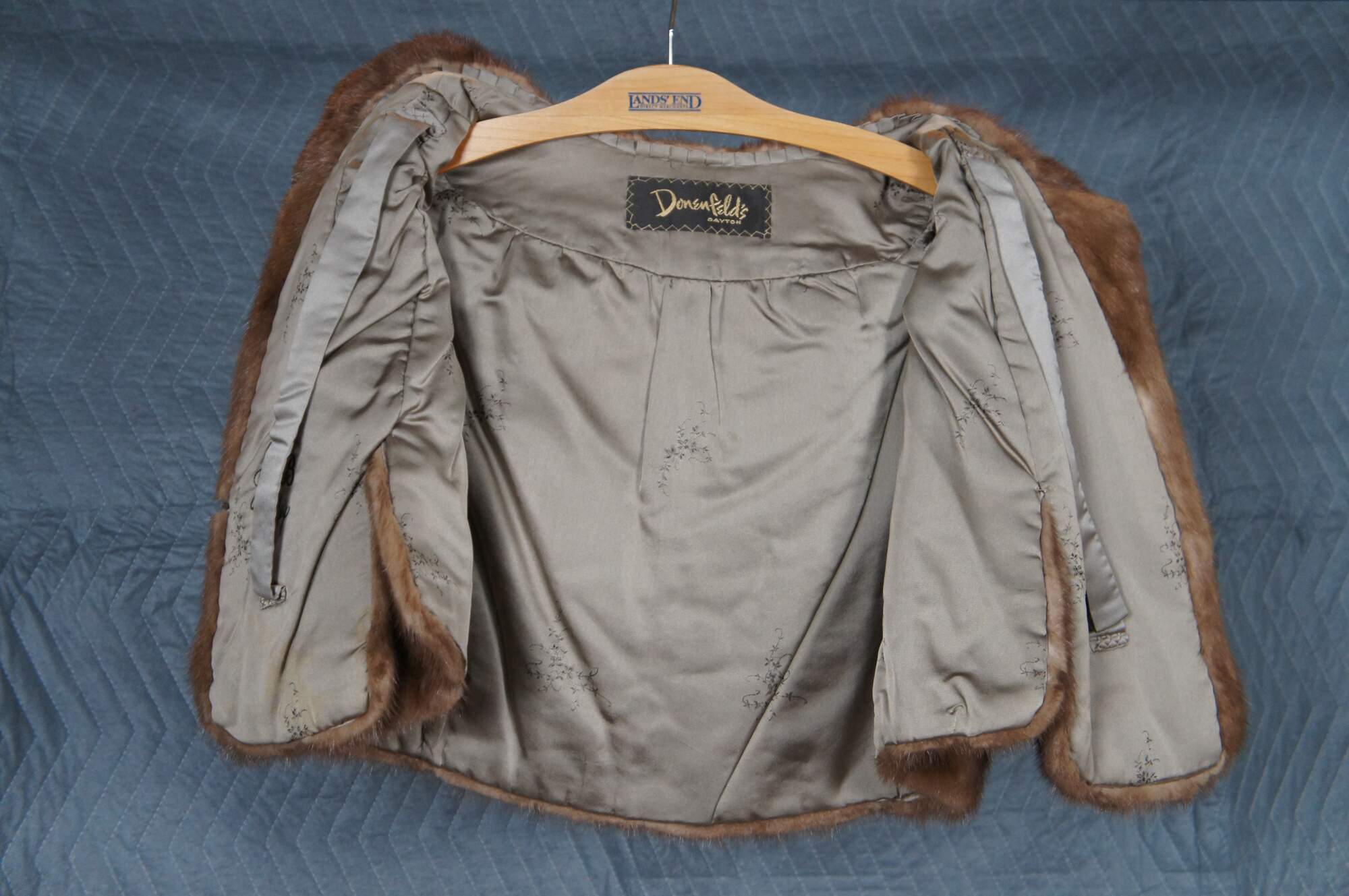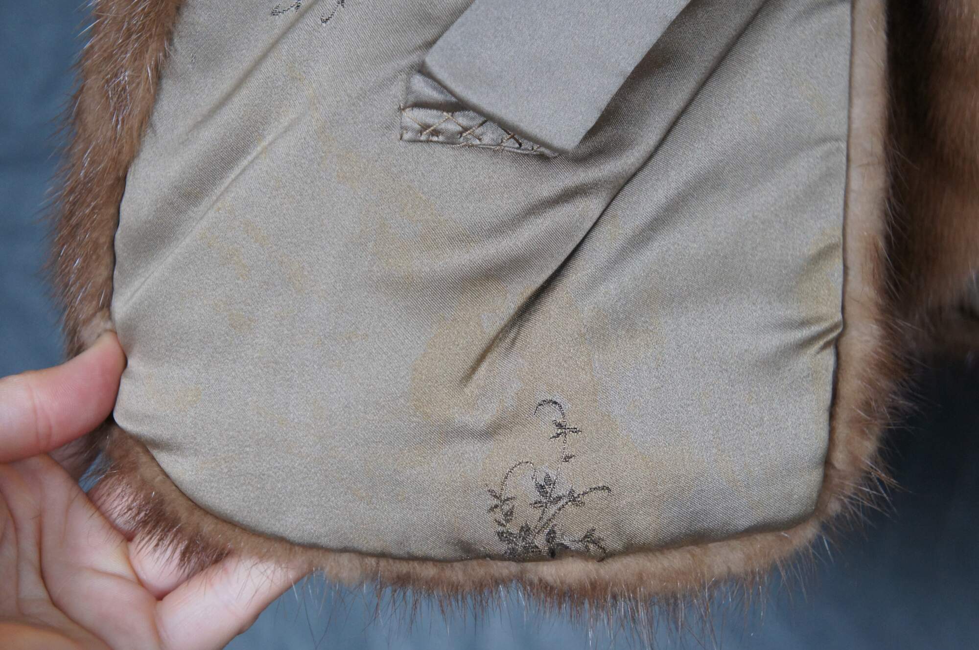 Vintage mid century medium brown mink fur wrap / cape from Donenfelds of Dayton, OH, featuring a floral silk lining with shoulder straps, hook and loop closure, and two pockets on the front. Personalized with the name Janice B Schooley.