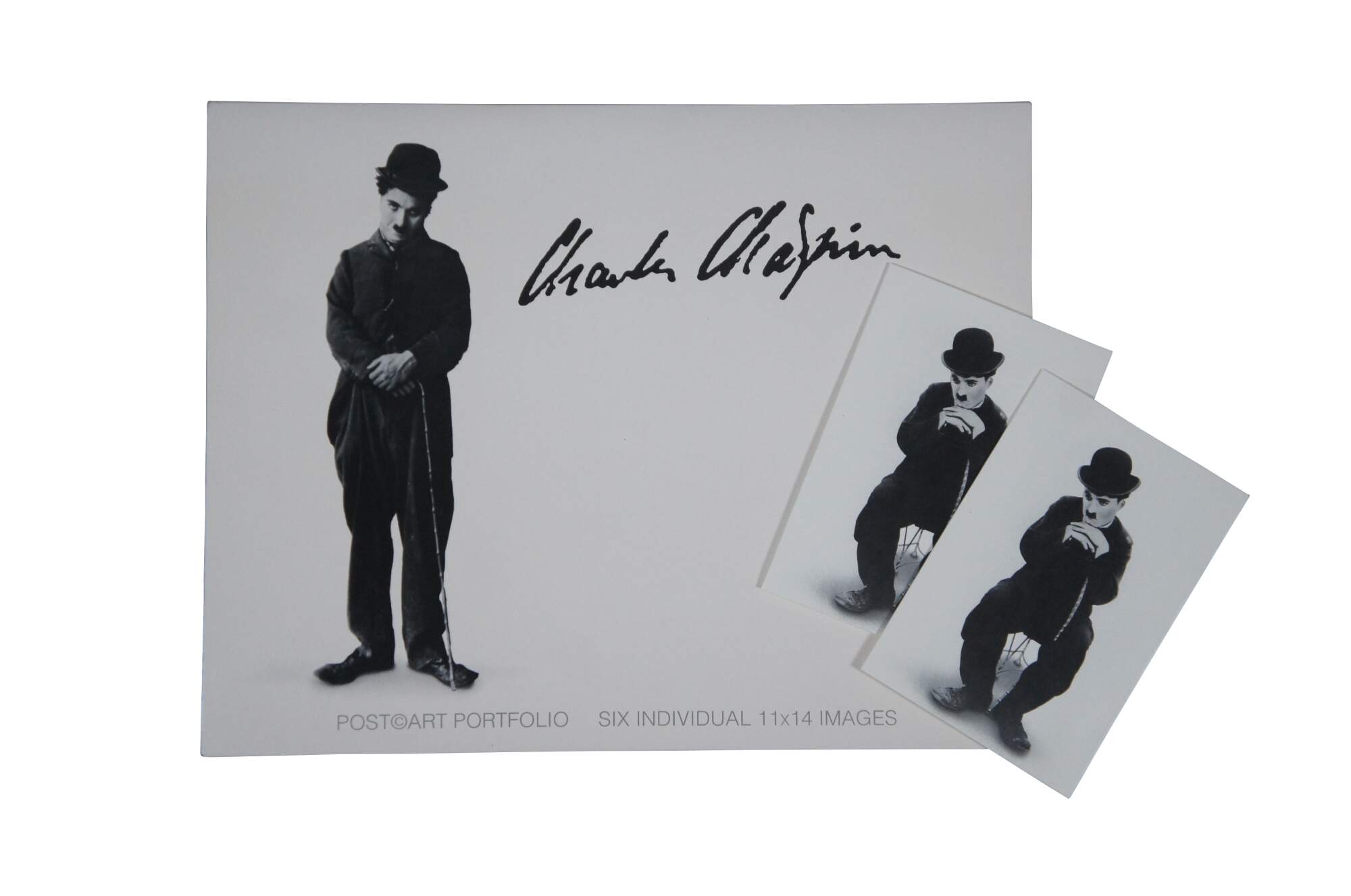 Vintage Charlie Chaplin "Postcart Portfolio" containing six individual 11x14 black and white photographic prints of Chaplin, printed on the back for use as oversized postcards. Includes original cover sleeve. Also included are two photo notecars with blank interior. Published by Classico San Francisco, Inc, 1992.