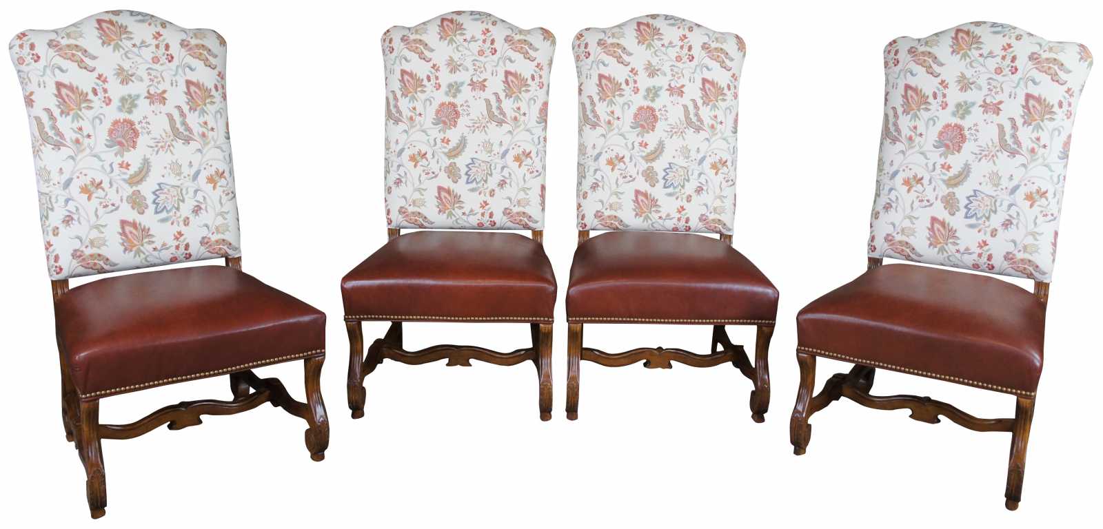 Four Century Furniture old world tuscan side dining chairs. Made of maple with paisley upholstered back and leather seat accented with nailhead trim.